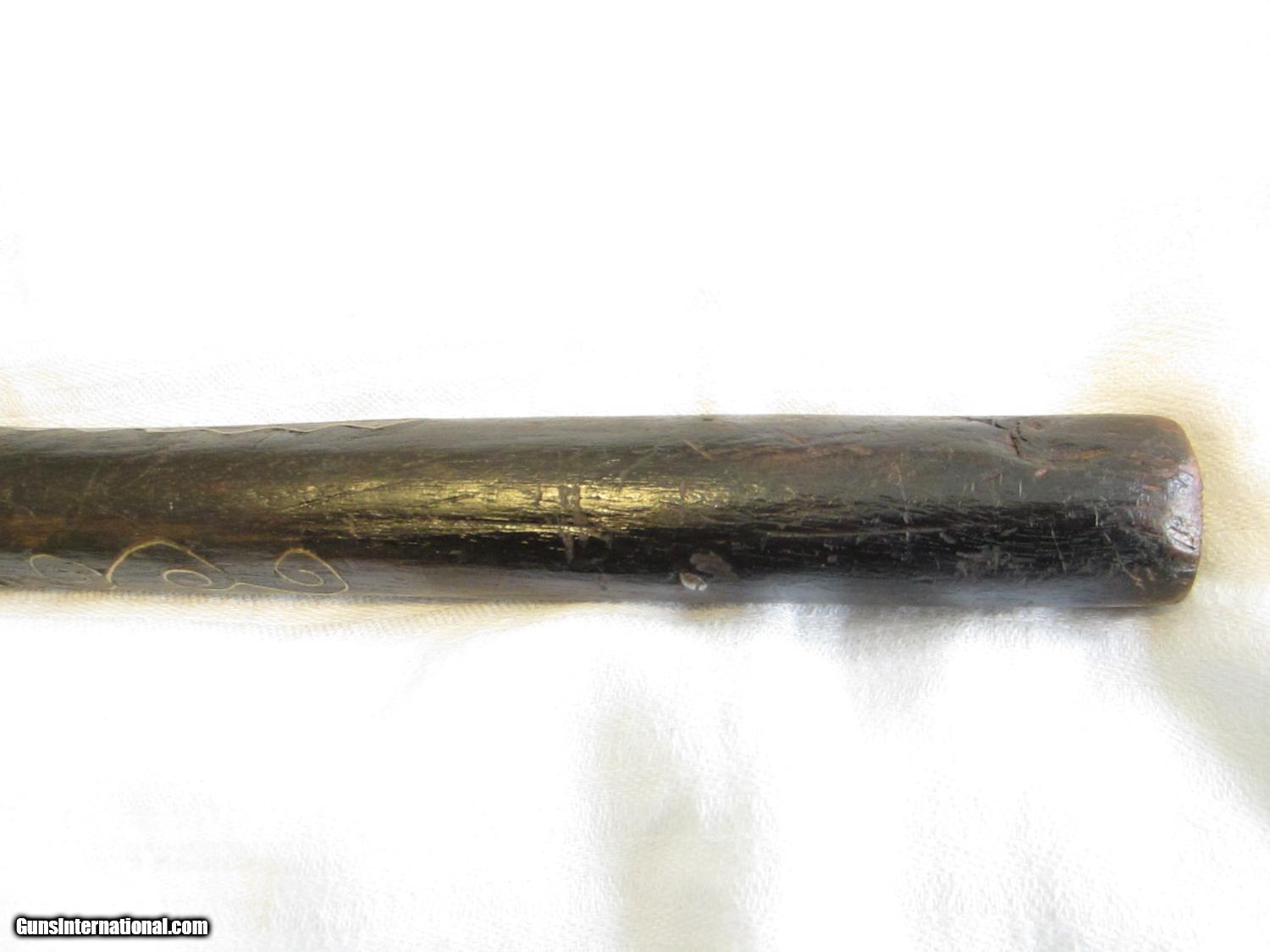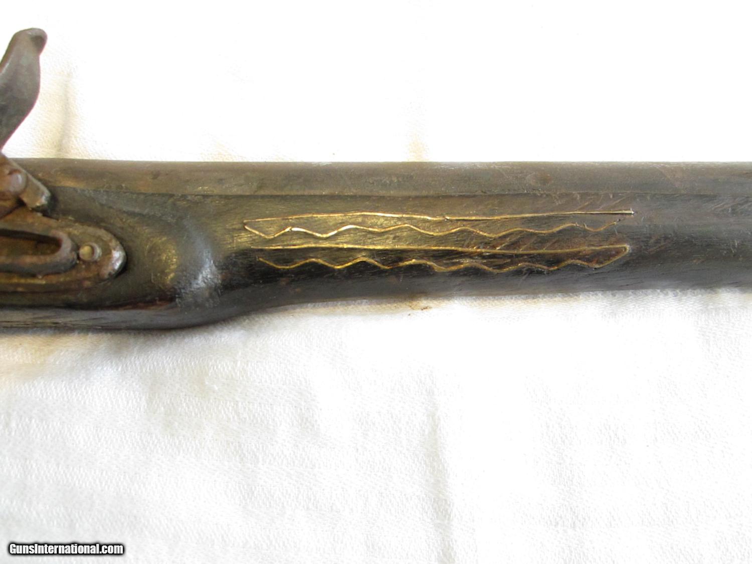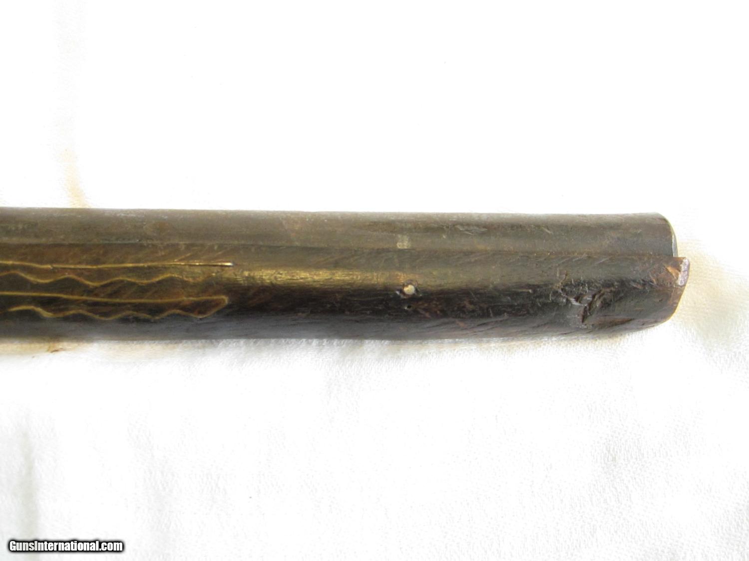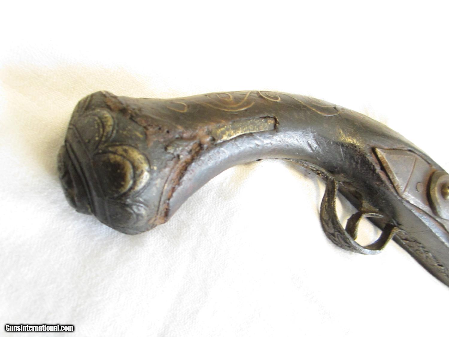 Description: This is not a functioning pistol. It was found in the desert sand in San Diego, California in an area where it is believed old Western style movies were made years ago. The wood is in pretty good shape with a rough area towards the bottom of the grip. There may have been some leather in that area that has been lost due to age. The wood extends to the end of the barrel and there is a lot of decorative inlaid wire on both sides of the barrel and on the top of the grip The wire appears to be all there with none lost. .The metal plate opposite the lock is highly decorated in relief.. The flintlock mechanism does not work. The barrel is 10 and 1/2" long. The overall length is close to 18". This is a real conversation piece. Most likely one of a kind. The overall condition is definitely good enough to warrant hanging on the wall or displaying on a coffee table. No FFL required- it can be sent directly to a new owner. SOLD Manufacturer: unknown Model: Movie Prop- Flintlock Pistol Serial Number: none Condition: old Metal Condition: dark Wood Condition: old Barrels: one Barrel Type: round Action: flintlock replica Triggers: one Stock: wood Manufacture Date: early 1900's ? Item Location: California |