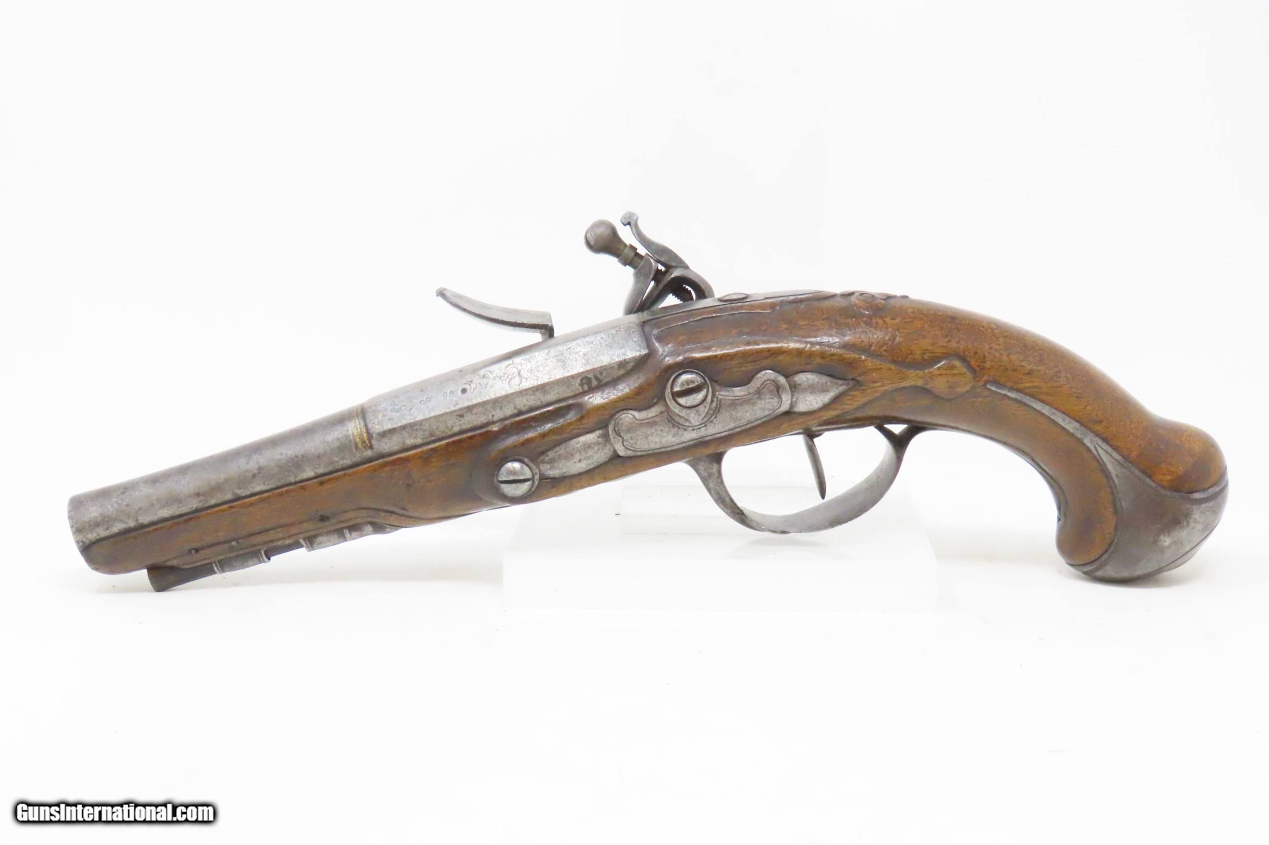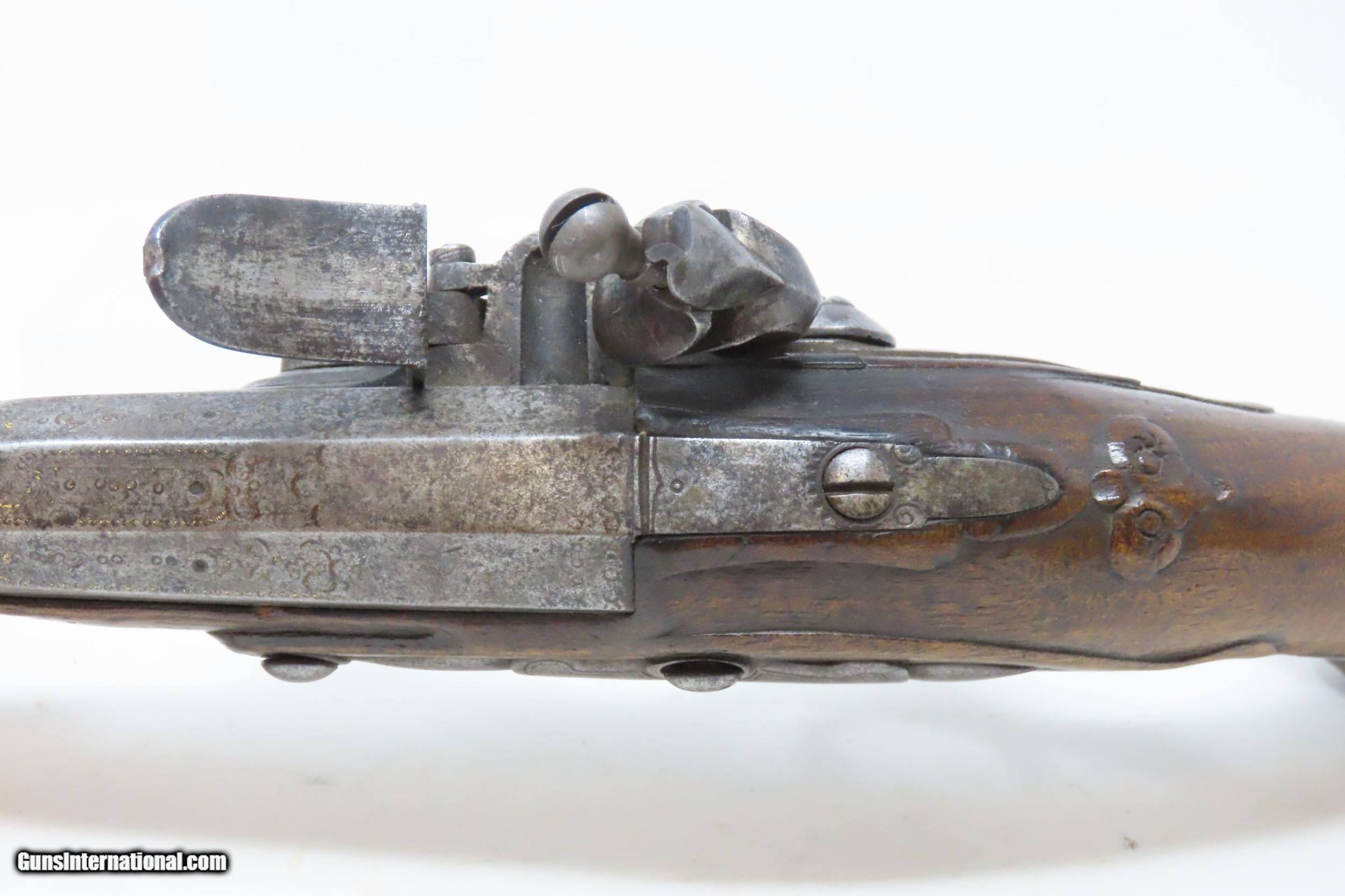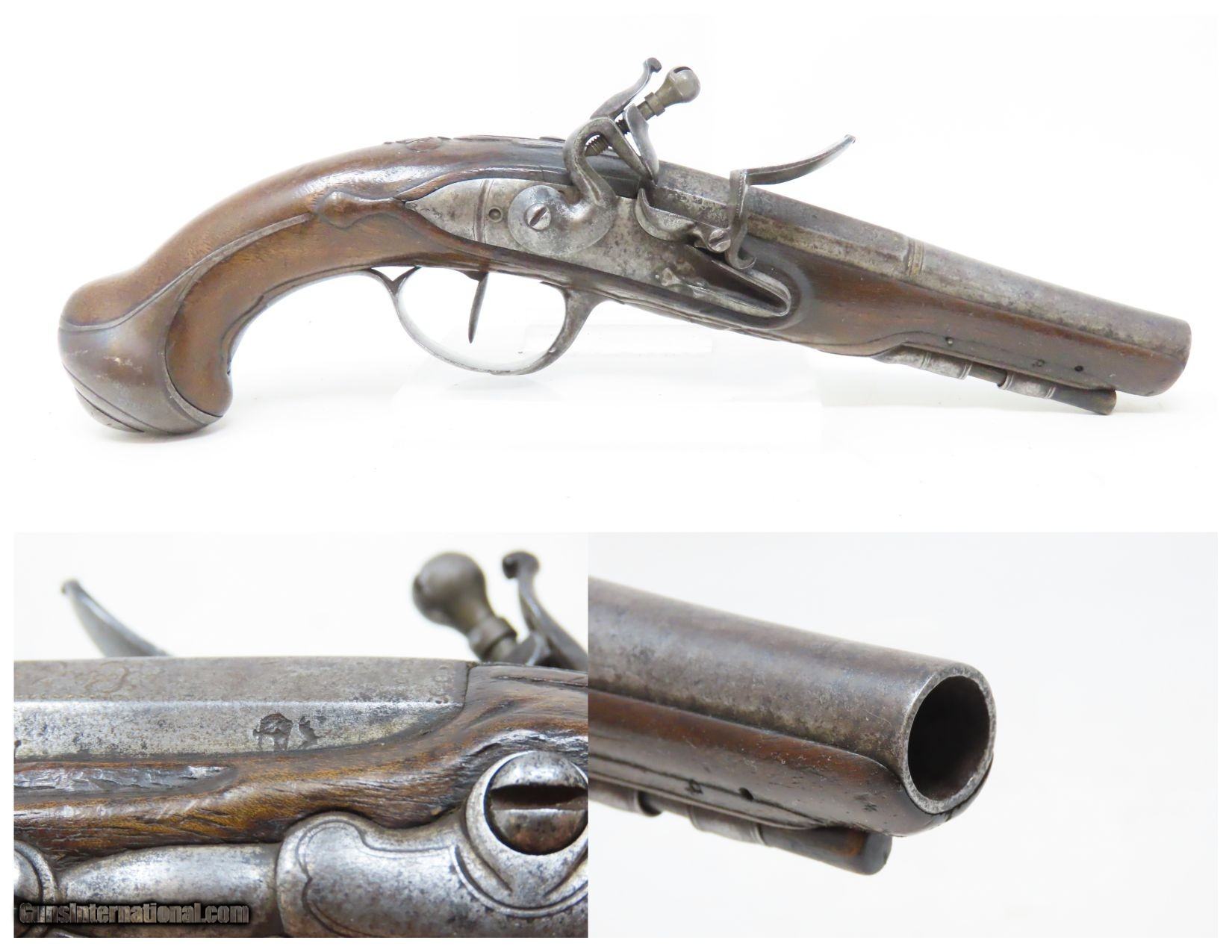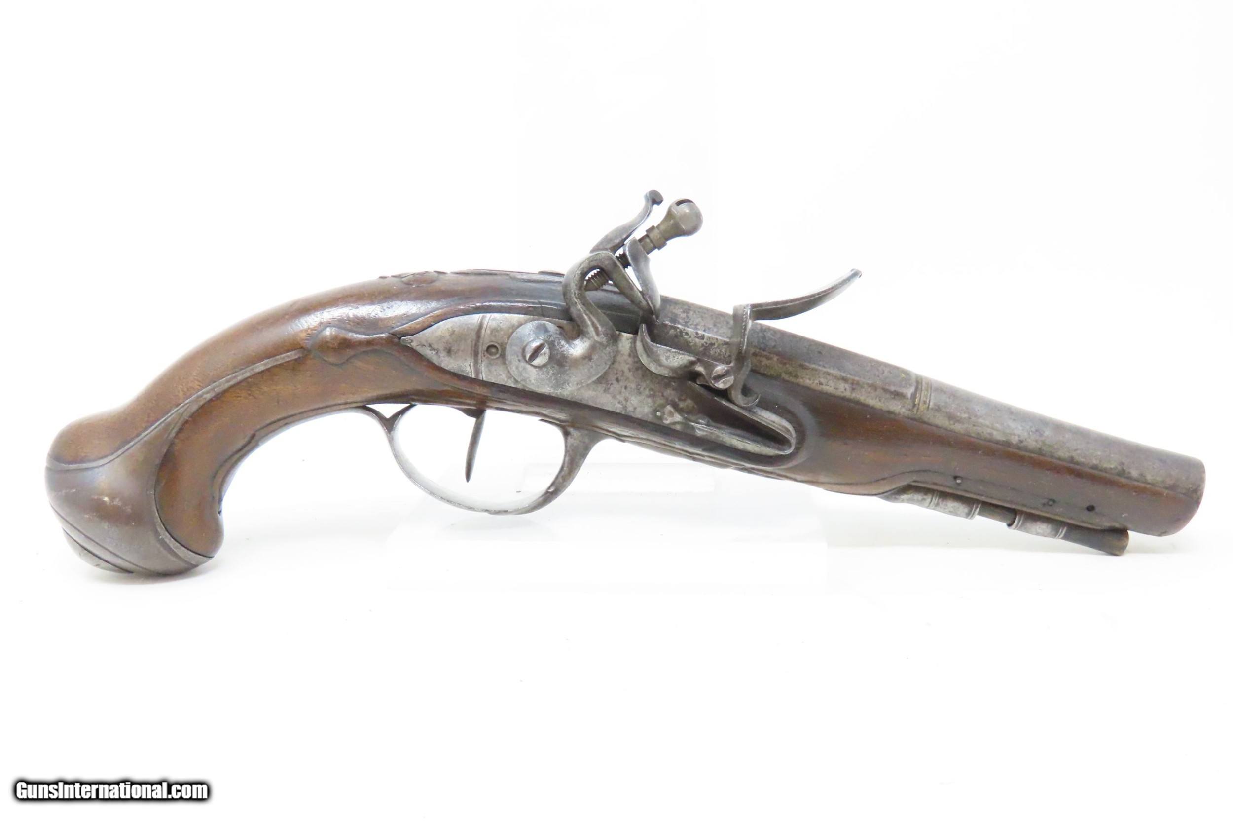Description: FRENCH Antique .56 Cal FLINTLOCK Belt Pistol Single Shot European Early-1800s Carved Stock, Gold Punch Dots Original Flintlock Pistol Here we present an antique French Flintlock Pocket Pistol, made circa early-19th Century in France. This large bore flintlock pistol was used primarily as a self-defense weapon. Their effective range was short, and they were frequently used as an adjunct to a sword. Pistols in this era were usually smoothbore, although some rifled pistols were produced. They came in a variety of sizes with the smallest being less than 6 inches and the largest ranging to over 20 inches. The overall condition is very good. Gray patina with some gold accents that can still be seen atop the barrel. Original flintlock, strong action. Good bore, clear and nicely aged. The stock/grip show an average amount of handling and the carvings remain well defined. There is a split under the barrel where the ramrod tubes are located, which is stable. Own the original! This is a legitimate antique and not a reproduction. Barrel is 5-3/8 inches. Caliber: .56 Flintlock Overall condition as seen in photos. Very Fast. Very Safe. FREE SHIPPING WORLDWIDE. Delivered directly to your door by express mail! Guaranteed AUTHENTIC & Includes CERTIFICATE OF AUTHENTICITY. ancestryguns $1875 #220083 SOLD Antique: Yes |