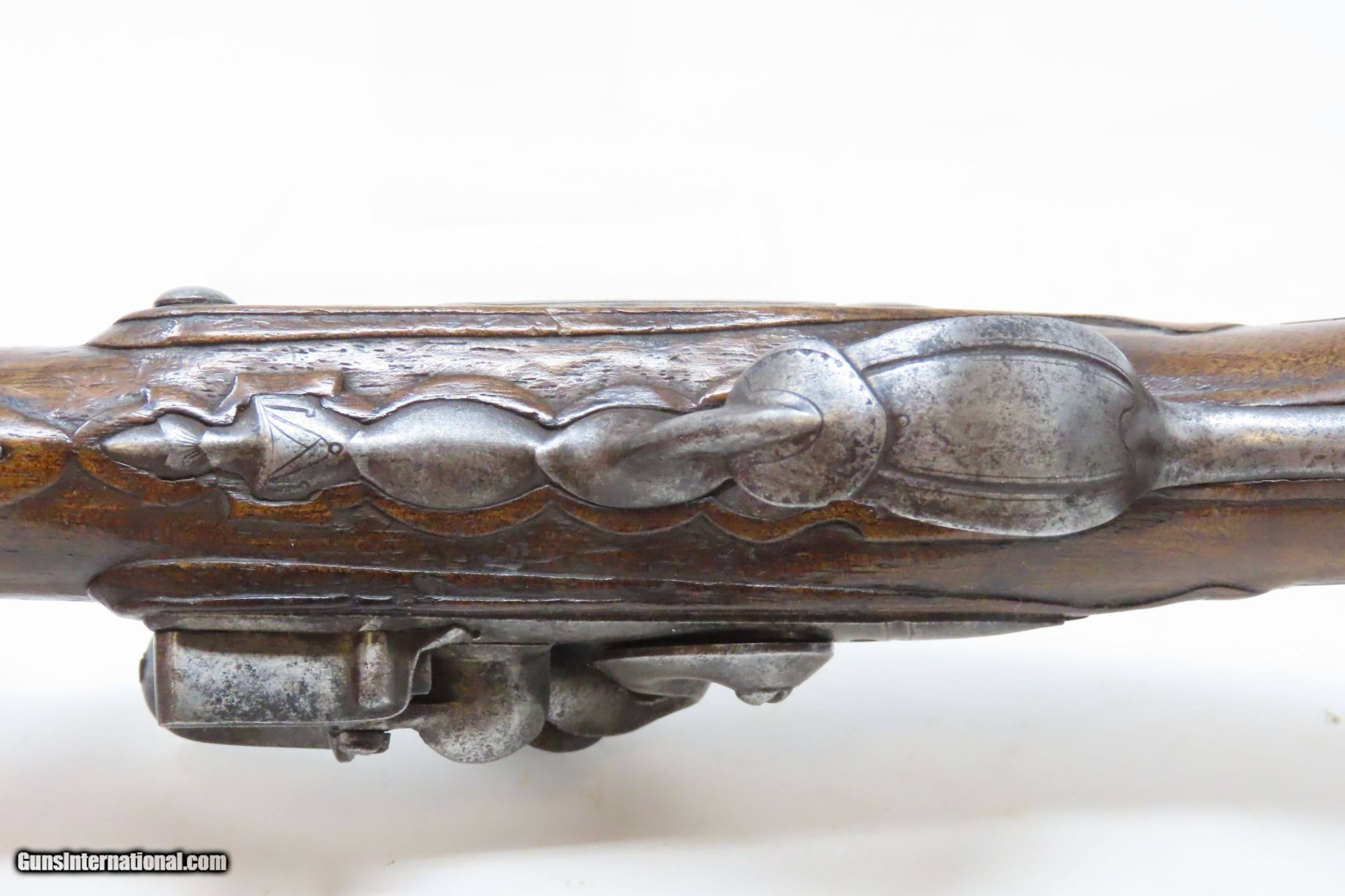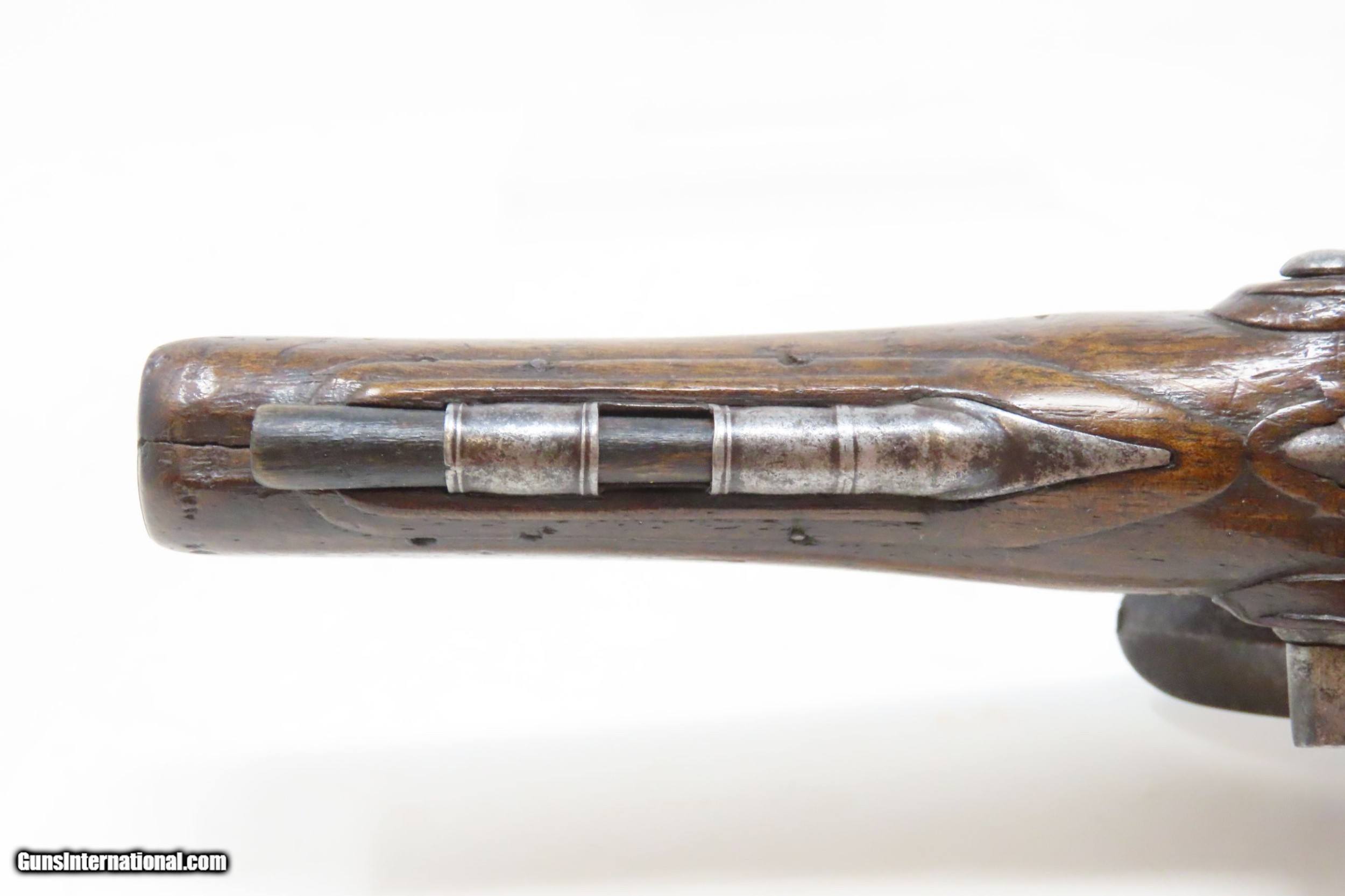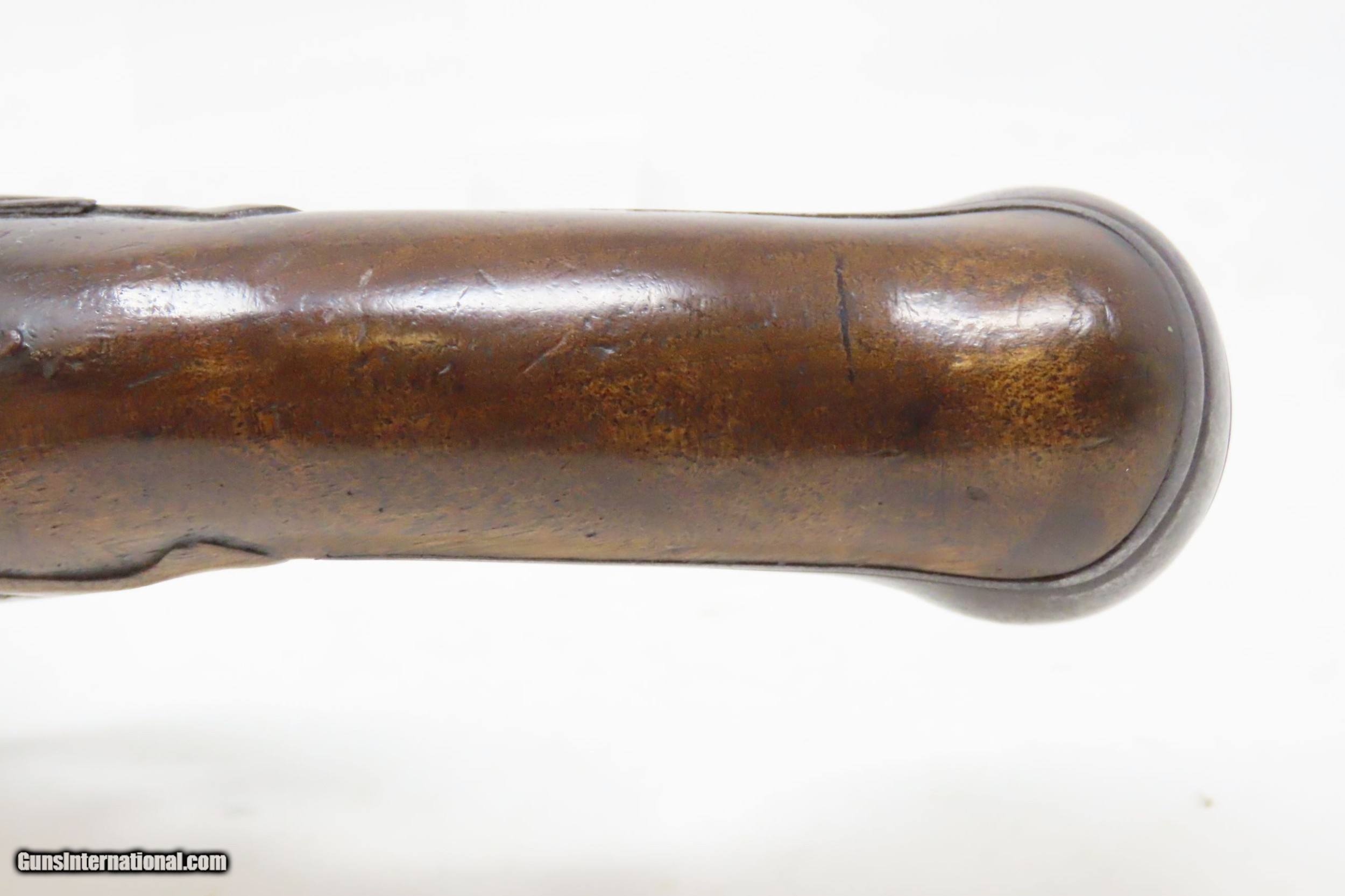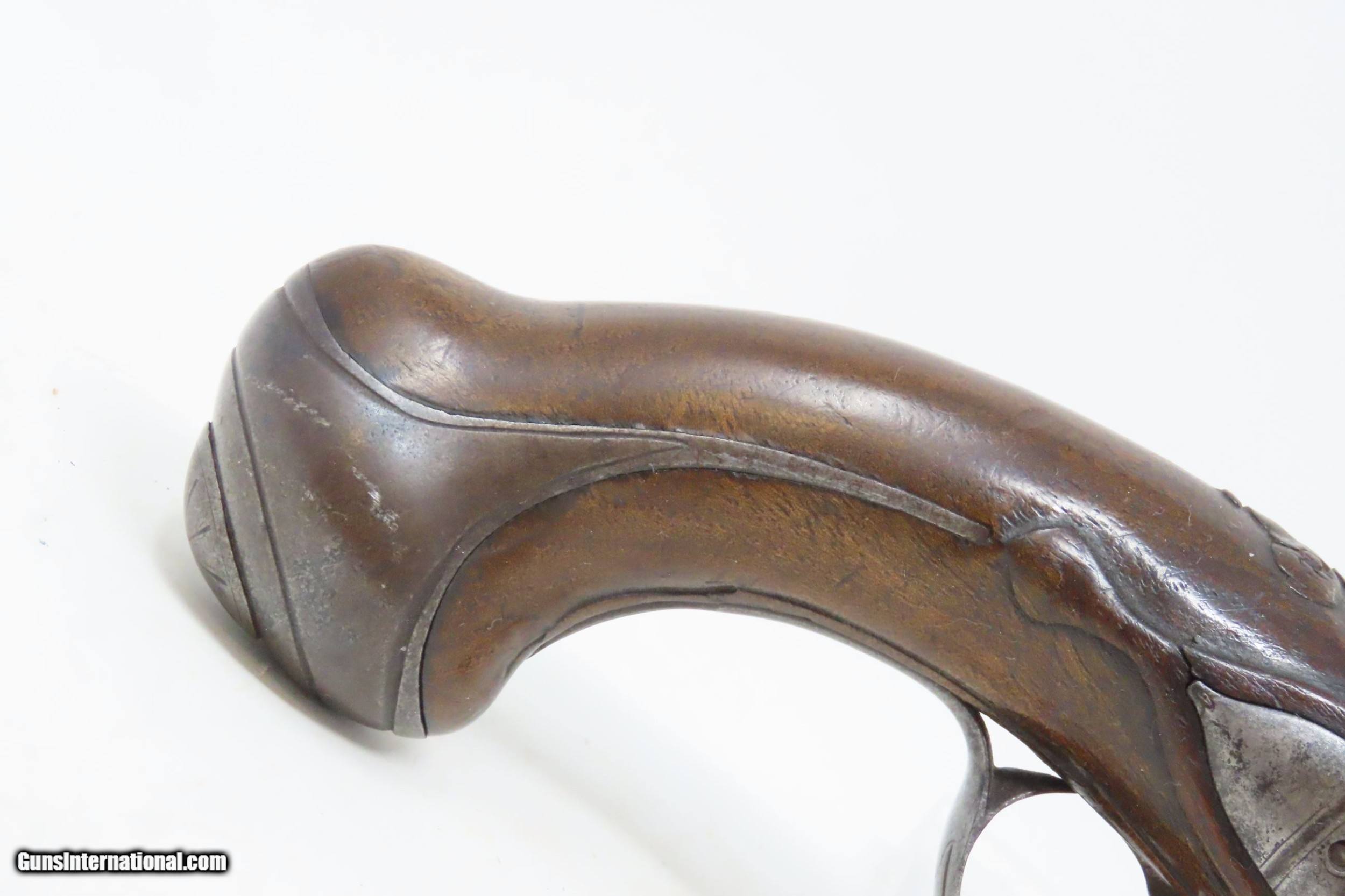 Description: FRENCH Antique .56 Cal FLINTLOCK Belt Pistol Single Shot European Early-1800s Carved Stock, Gold Punch Dots Original Flintlock Pistol Here we present an antique French Flintlock Pocket Pistol, made circa early-19th Century in France. This large bore flintlock pistol was used primarily as a self-defense weapon. Their effective range was short, and they were frequently used as an adjunct to a sword. Pistols in this era were usually smoothbore, although some rifled pistols were produced. They came in a variety of sizes with the smallest being less than 6 inches and the largest ranging to over 20 inches. The overall condition is very good. Gray patina with some gold accents that can still be seen atop the barrel. Original flintlock, strong action. Good bore, clear and nicely aged. The stock/grip show an average amount of handling and the carvings remain well defined. There is a split under the barrel where the ramrod tubes are located, which is stable. Own the original! This is a legitimate antique and not a reproduction. Barrel is 5-3/8 inches. Caliber: .56 Flintlock Overall condition as seen in photos. Very Fast. Very Safe. FREE SHIPPING WORLDWIDE. Delivered directly to your door by express mail! Guaranteed AUTHENTIC & Includes CERTIFICATE OF AUTHENTICITY. ancestryguns $1875 #220083 SOLD Antique: Yes |