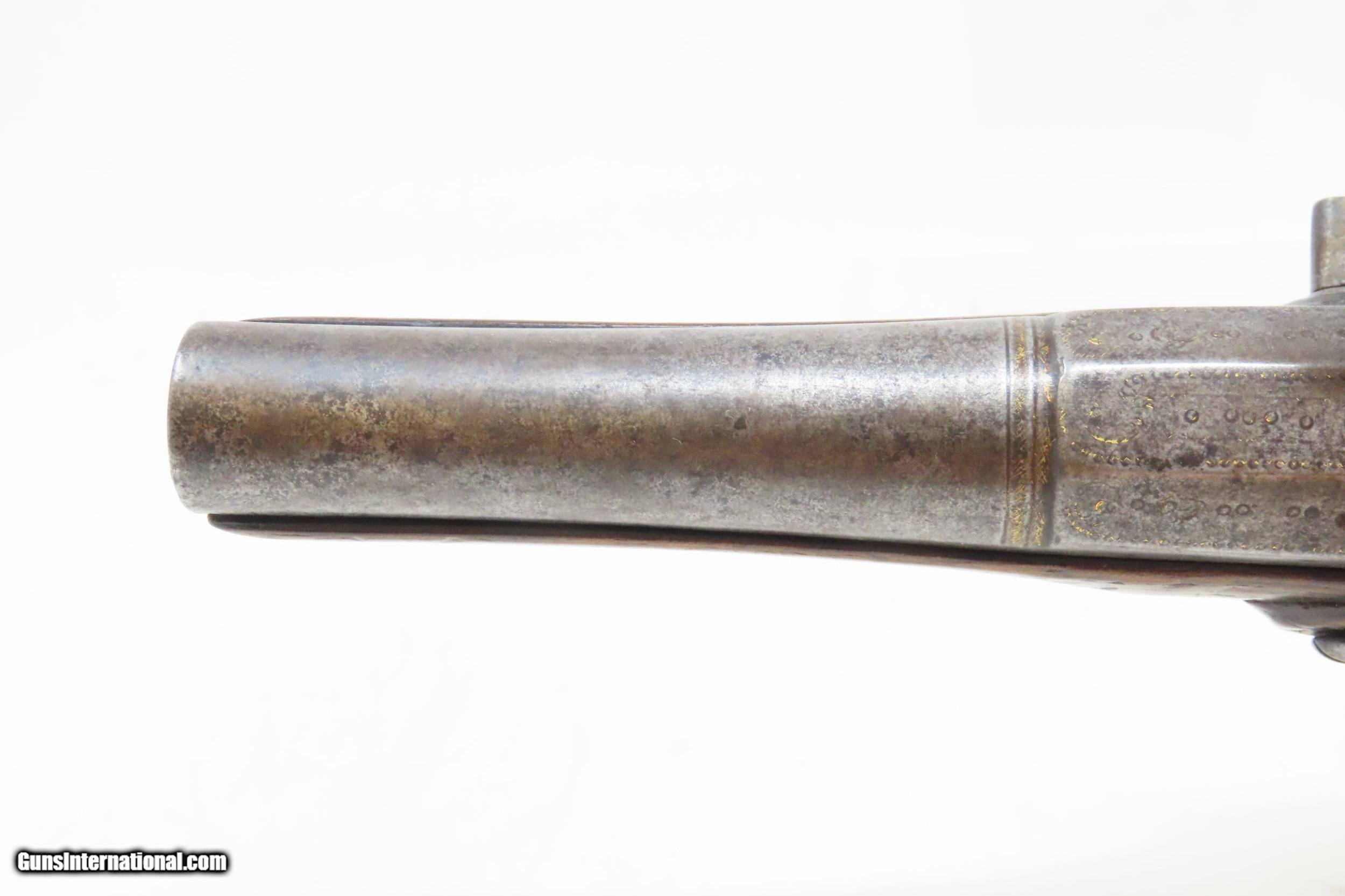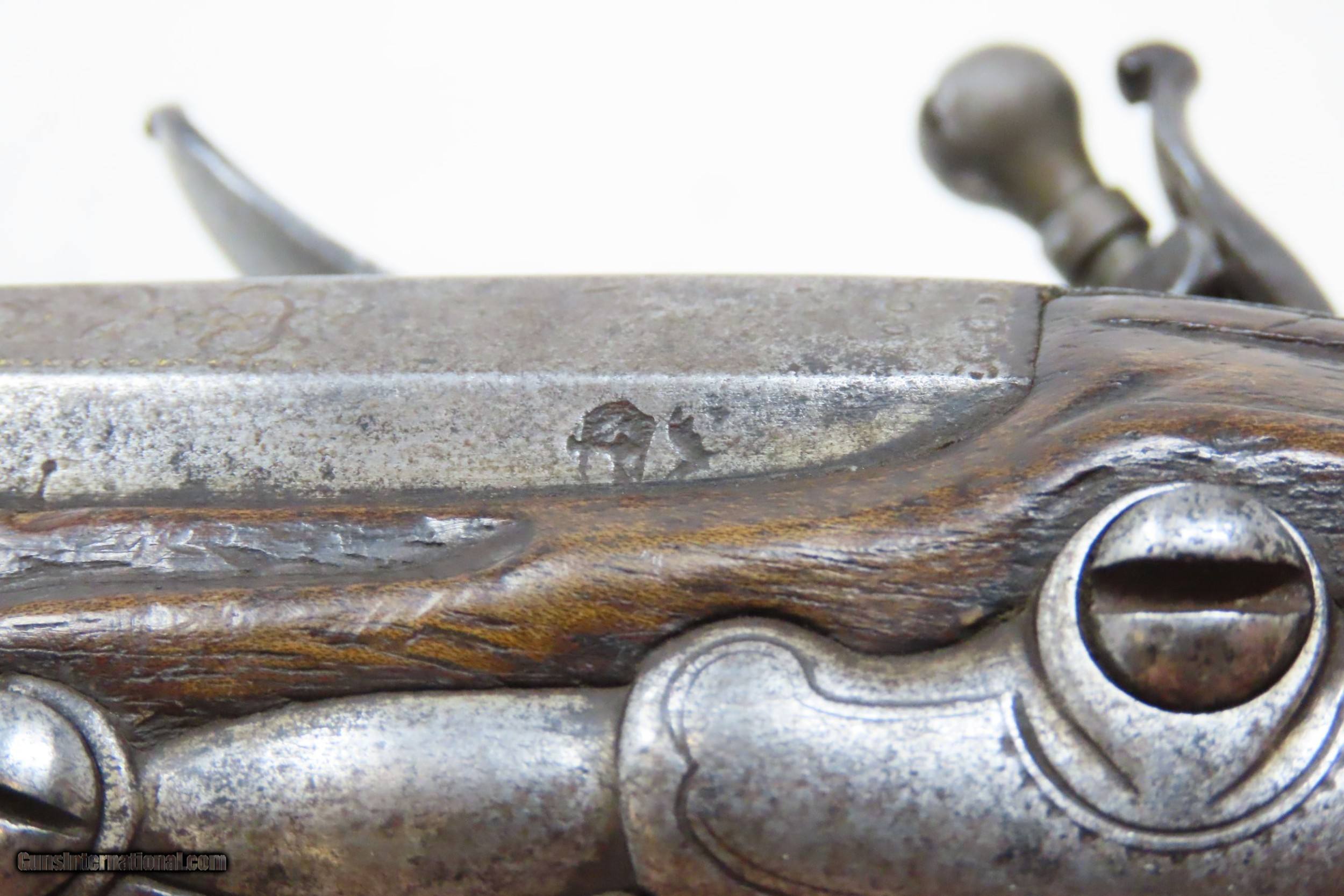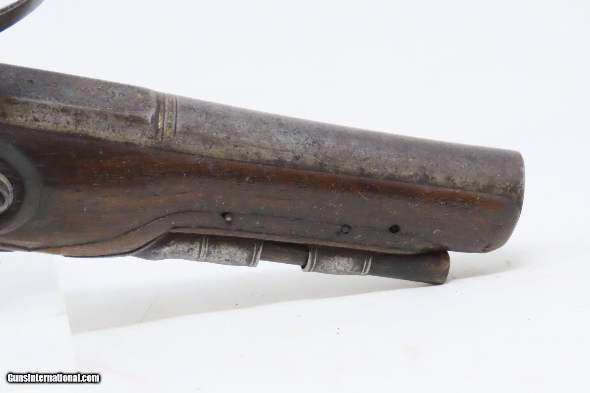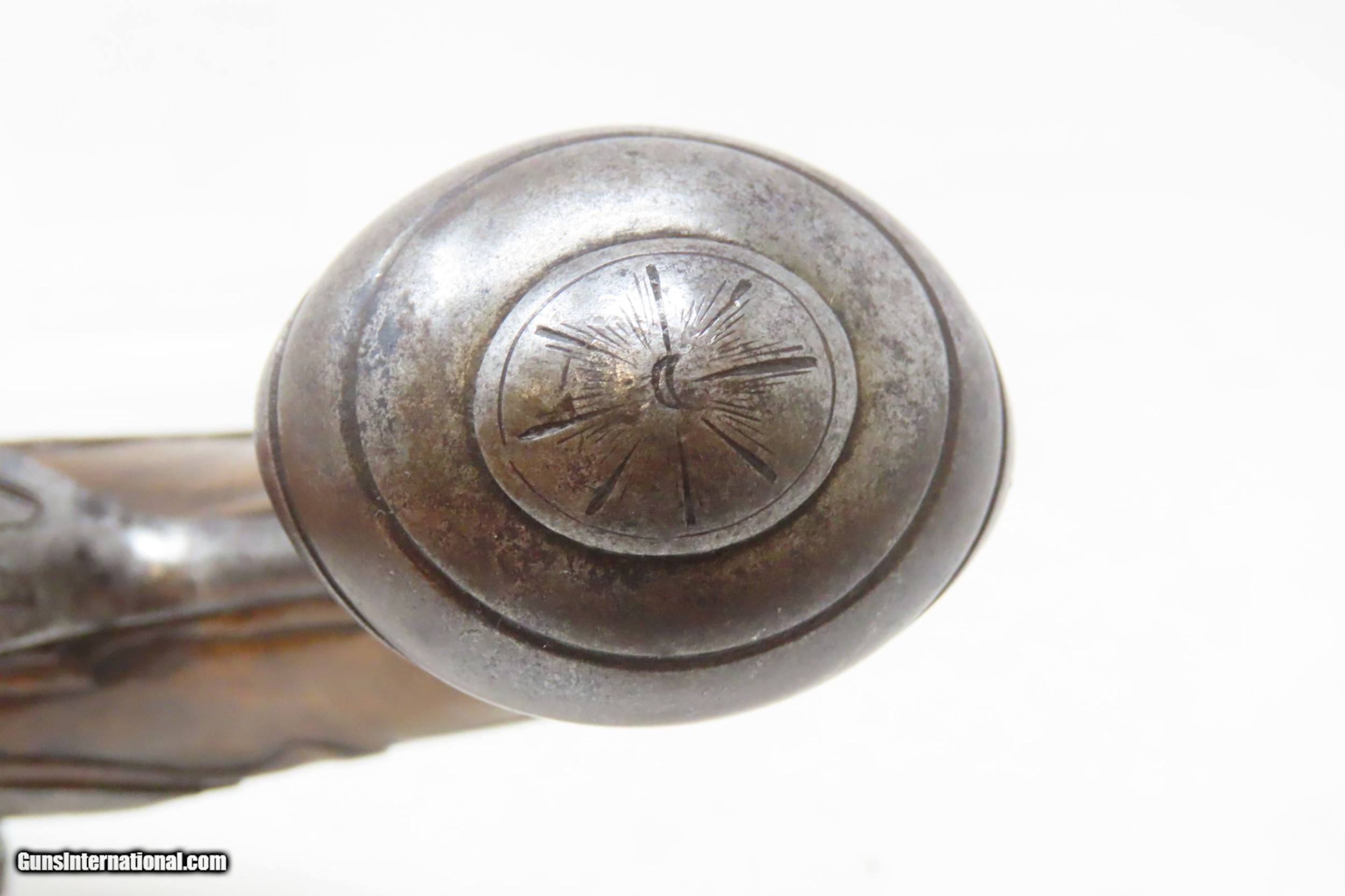 Description: FRENCH Antique .56 Cal FLINTLOCK Belt Pistol Single Shot European Early-1800s Carved Stock, Gold Punch Dots Original Flintlock Pistol Here we present an antique French Flintlock Pocket Pistol, made circa early-19th Century in France. This large bore flintlock pistol was used primarily as a self-defense weapon. Their effective range was short, and they were frequently used as an adjunct to a sword. Pistols in this era were usually smoothbore, although some rifled pistols were produced. They came in a variety of sizes with the smallest being less than 6 inches and the largest ranging to over 20 inches. The overall condition is very good. Gray patina with some gold accents that can still be seen atop the barrel. Original flintlock, strong action. Good bore, clear and nicely aged. The stock/grip show an average amount of handling and the carvings remain well defined. There is a split under the barrel where the ramrod tubes are located, which is stable. Own the original! This is a legitimate antique and not a reproduction. Barrel is 5-3/8 inches. Caliber: .56 Flintlock Overall condition as seen in photos. Very Fast. Very Safe. FREE SHIPPING WORLDWIDE. Delivered directly to your door by express mail! Guaranteed AUTHENTIC & Includes CERTIFICATE OF AUTHENTICITY. ancestryguns $1875 #220083 SOLD Antique: Yes |