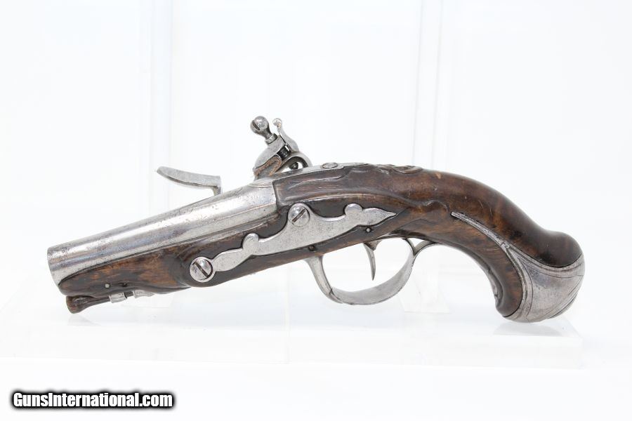 Description: French Antique “MANSTOPPER” Flintlock .50 Pistol Late-18th Century European Defensive Weapon Here we present an antique French Flintlock Pistol, made circa the late 18th Century in France. This large bore flintlock pistol was used primarily as a self-defense weapon, as a “manstopper”. Their effective range was short, and they were frequently used as an adjunct to a sword. Pistols in this era were usually smoothbore, although some rifled pistols were produced. They came in a variety of sizes with the smallest being less than 6 inches and the largest ranging to over 20 inches. The smallest would fit into a typical pocket or a hand warming muff and could easily be carried by women. The overall condition is very good. The iron parts are semi-bright. The markings are clear. The stock is smooth and in good condition with a small repair just forward of the lock. The bore is smooth and dark. The action is functional. Own the original! This is a legitimate antique and not a reproduction. Barrel is 3-1/2 inches. Caliber: .50 Overall condition as seen in photos. Very Fast. Very Safe. FREE SHIPPING WORLDWIDE. Delivered directly to your door by express mail! Guaranteed AUTHENTIC & Includes CERTIFICATE OF AUTHENTICITY. ancestryguns $995 #8085 SOLD Antique: Yes |