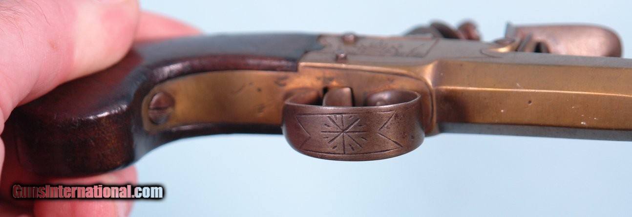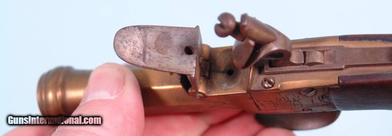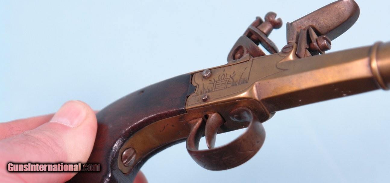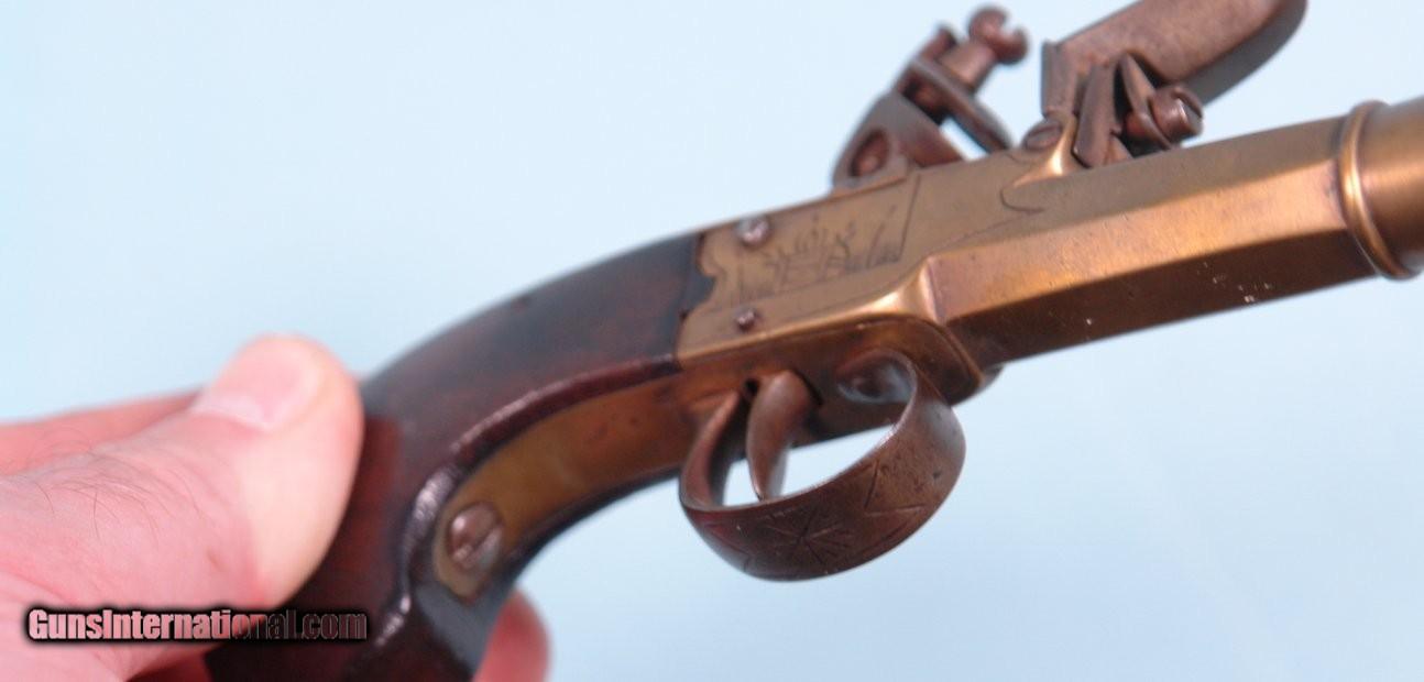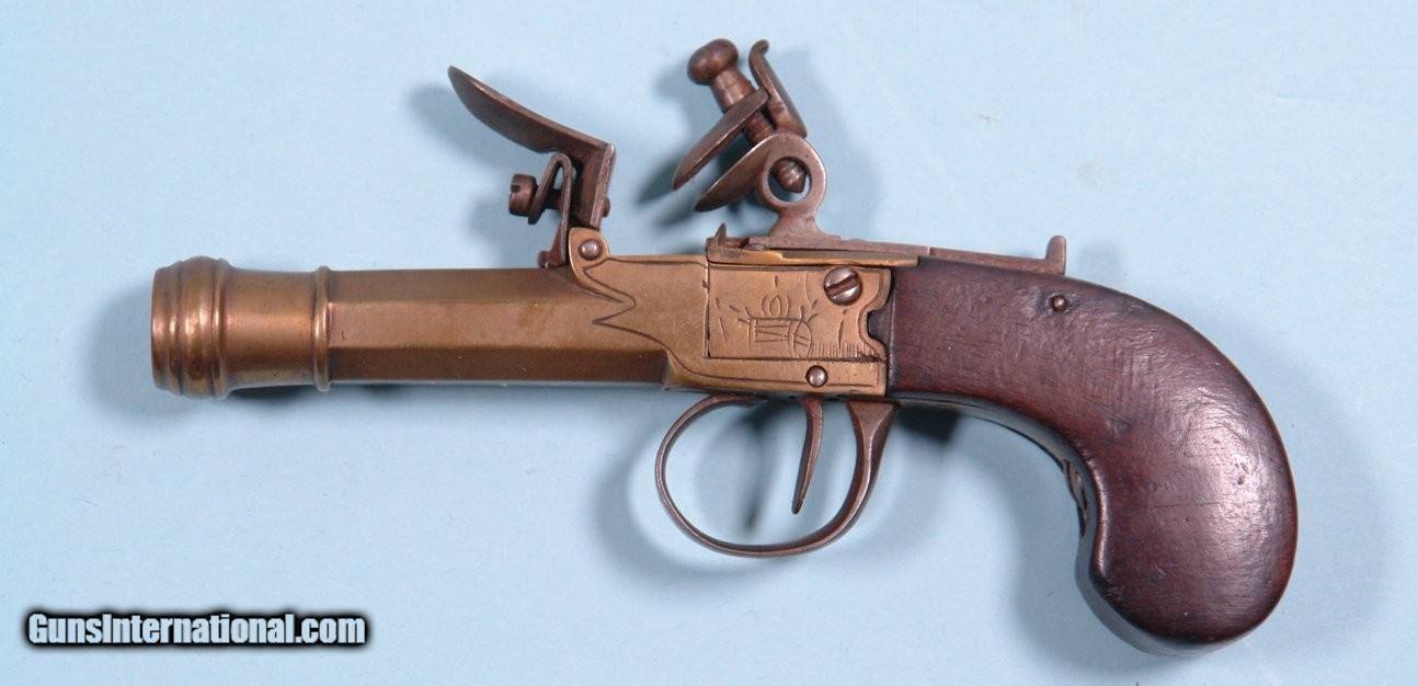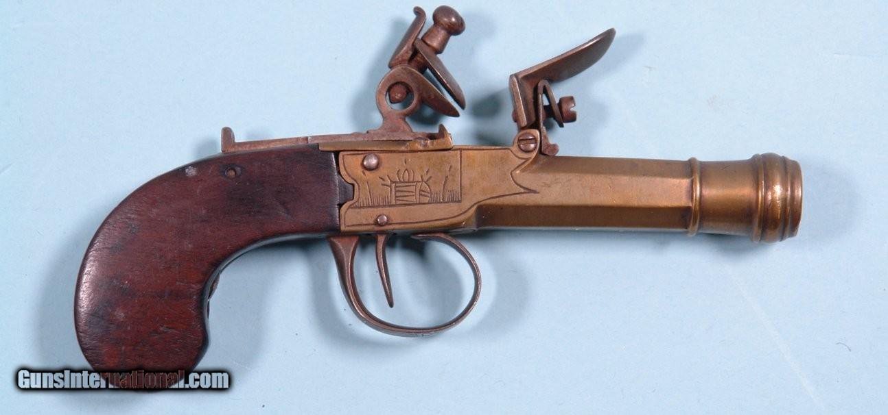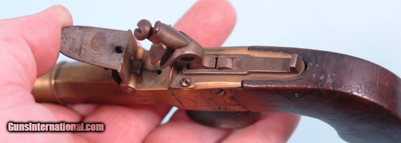 FRENCH BRASS CANNON BARREL FLINTLOCK BOXLOCK POCKET PISTOL CIRCA LATE 1700’S.