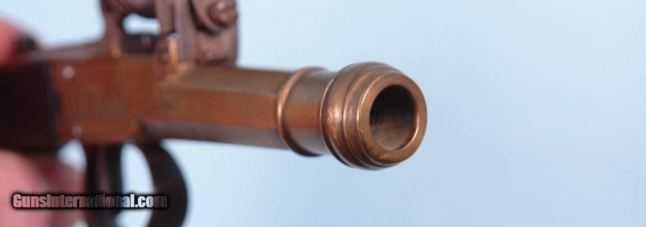 Description: FRENCH BRASS CANNON BARREL FLINTLOCK BOXLOCK POCKET PISTOL CIRCA LATE 1700’S. 6 ½” o/a with very handsome 2 ½” octagon brass .45 cal. smoothbore barrel with dramatically formed cannon muzzle. Lock lightly engraved on both sides. Iron trigger guard. Sliding hammer safety. Flattened bag shaped walnut grip. 100% original excellent condition. Grip with all the finish. Perfect working order and excellent bore. Although unmarked it is of fine quality and in superior condition. SOLD Antique: Yes |