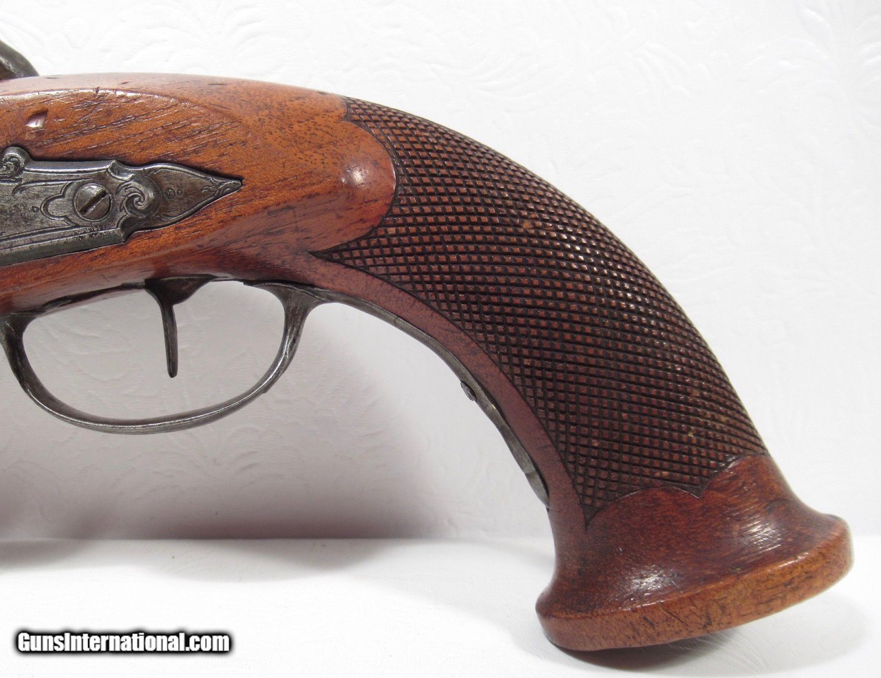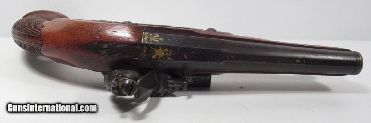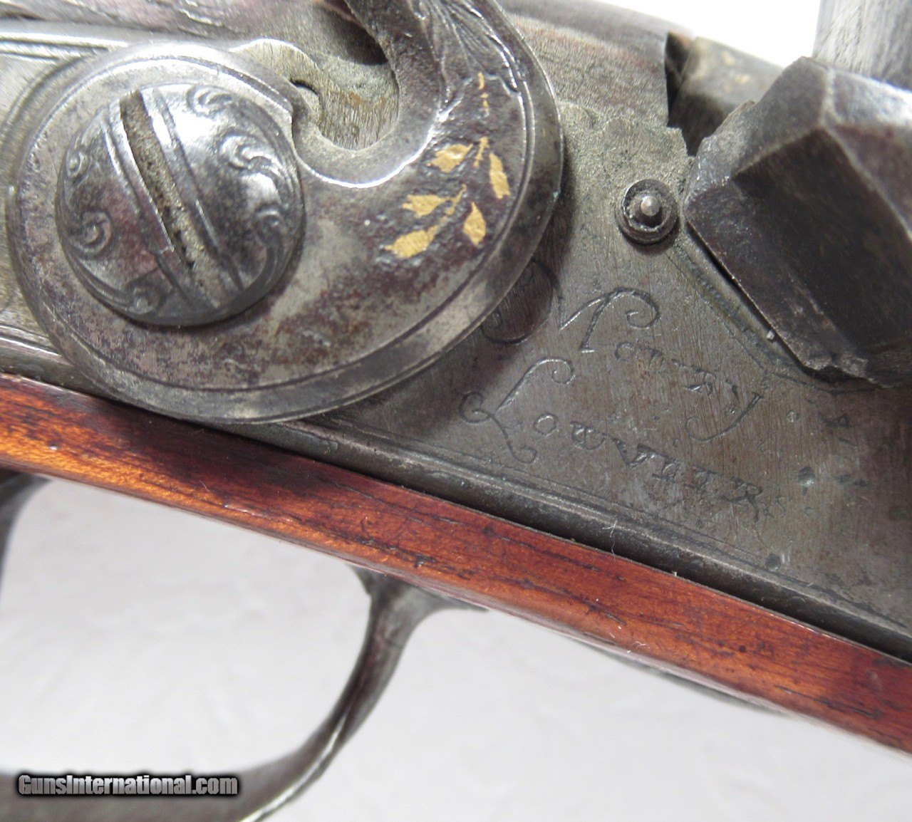 Description: LIQUIDATING PERSONAL COLLECTION!!! Really High Quality Flintlock Pistol Made by Moury of Louviers – Normandy, France; Approx. 58 Cal. with Approx. 5 ½” Barrel; 10 ½” L.O.A.; Nicely Engraved with Gold Accents; Nice Checkered Wood; Original Ramrod; Smooth Bore with light pitting; Perfect Action; antique, Price includes insured shipping SOLD Antique: Yes Manufacturer: Moury of Louviers |