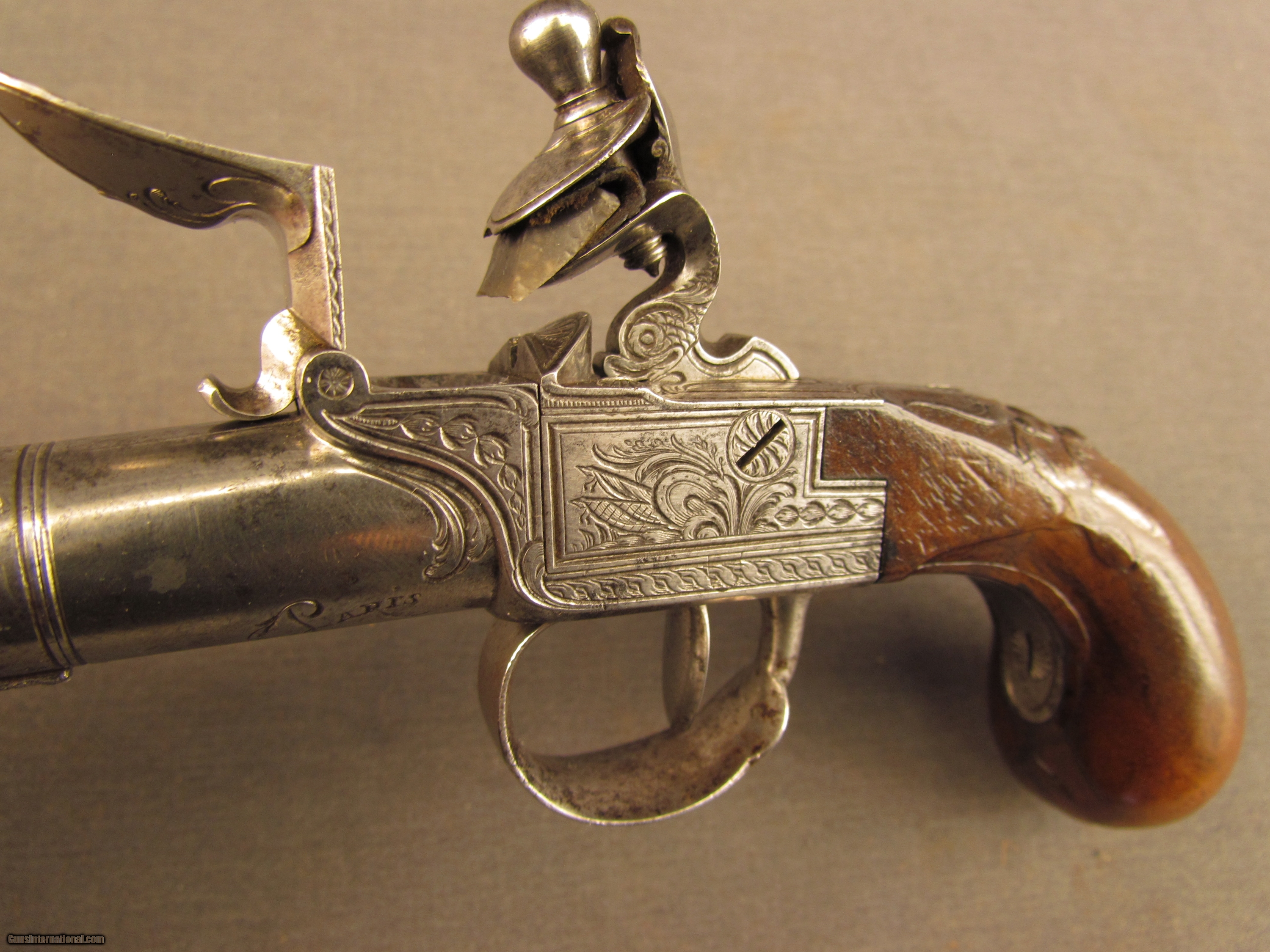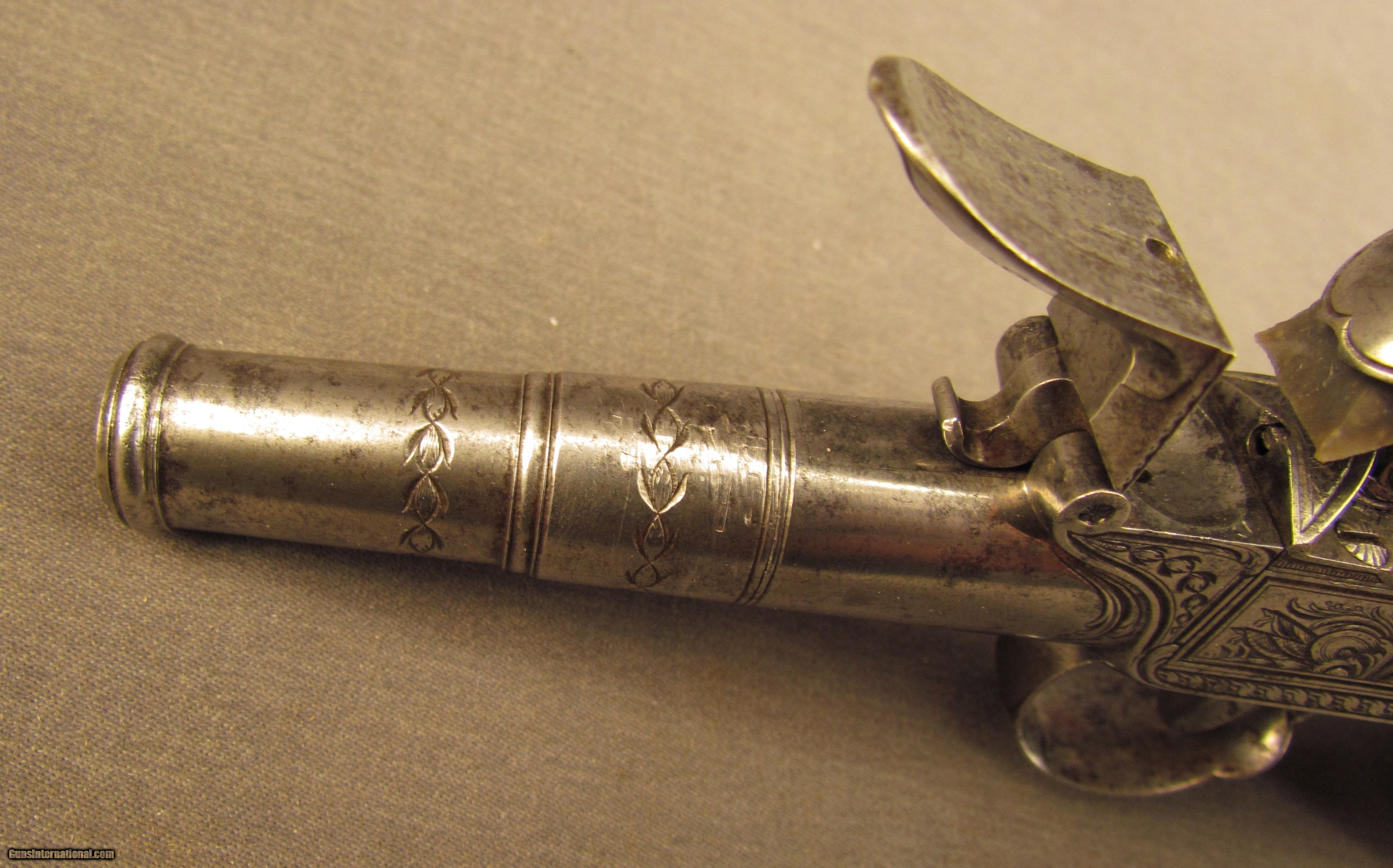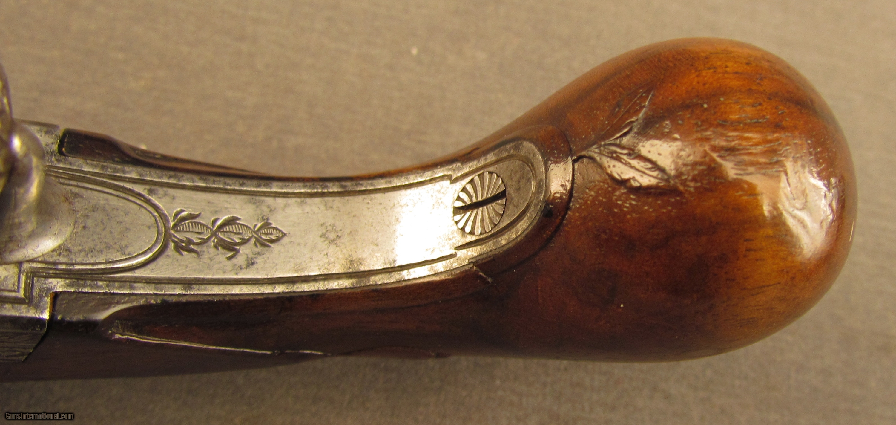 Description: NSN, .43 Caliber, 3” cannon muzzle barrel with an excellent, bright bore. This is a handsome little coat pocket pistol that has an overall, lightly speckled, bright gray patina throughout. There are spots of darker freckling on the face of the frizzen and inside the pan. The action has a graceful swan-necked cock with dolphin engraving at the base, and there is geometric engraving along both the barrel and the box frame. The smooth, bag-shaped walnut grip is in fine-near excellent condition and has a beautiful, original relief-carved rose motif where the wood meets the top tang and two leaves sprouting from the bottom. The lock is still tight and fully functional, and the pistol is housed in a later wooden case with relined green baize interior, and a loosely attached single compartment wall. The pistol comes with the following accessories: original barrel spanner, a small pendant-style powder flask marked "Sykes", brass oiler, small brass container of spare flints, and the case key. The pistol was made by the Parisian firm of Fillon, Langumier & Autelet (1785 – 1790) and is an excellent example of a French turn-off pocket pistol. Antique SOLD Antique: Yes Manufacturer: Fillon Model: Flintlock Caliber Info: .43 cal Gauge Info: .43 cal |