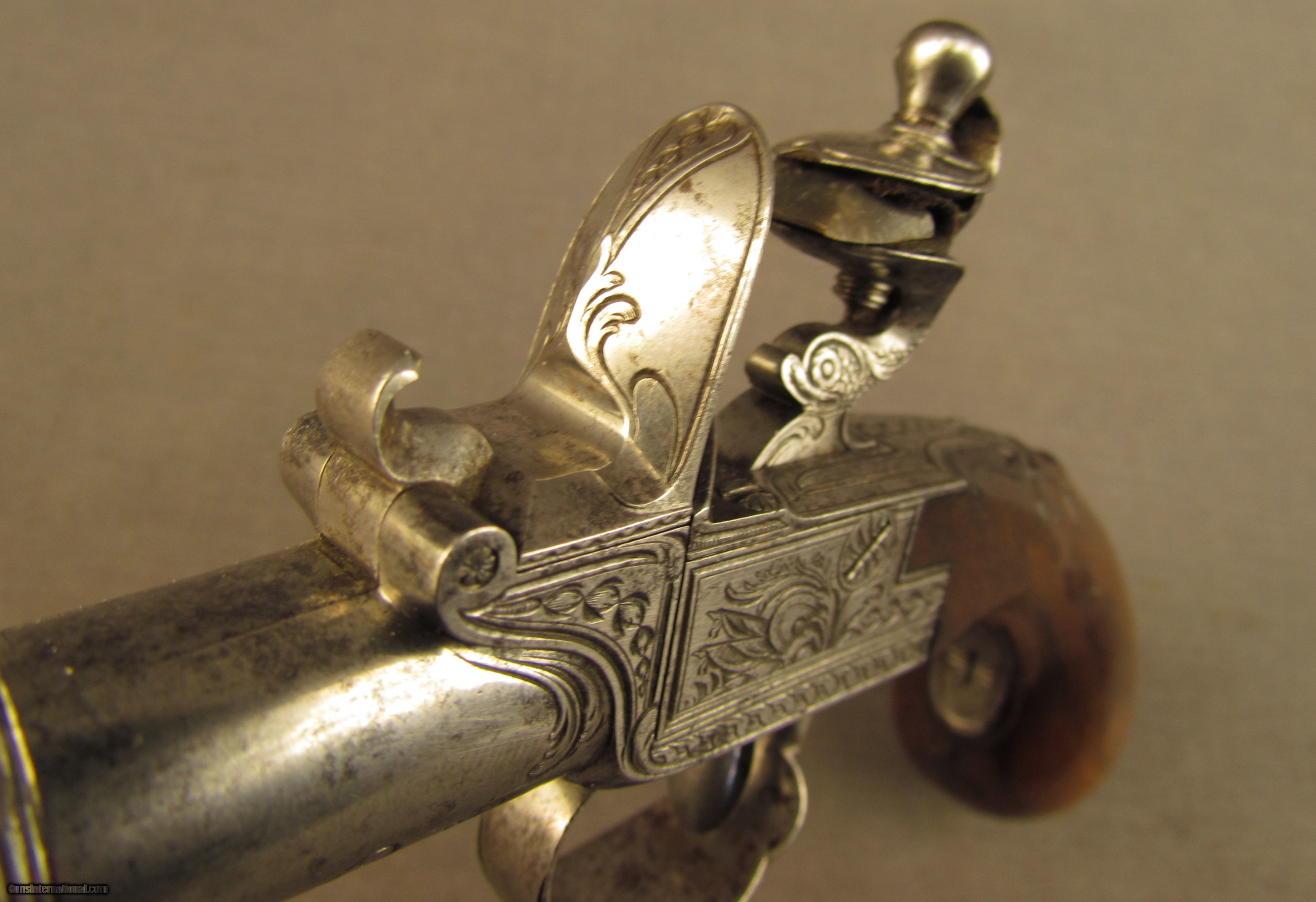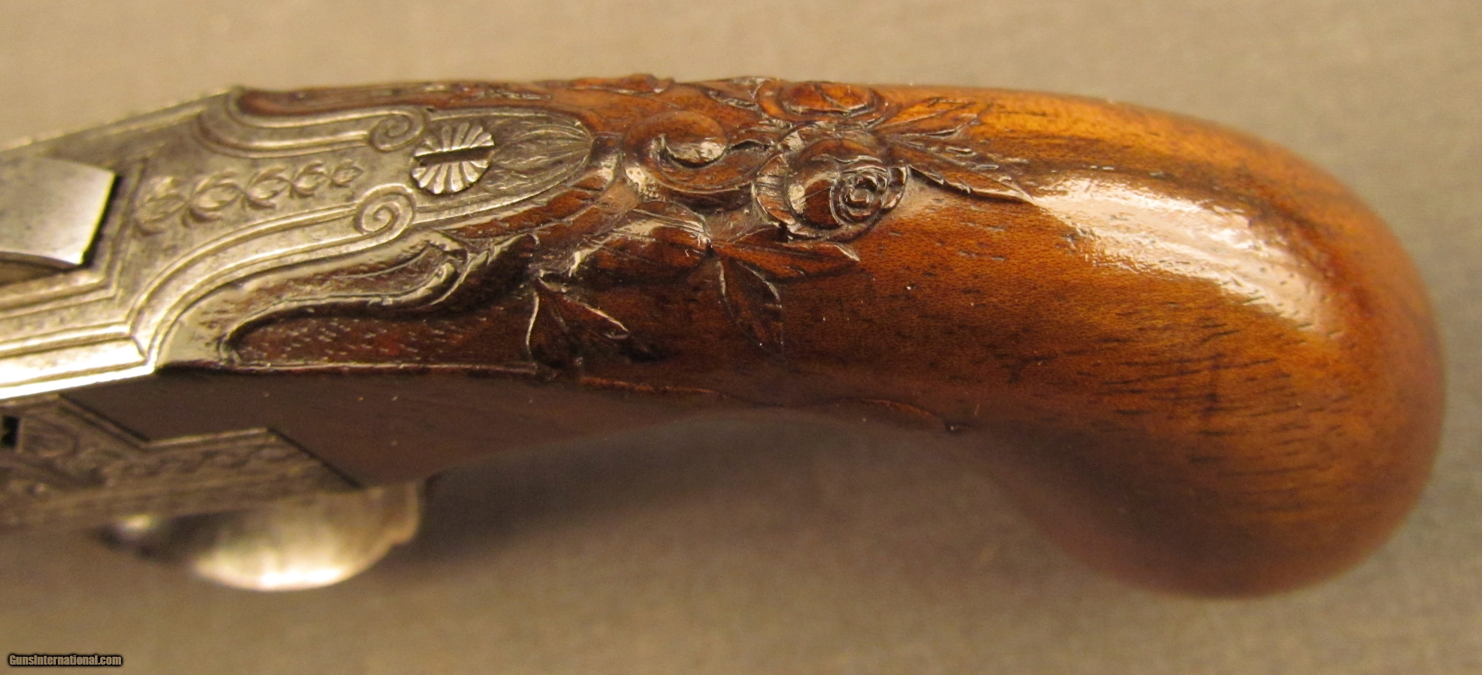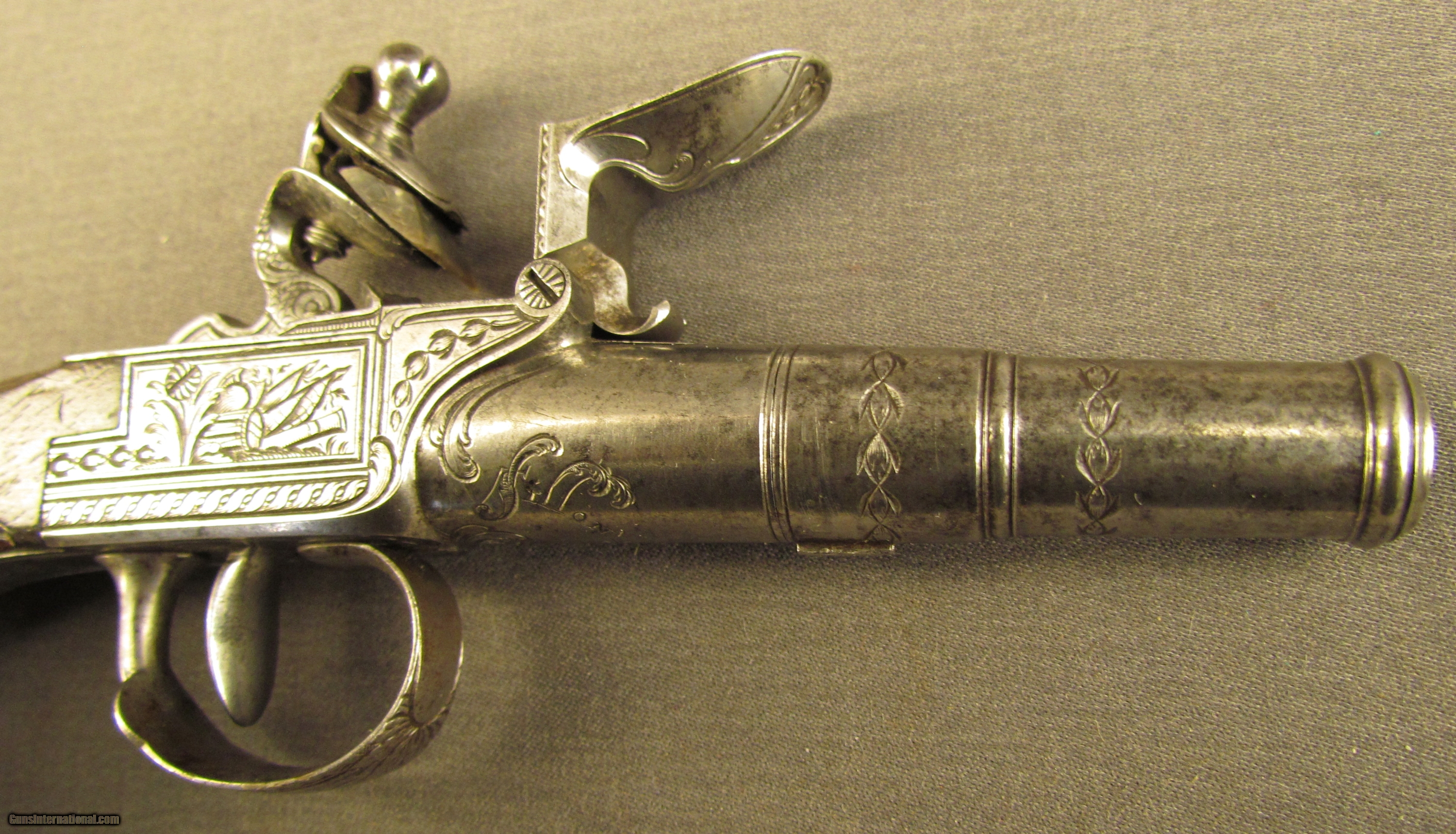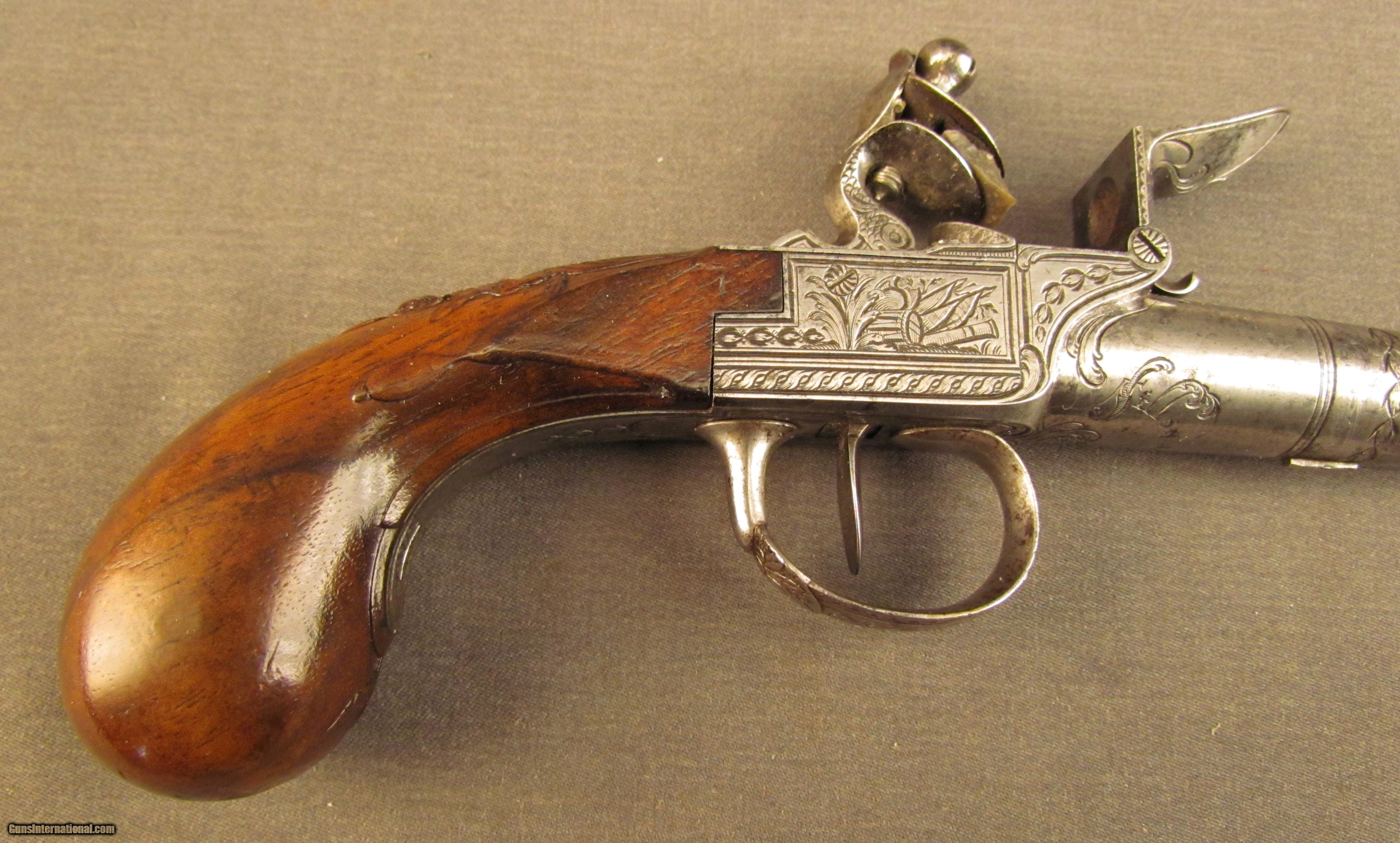 Description: NSN, .43 Caliber, 3” cannon muzzle barrel with an excellent, bright bore. This is a handsome little coat pocket pistol that has an overall, lightly speckled, bright gray patina throughout. There are spots of darker freckling on the face of the frizzen and inside the pan. The action has a graceful swan-necked cock with dolphin engraving at the base, and there is geometric engraving along both the barrel and the box frame. The smooth, bag-shaped walnut grip is in fine-near excellent condition and has a beautiful, original relief-carved rose motif where the wood meets the top tang and two leaves sprouting from the bottom. The lock is still tight and fully functional, and the pistol is housed in a later wooden case with relined green baize interior, and a loosely attached single compartment wall. The pistol comes with the following accessories: original barrel spanner, a small pendant-style powder flask marked "Sykes", brass oiler, small brass container of spare flints, and the case key. The pistol was made by the Parisian firm of Fillon, Langumier & Autelet (1785 – 1790) and is an excellent example of a French turn-off pocket pistol. Antique SOLD Antique: Yes Manufacturer: Fillon Model: Flintlock Caliber Info: .43 cal Gauge Info: .43 cal |