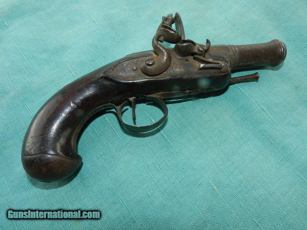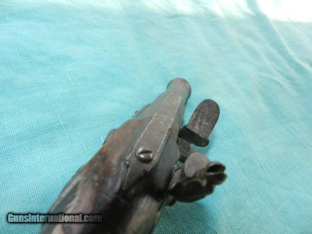 Description: A French Gendame Small pocket Flintlock of the 18th Century. Often these worked their way to the New World and even the American Rev. War' with a ..52 cal, 3 3/8” part octagon part round barrel with cannon muzzle and an oxidized bore. The metal surfaces have mostly toned to gray-brown patina showing scattered oxidation staining and old light to moderate pitting. The walnut stock remains in very good condition showing long ago repaired cracks near the tip, overall darkening from the years and scattered light dings. Stock fit remains quite nice overall, a simple slightly offset ramrod is included and the springs are a little soft but the lock otherwise seems to function normally. Measuring about 7 1/2" overall, very neat , handy sto-away pistol.When buying a gun always have it examined by a competent gunsmith before shooting. To buy a gun from me you must get a direct email for me, with details, and shipping cost. We don’t have a web site .I prefer money orders or a check. Item ships when funds come in. I try to keep guns affordable, which means I make less money than most dealers. You won’t get altitude sickness, or nose bleed, with my prices! I consistently have the best selection of older guns If you attempt to buy, you must still contact us for details . Best to email to buy. Sometimes a local person can stop buy and purchase before the gun is removed. Sometimes not home to get calls. Some guns are required shipment to a gun dealer near you for a transfer to you when it arrives. Otherwise many older or black powder guns ship to your door. With the widest selection of older guns at great prices, We don’t have a store, and sell on the internet only. I’m easy to get along with. Thank You SOLD Antique: Yes |