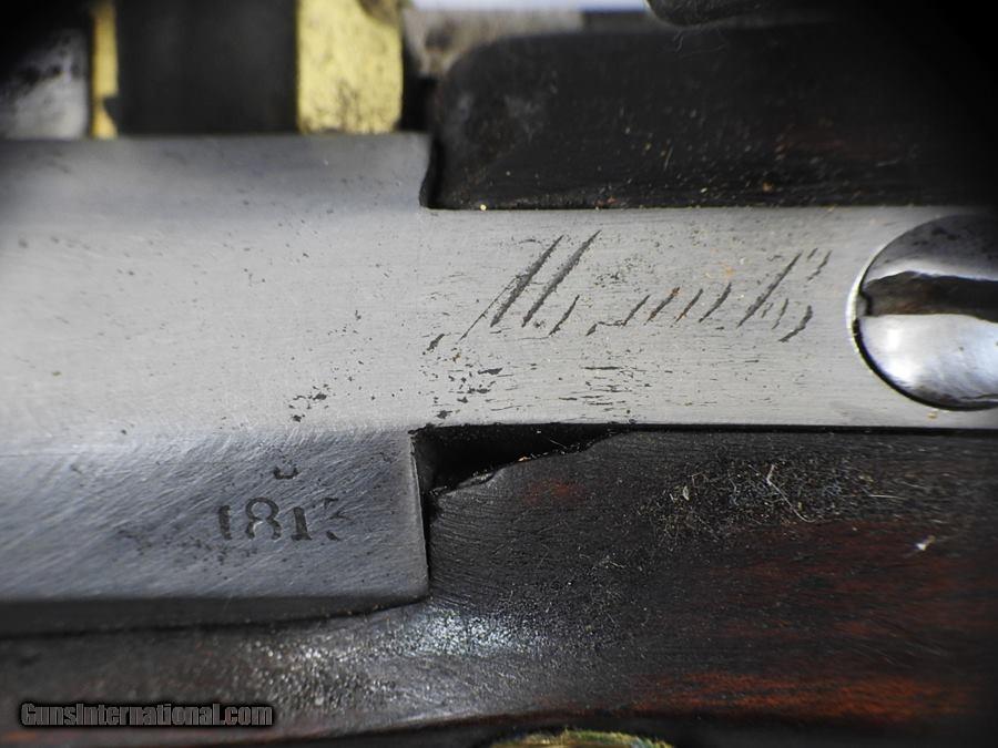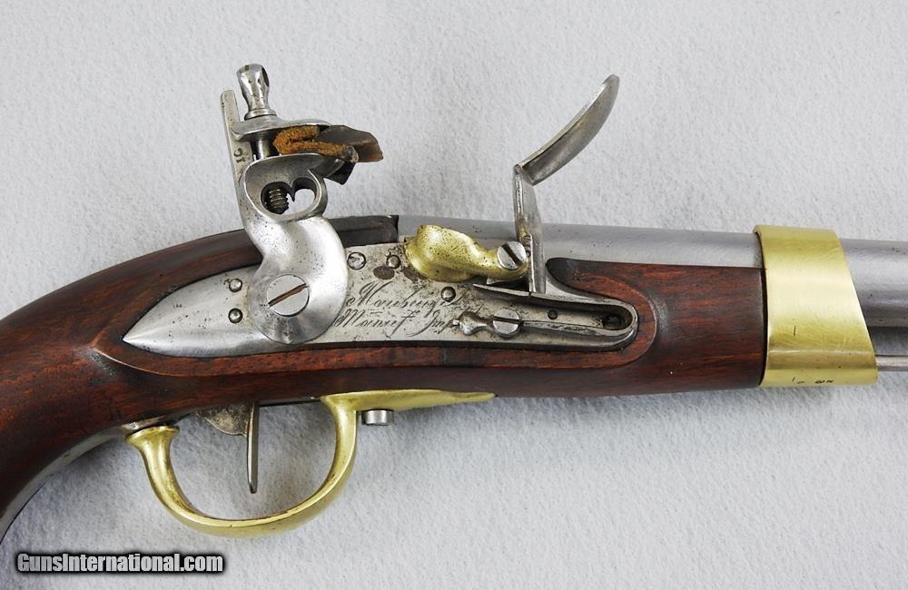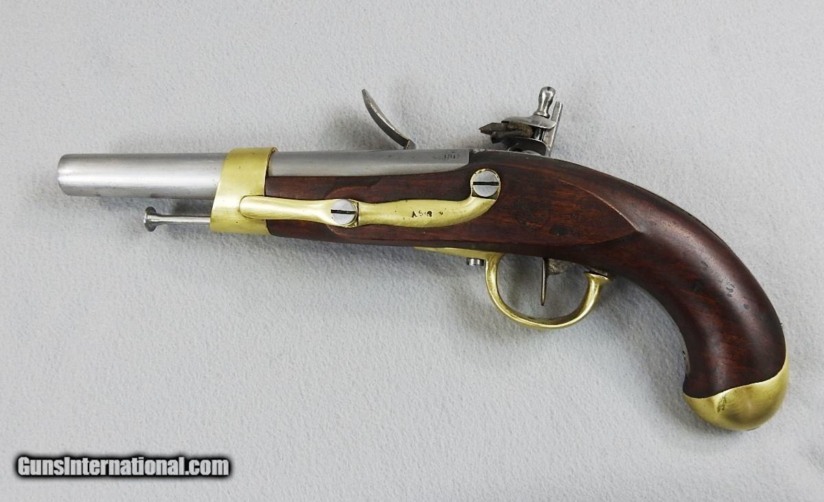 Description: This is a French Napoleonic Wars 69 caliber Maubeuge Arsenal 1813 dated flintlock pistol. This one has two cartouches on the left and an 1813 date on the barrel. They were made from 1806 to 1814. The condition is very good crisp and tight and will still make a very good spark when the flint hits the frizzon. This one was lightly cleaned because the brass was polished. All of the markings are sharp and crisp. There are inspector markings in numerous spots. I would consider trades for pre 1899 ANTIQUE PISTOLS and rifles on any of my items.. WHAT DO YOU HAVE TO TRADE? Ask about our 30-90 day lay-away program. We accept Bank Check, Money order, Personal checks or wire transfer. SOLD Antique: Yes Manufacturer: Maubeuge Arsenal Model: Flintlock |
