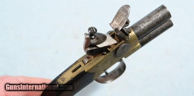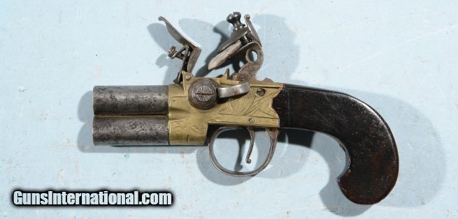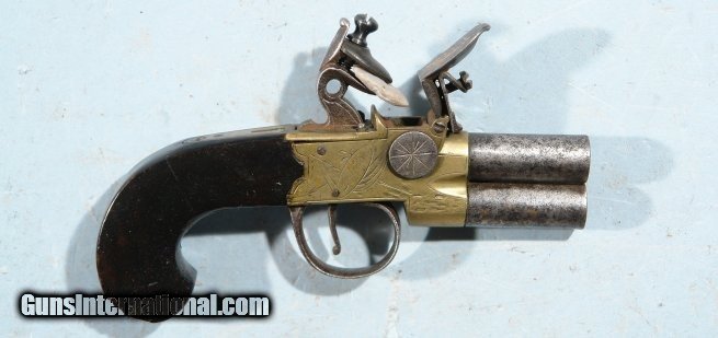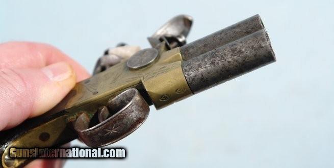 GEORGE III FLINTLOCK TAP ACTION OVER/UNDER TURN BARREL BRASS FRAME POCKET PISTOL SIGNED G. GOODWIN & CO./LONDON CIRCA 1800-10.