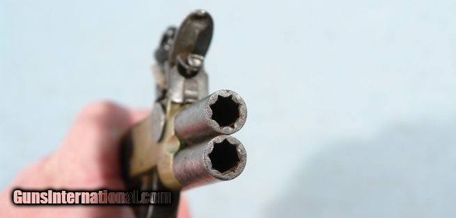 Description: GEORGE III FLINTLOCK TAP ACTION OVER/UNDER TURN BARREL BRASS FRAME POCKET PISTOL SIGNED G. GOODWIN & CO./LONDON CIRCA 1800-10. 6” o/a with 1 ½” round .41 cal. barrels stamped with London proofs on the underside of the frame. Stand of Flags engraved brass frame signed alternately “G. GOODWIN & CO.” and “’LONDON”. All original with the exception of the top jaw and screw which are correct modern replacements. Complete with exception of the sliding safety bar behind the hammer which has been removed. Original walnut grip. Very good plus and in working order. George Goodwin & Co. worked in London between 1807 and 1813. Handsome and scarce. SOLD Antique: Yes |