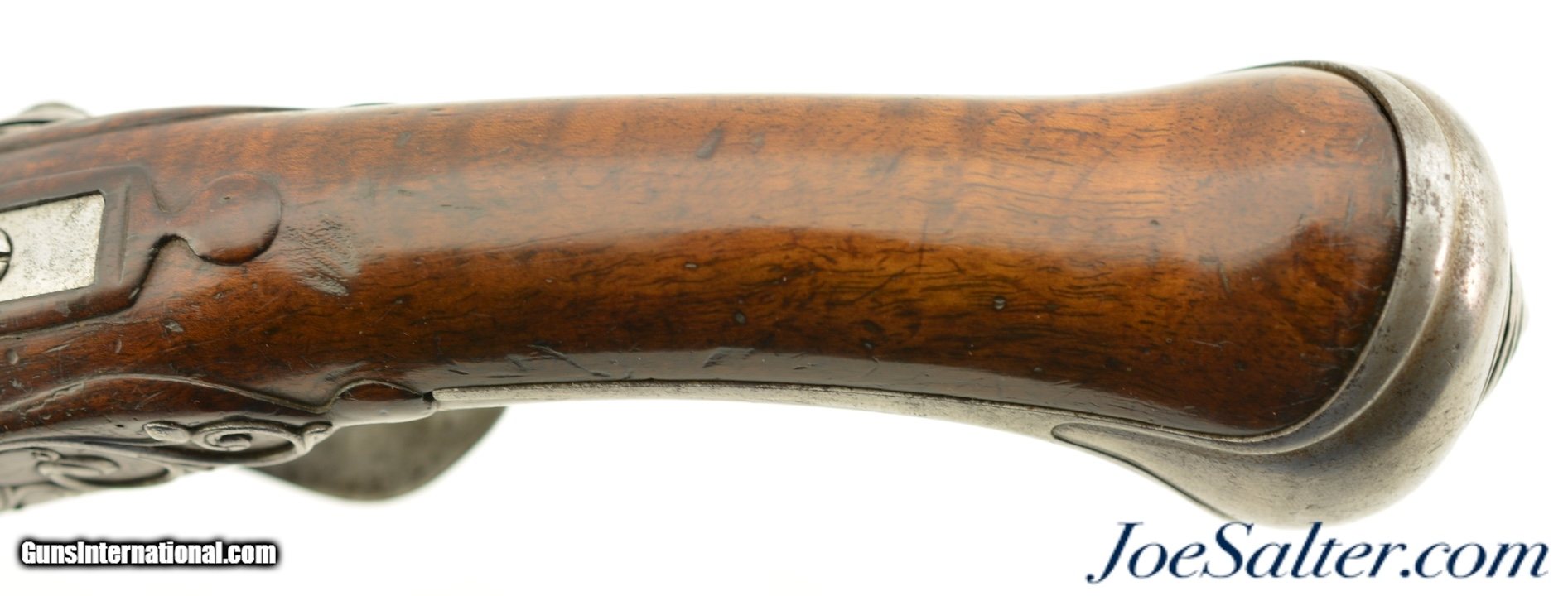 Description: NSN, .62 Caliber, 14 1/4" barrel with a good, lightly pitted bore. This is an elegant pistol of typical Germanic design, that has an overall bright gray patina with darkly mottled freckling throughout, as well as some spots of pinprick pitting at the breech end, around the touchhole, and within the pan. The lockplate is maker marked, however the name is not legible. The metal does not have any engraving otherwise, but does have several shaped embellishments throughout the metal furniture, especially the ornate pierced sideplate. The pin-fastened walnut stock has small handling marks and minor blemishes scattered about the old oil finish. The bulbous iron buttcap has thin plum-brown freckling, and the rear trigger guard strap is slightly loose. The lock is tight and functions flawlessly, and the original iron ramrod is still present. This is a handsome pistol, and is in very good plus condition overall. Antique SOLD Antique: Yes |