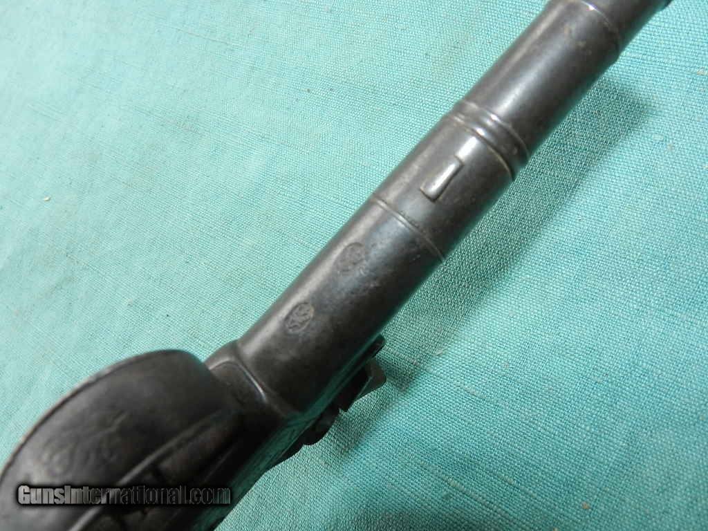 Description: SOLD>>>>An early Queen Anne Flintlock pistol with a 4" tapered barrel, and clear under barrel proofs of a crown over CP and crown over V. The action works well when the hammer is pulled back and the trigger is released, This gun gets a shower of sparks.Bore measures about .40to .45cal.The exterior metal is dark but not pitted of sanded down. The English walnut stock is very good, with no splits or cracks.Frame is chisel engraved on both sides and the top and bottom tang. The gun measures about 8" over all and these guns were used by spies during the Rev. War! My description is the gun you get, not very often do I miss something, I tell you all I see. Check my inventory of rare grips, unusual gun parts, barrels and holsters. Shipping may be higher than stated as shippers raise their prices twice year without notice! When buying a gun always have it examined by a competent gunsmith before shooting. To buy a gun from me you must get a direct email for me, with details, and shipping cost. We don’t have a web site .I prefer money orders or a check. Item ships when funds come in. If you can only pay with a card let me know. I try to keep guns affordable, which means I make less money than most dealers. You won’t get altitude sickness, or nose bleed, with my prices! I consistently have the best selection of older guns If you attempt to buy, you must still contact us for details . Best to email to buy. Sometimes a local person can stop buy and purchase before the gun is removed. Sometimes not home to get calls. Some guns are required shipment to a gun dealer near you for a transfer to you when it arrives. Otherwise many older or black powder guns ship to your door. With the widest selection of older guns at great prices, We don’t have a store, and sell on the internet only. I’m easy to get along with. Thank You. SOLD Antique: Yes |