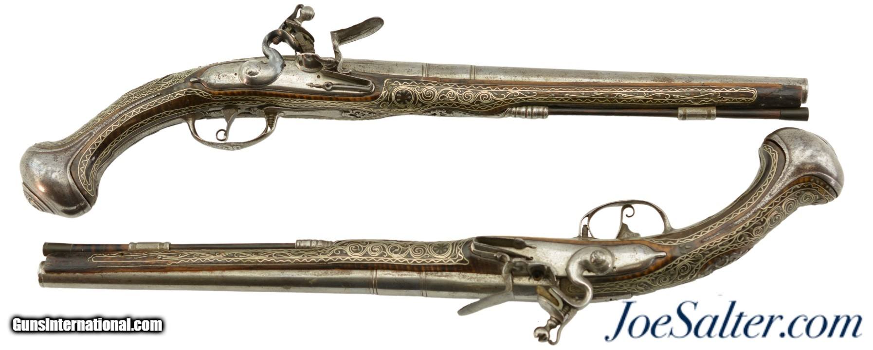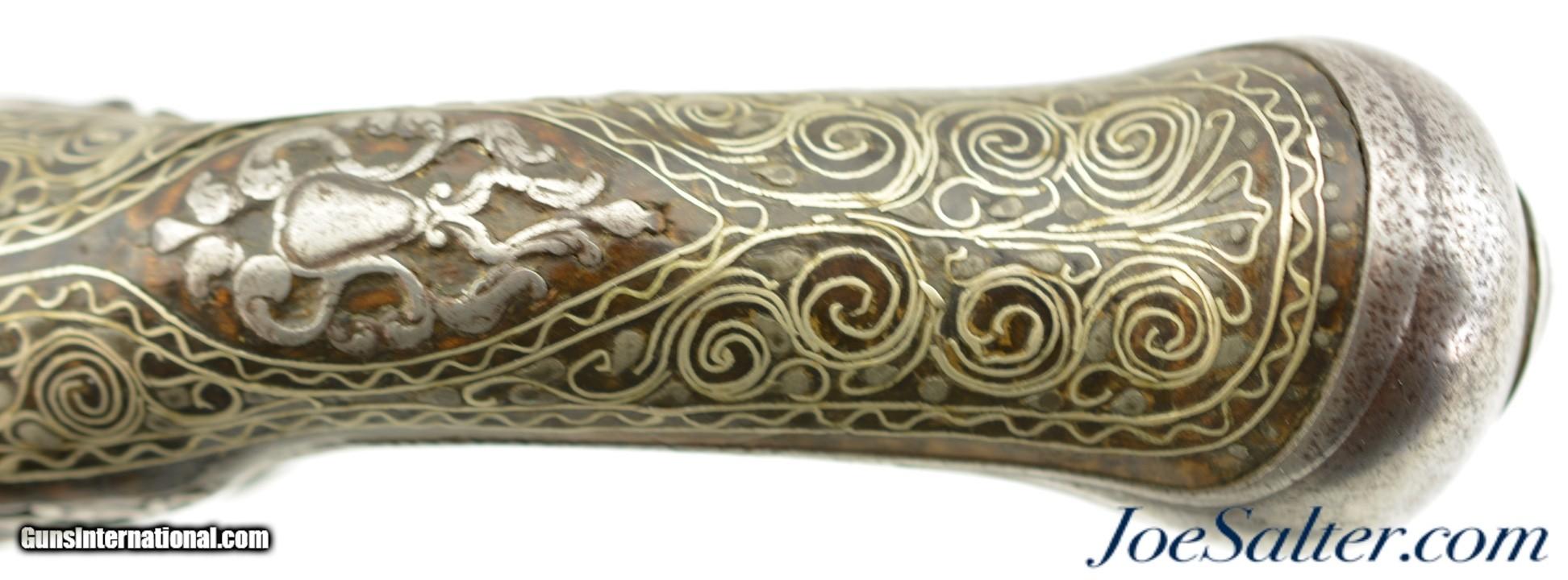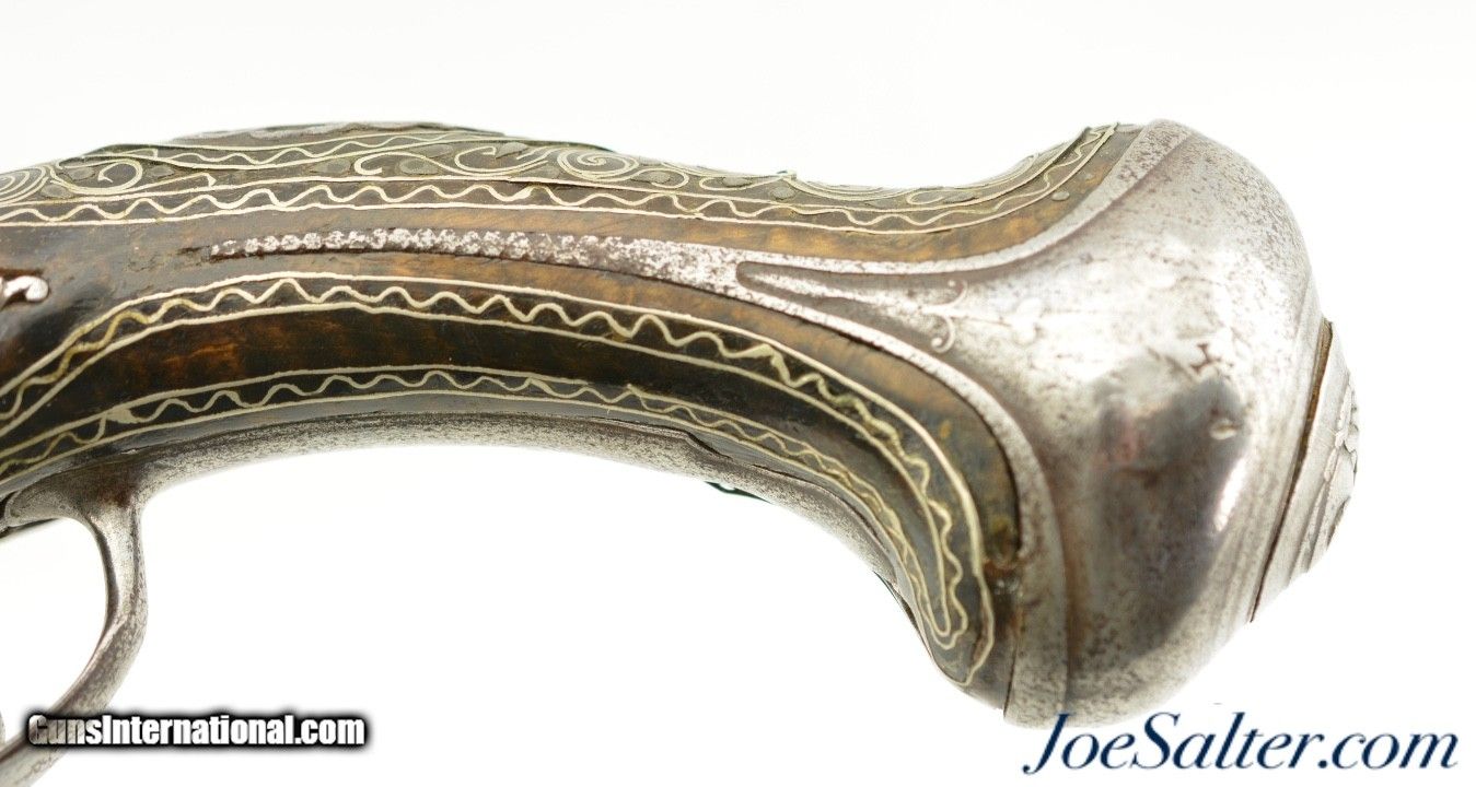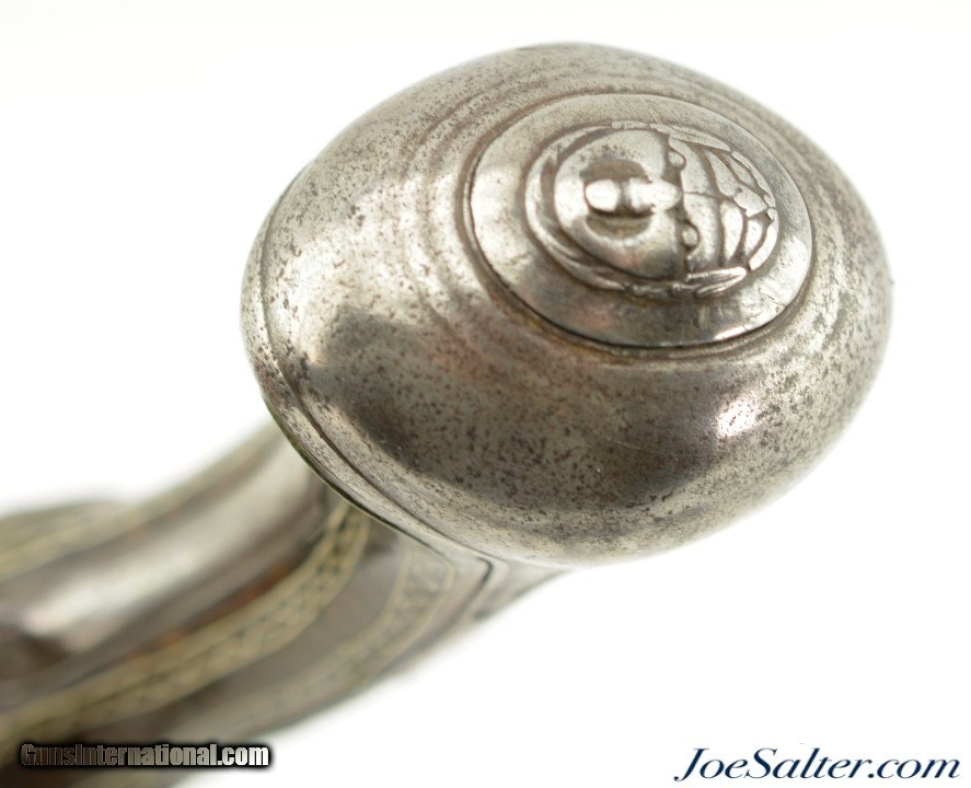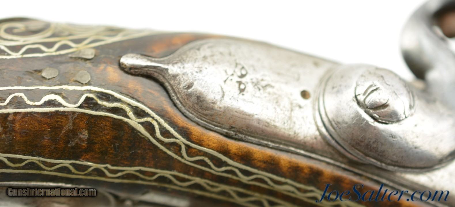 Description: NSN, 20 Bore (.61 Caliber), 13 3/16" barrels with fair, pitted bores. This is a handsome pair of pistols, measuring about 20 1/4" overall, with steel barrels, locks, and mountings, as well as extensive wire inlay decorations along the stocks. The metal has an overall bright gray patina, and exhibits evidence of extensive polishing over the years. Faint markings can still be seen on the barrel, including the remnants of a maker’s name on one of the pistols, but it is only barely visible and illegible. There are no visible maker’s names on the locks, which are both equipped with pierced bridles. The walnut stocks have an almost tiger striped grain, and have virtually complete wire inlays installed throughout. Some of the wire has come loose in spots, but remains in place, forming geometric borders surrounding arabesque swirls and rosettes. The wood remains in very good-fine shape, with one of the pistols having a linear chip at the toe of the bulbous butt, and wood screws protruding from the undersides of the stocks into the front branches of the trigger guards. Both locks are fully functional and both pistols are equipped with non-original wooden ramrods. The former owner identified the pistols as being the product of Robert Delany (or Delaney), a London maker who operated 1720 & 1725, and while the pistols are very similar in configuration to known examples, we are unaware of any with a similar wire inlay treatment along the stocks. That said, this is a handsome pair of pistols and would make a great addition to any collection. Antique; Antique: Yes Price: $4,895.00 Contact Seller |