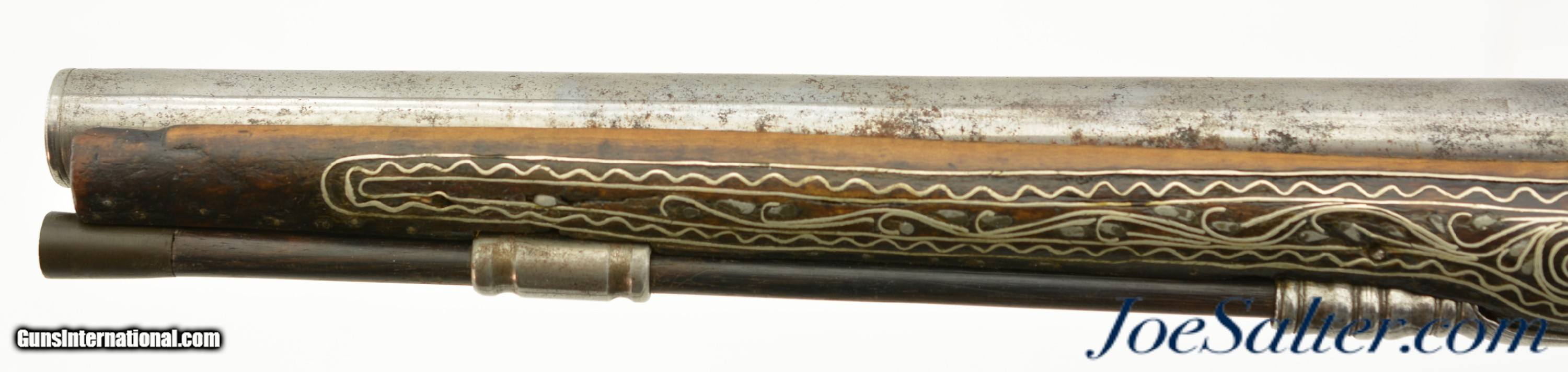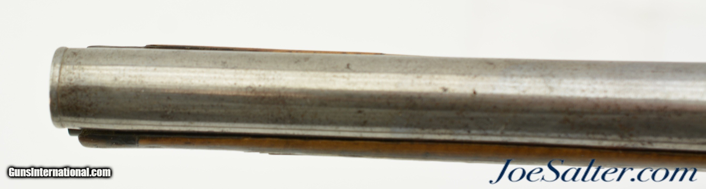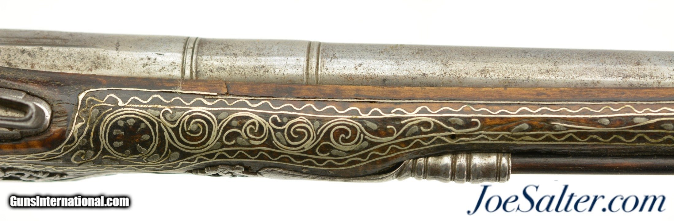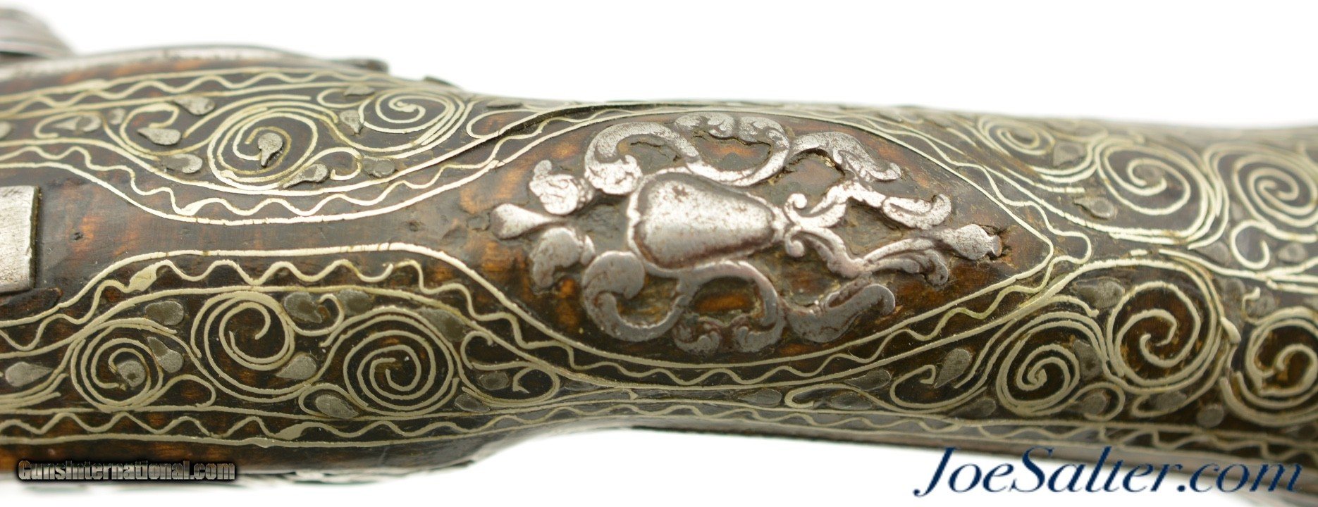 Description: NSN, 20 Bore (.61 Caliber), 13 3/16" barrels with fair, pitted bores. This is a handsome pair of pistols, measuring about 20 1/4" overall, with steel barrels, locks, and mountings, as well as extensive wire inlay decorations along the stocks. The metal has an overall bright gray patina, and exhibits evidence of extensive polishing over the years. Faint markings can still be seen on the barrel, including the remnants of a maker’s name on one of the pistols, but it is only barely visible and illegible. There are no visible maker’s names on the locks, which are both equipped with pierced bridles. The walnut stocks have an almost tiger striped grain, and have virtually complete wire inlays installed throughout. Some of the wire has come loose in spots, but remains in place, forming geometric borders surrounding arabesque swirls and rosettes. The wood remains in very good-fine shape, with one of the pistols having a linear chip at the toe of the bulbous butt, and wood screws protruding from the undersides of the stocks into the front branches of the trigger guards. Both locks are fully functional and both pistols are equipped with non-original wooden ramrods. The former owner identified the pistols as being the product of Robert Delany (or Delaney), a London maker who operated 1720 & 1725, and while the pistols are very similar in configuration to known examples, we are unaware of any with a similar wire inlay treatment along the stocks. That said, this is a handsome pair of pistols and would make a great addition to any collection. Antique; Antique: Yes Price: $4,895.00 Contact Seller |