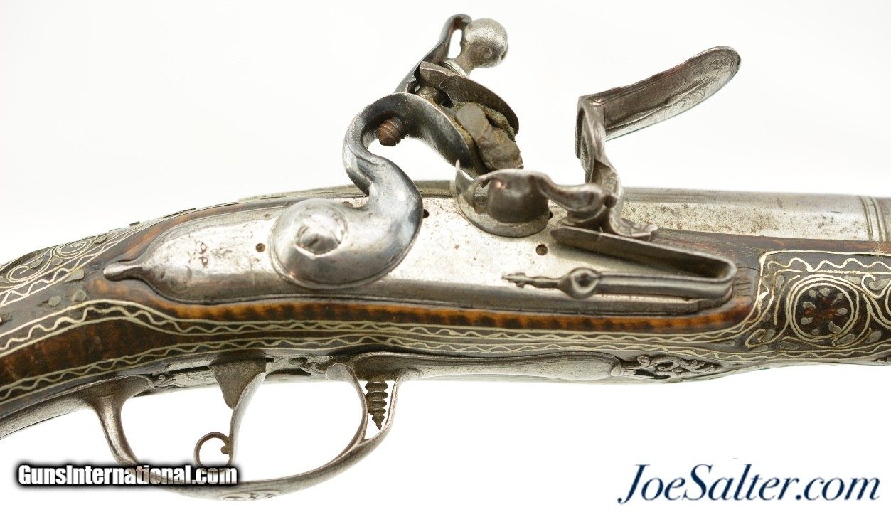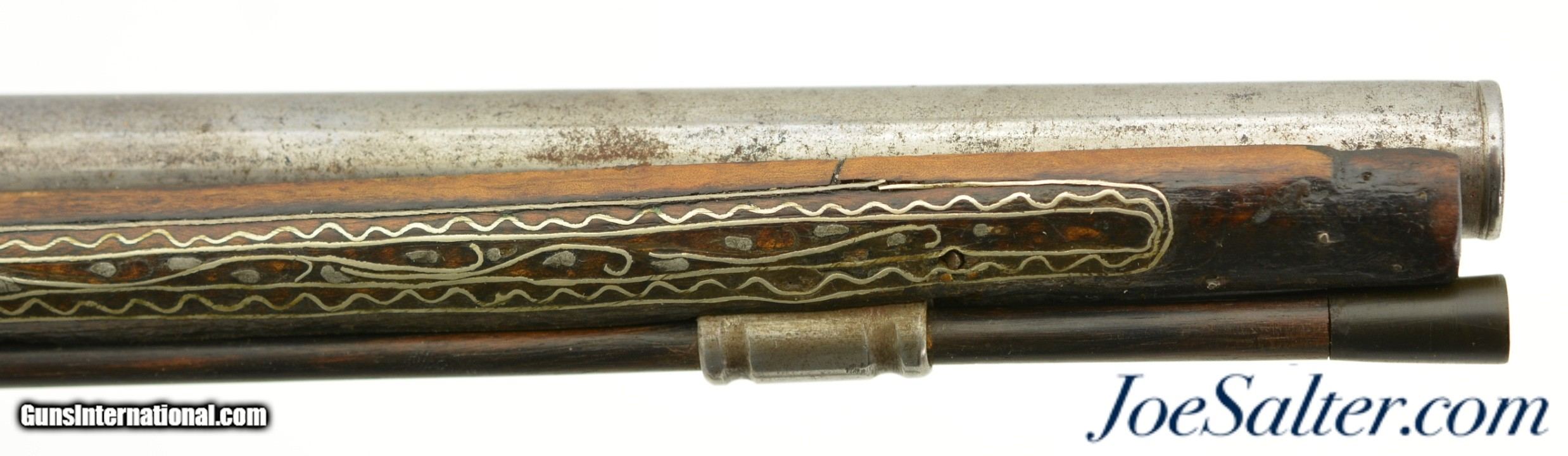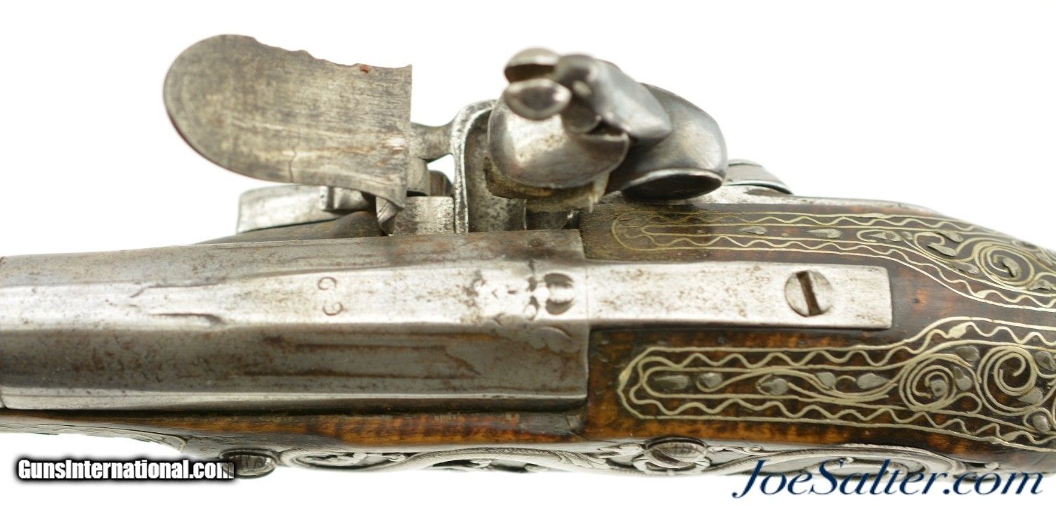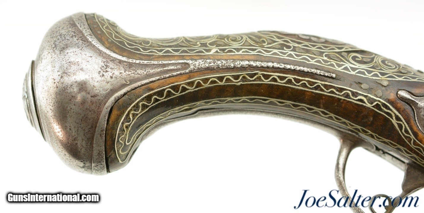Description: NSN, 20 Bore (.61 Caliber), 13 3/16" barrels with fair, pitted bores. This is a handsome pair of pistols, measuring about 20 1/4" overall, with steel barrels, locks, and mountings, as well as extensive wire inlay decorations along the stocks. The metal has an overall bright gray patina, and exhibits evidence of extensive polishing over the years. Faint markings can still be seen on the barrel, including the remnants of a maker’s name on one of the pistols, but it is only barely visible and illegible. There are no visible maker’s names on the locks, which are both equipped with pierced bridles. The walnut stocks have an almost tiger striped grain, and have virtually complete wire inlays installed throughout. Some of the wire has come loose in spots, but remains in place, forming geometric borders surrounding arabesque swirls and rosettes. The wood remains in very good-fine shape, with one of the pistols having a linear chip at the toe of the bulbous butt, and wood screws protruding from the undersides of the stocks into the front branches of the trigger guards. Both locks are fully functional and both pistols are equipped with non-original wooden ramrods. The former owner identified the pistols as being the product of Robert Delany (or Delaney), a London maker who operated 1720 & 1725, and while the pistols are very similar in configuration to known examples, we are unaware of any with a similar wire inlay treatment along the stocks. That said, this is a handsome pair of pistols and would make a great addition to any collection. Antique; Antique: Yes Price: $4,895.00 Contact Seller |