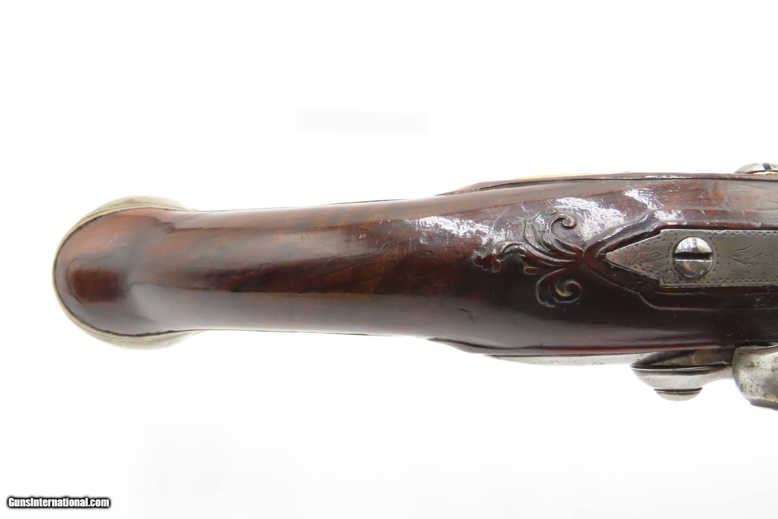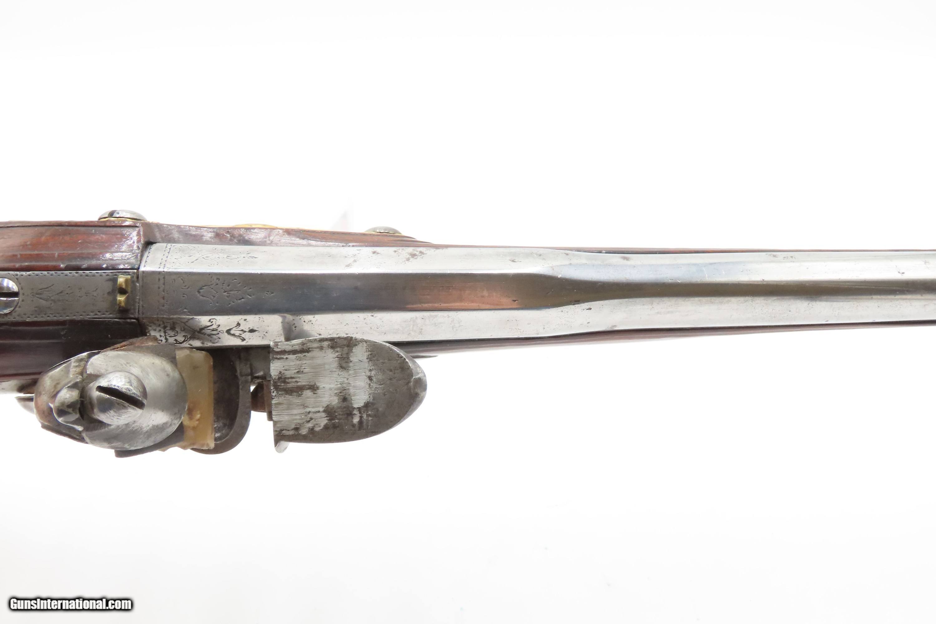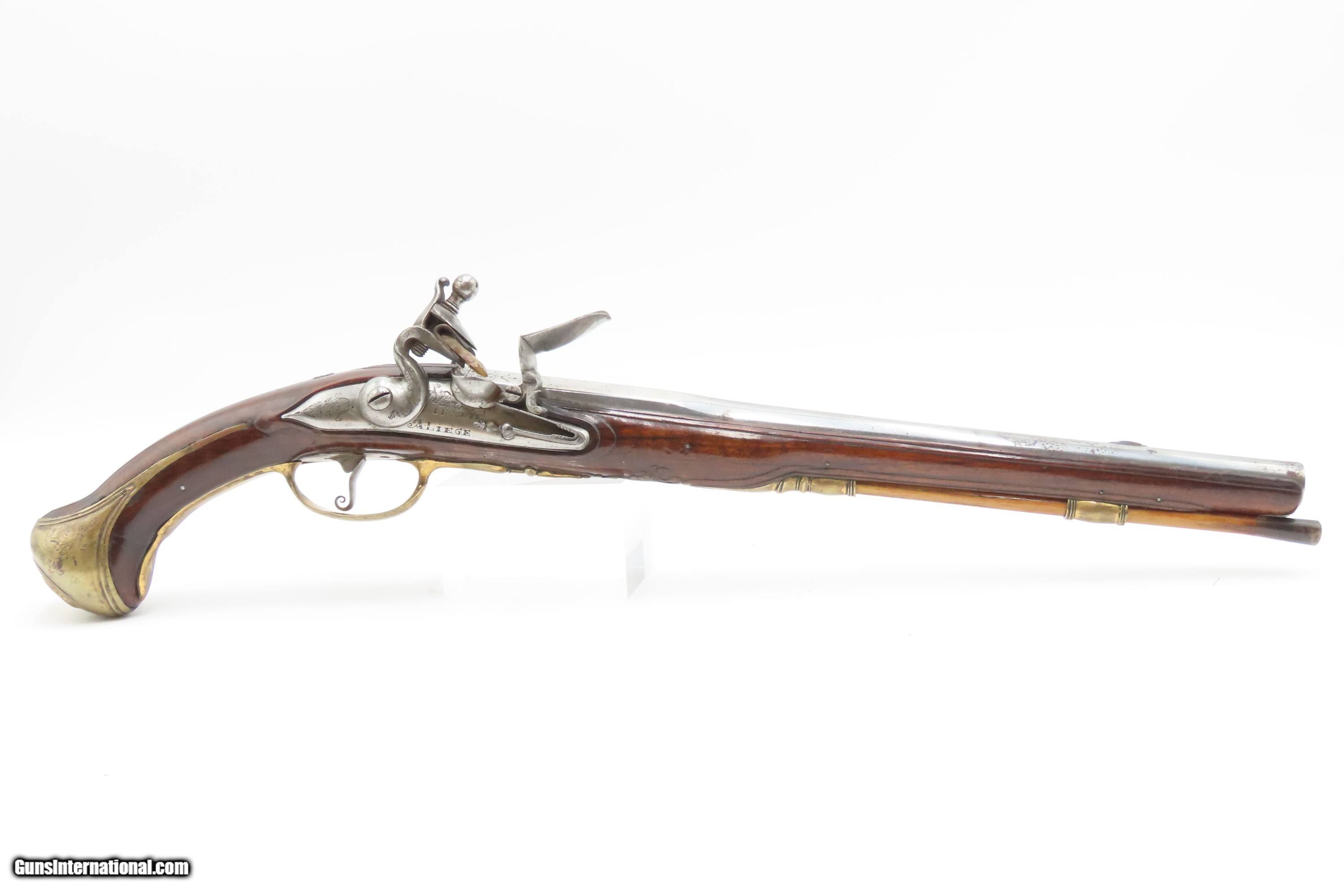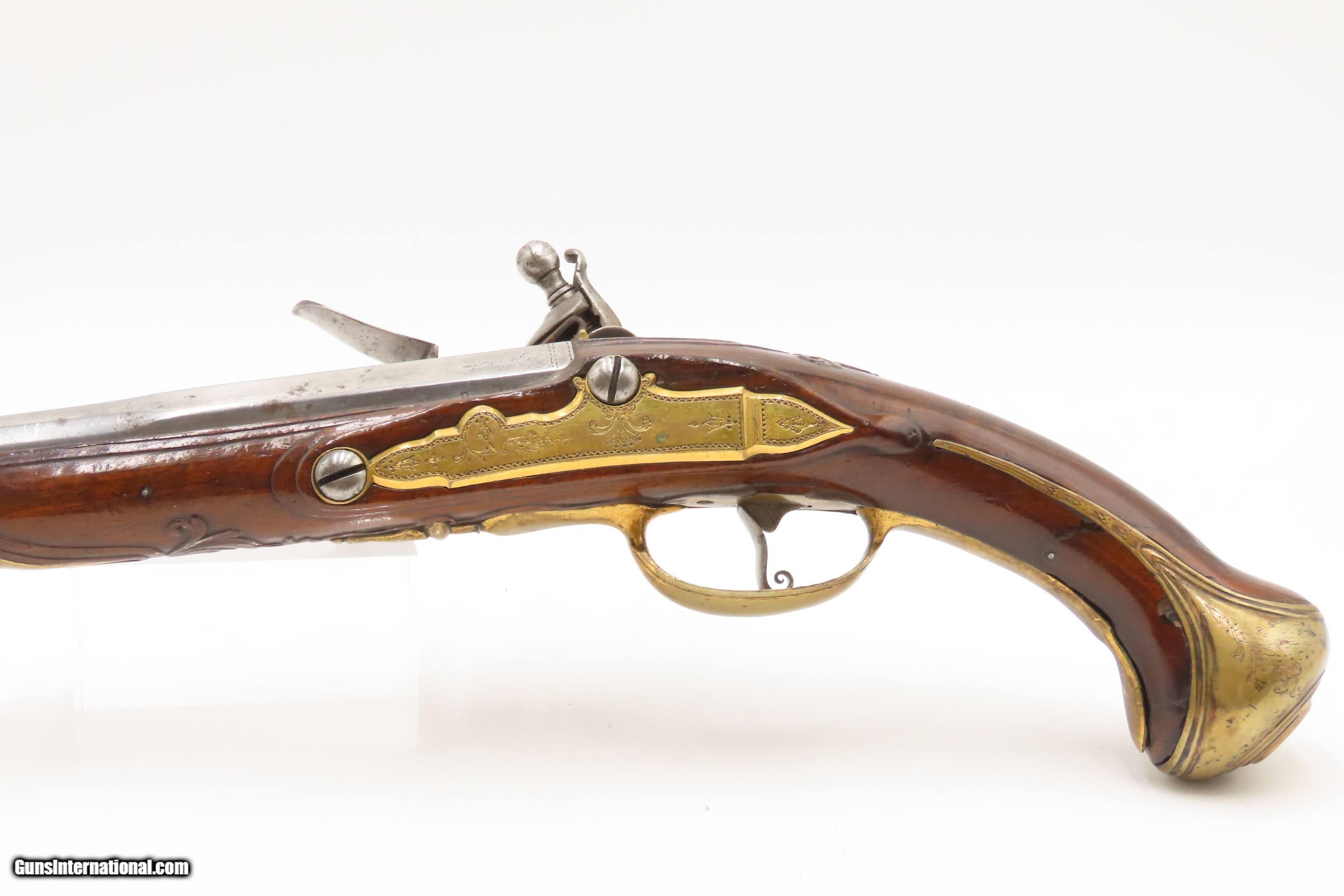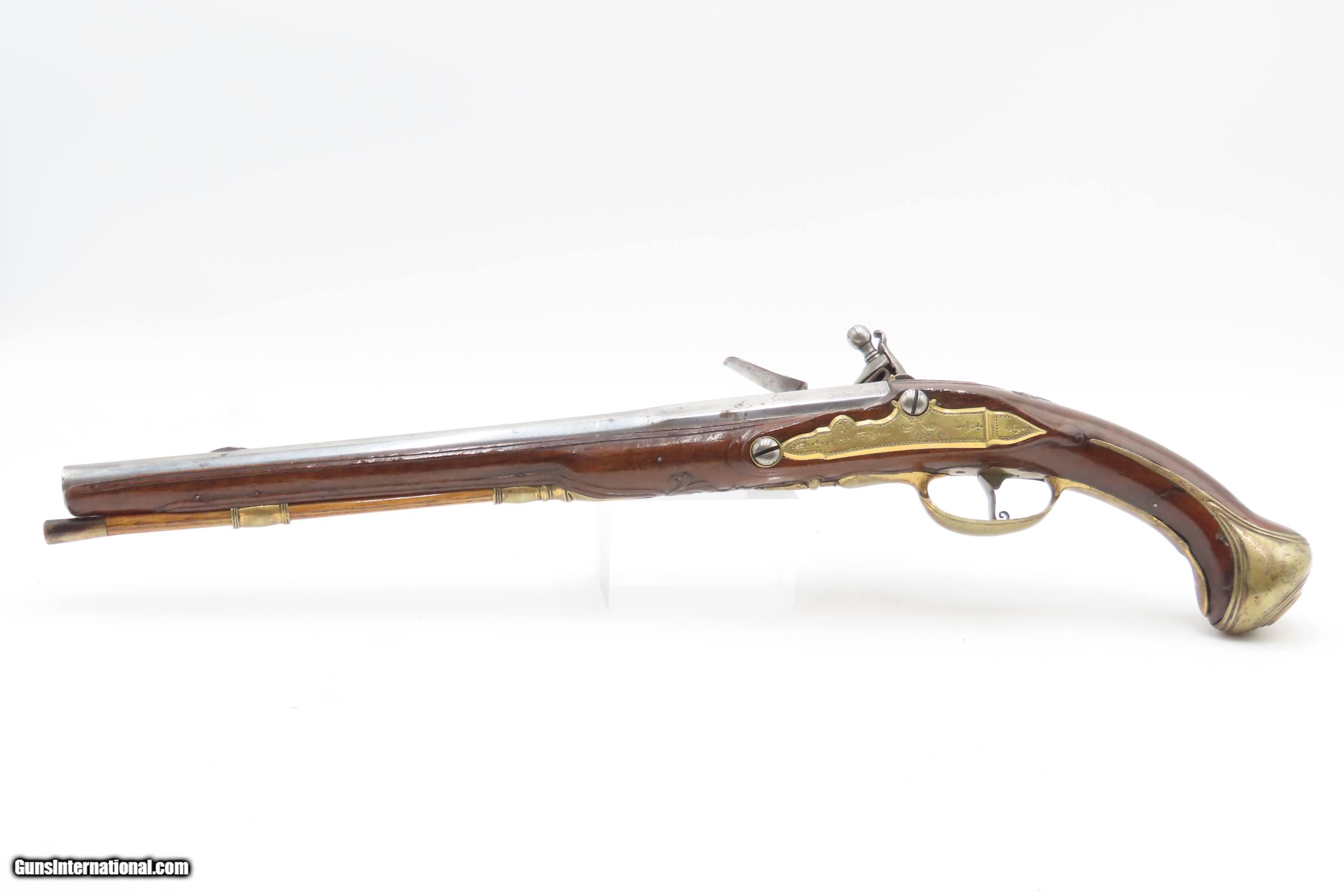 Description: Late 1700s LECONTE/A.LIEGE Marked Antique BELGIAN Flintlock HOLSTER Pistol ENGRAVED .65 Cal. LARGE Self Defense HORSE Pistol Here Ancestry Guns presents an antique Belgian Flintlock Horse/Holster Pistol, made circa the late-1700s in Liege, Belgium. This 18th century pistol from Continental Europe and could have been in service during the American Revolutionary War as well as possibly the Napoleonic Wars. Like the cavalry pistols from other nations such as Britain and France, this was a large, single shot pistol with an engraved brass pommel that could be used as a club when the single shot was expended. Here is a fantastic, scarce and historical European Horse / Holster Pistol from one of the most pivotal times in European history! This pistol is full-sized, made for wearing on a belt or carrying on the pommel holster of a horse. Then as now, rifles and muskets were the primary arm of the day, useful for everything from hunting to combat. Pistols were certainly not as numerous but still very useful for combat since most firearms at this time were limited to a single shot. Imagine if one discharged their single shot firearm only to miss or have another enemy close the distance. A man expecting trouble might carry as many pistols on his person as he could. The true flintlock continued to be in common use for over two centuries, replaced by percussion cap and, later, the cartridge-based systems in the early-to-mid 19th century. The overall condition is very good. This example has been refurbished. Strong action. The bore has some shimmer but is mostly dark, and remains smooth. Bright gray patina. Lightly engraved and carved. Solid wood with less than average wear. Markings are sharp. Own the original! This is a legitimate antique and not a reproduction. Barrel is 13-3/8 inches. Caliber: .65 Flintlock Overall condition as seen in photos. Very Fast. Very Safe. FREE SHIPPING WORLDWIDE. Delivered directly to your door by express mail! Guaranteed AUTHENTIC & Includes CERTIFICATE OF AUTHENTICITY. $2300 #259518 SOLD Antique: Yes |