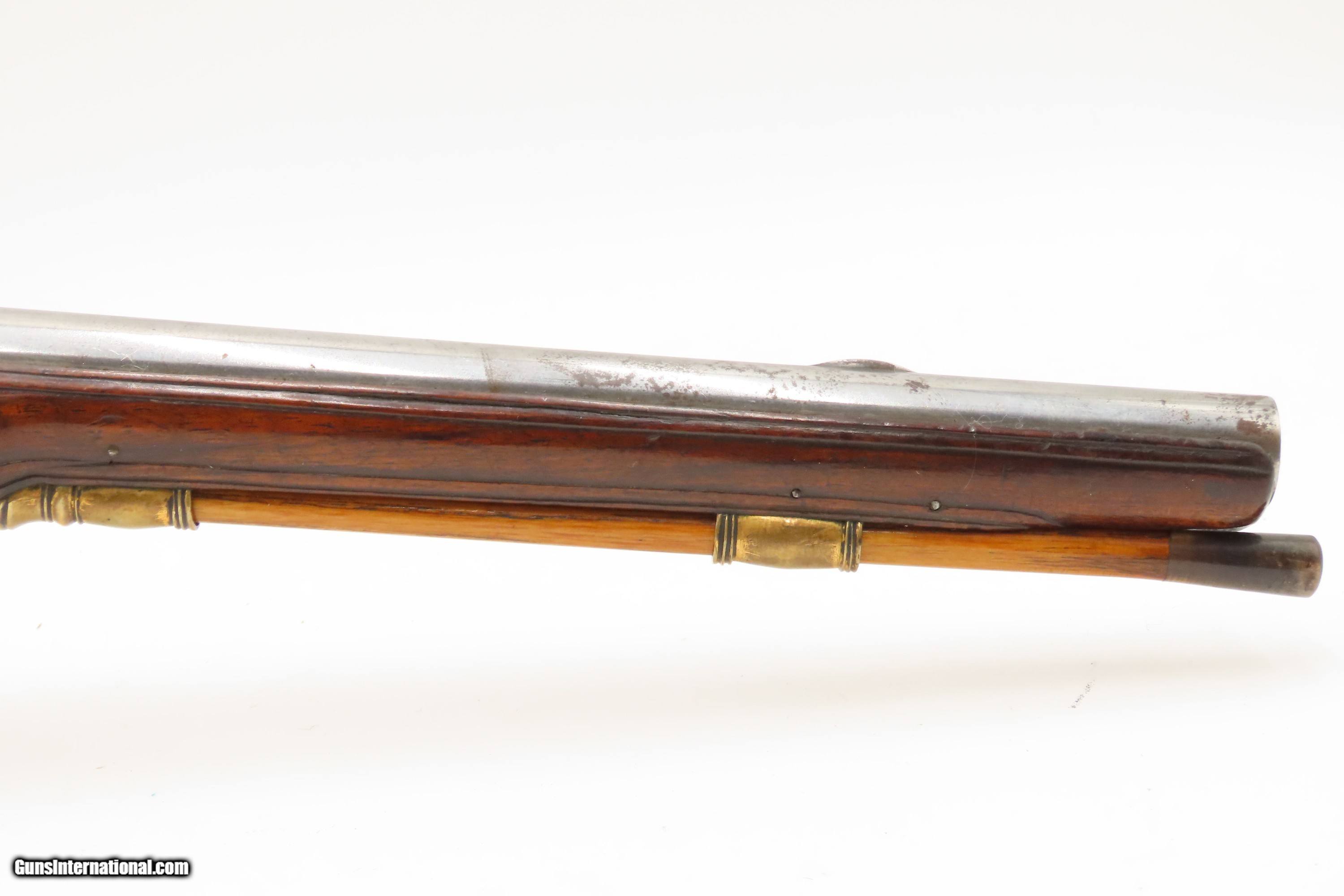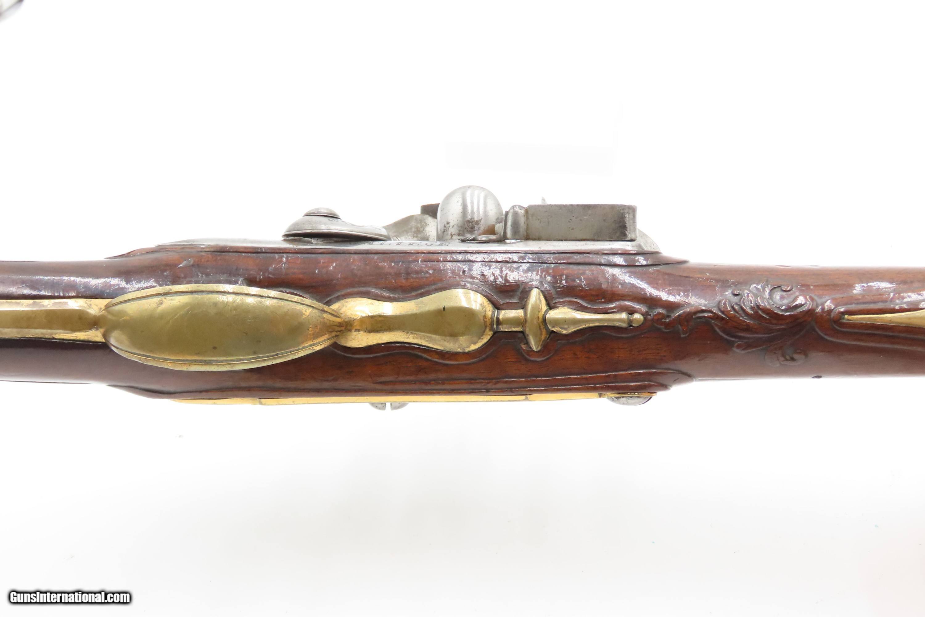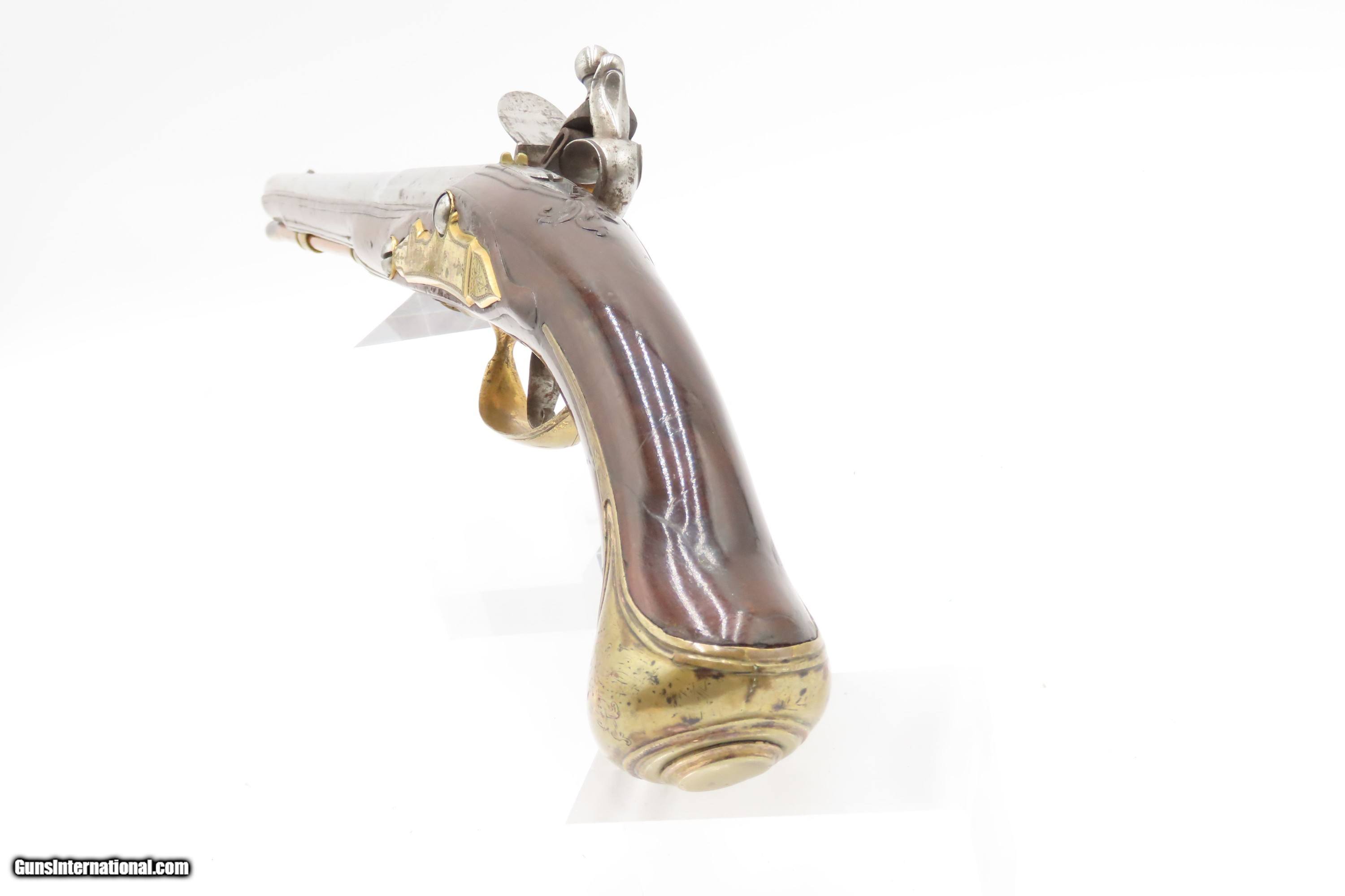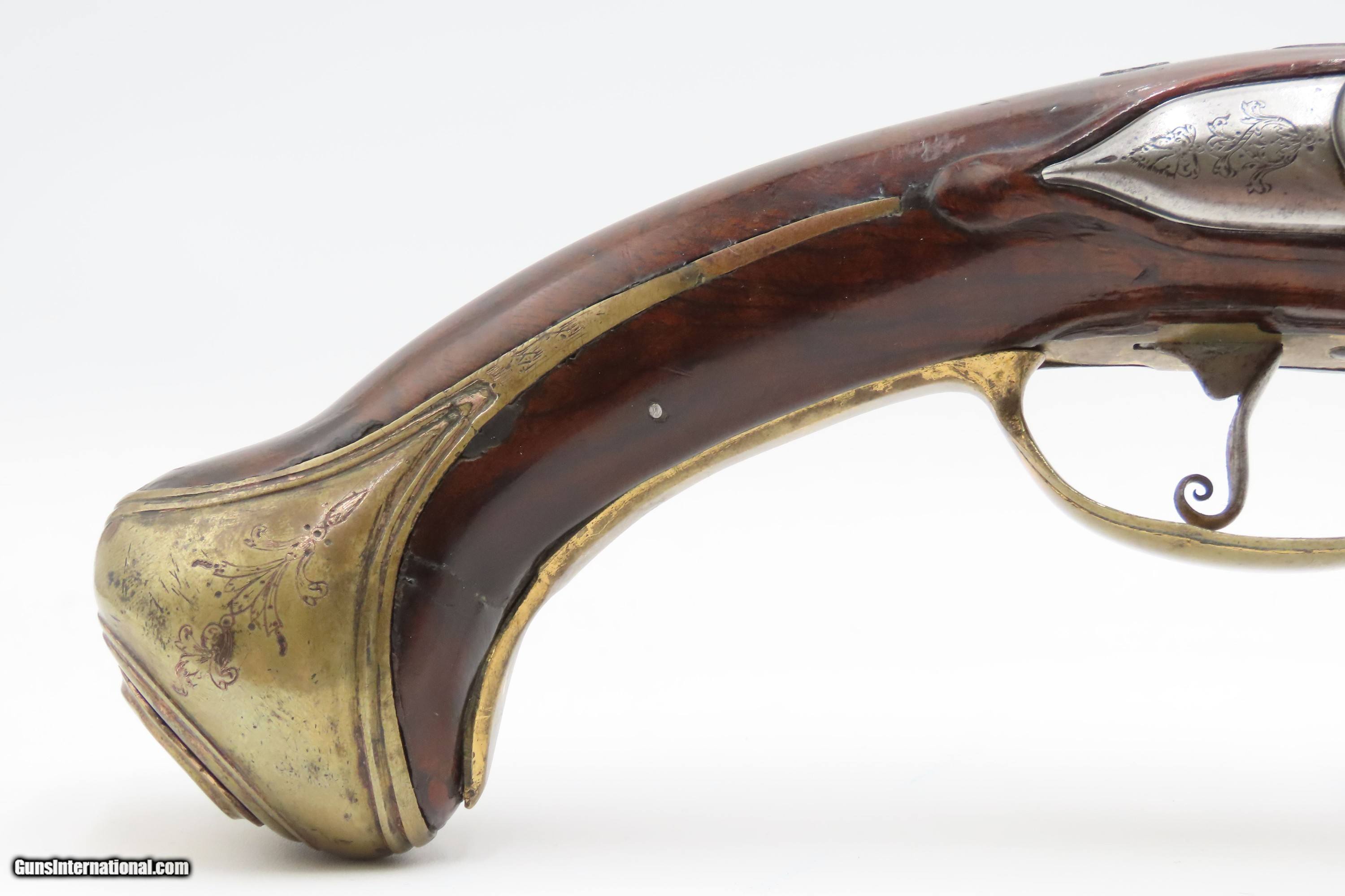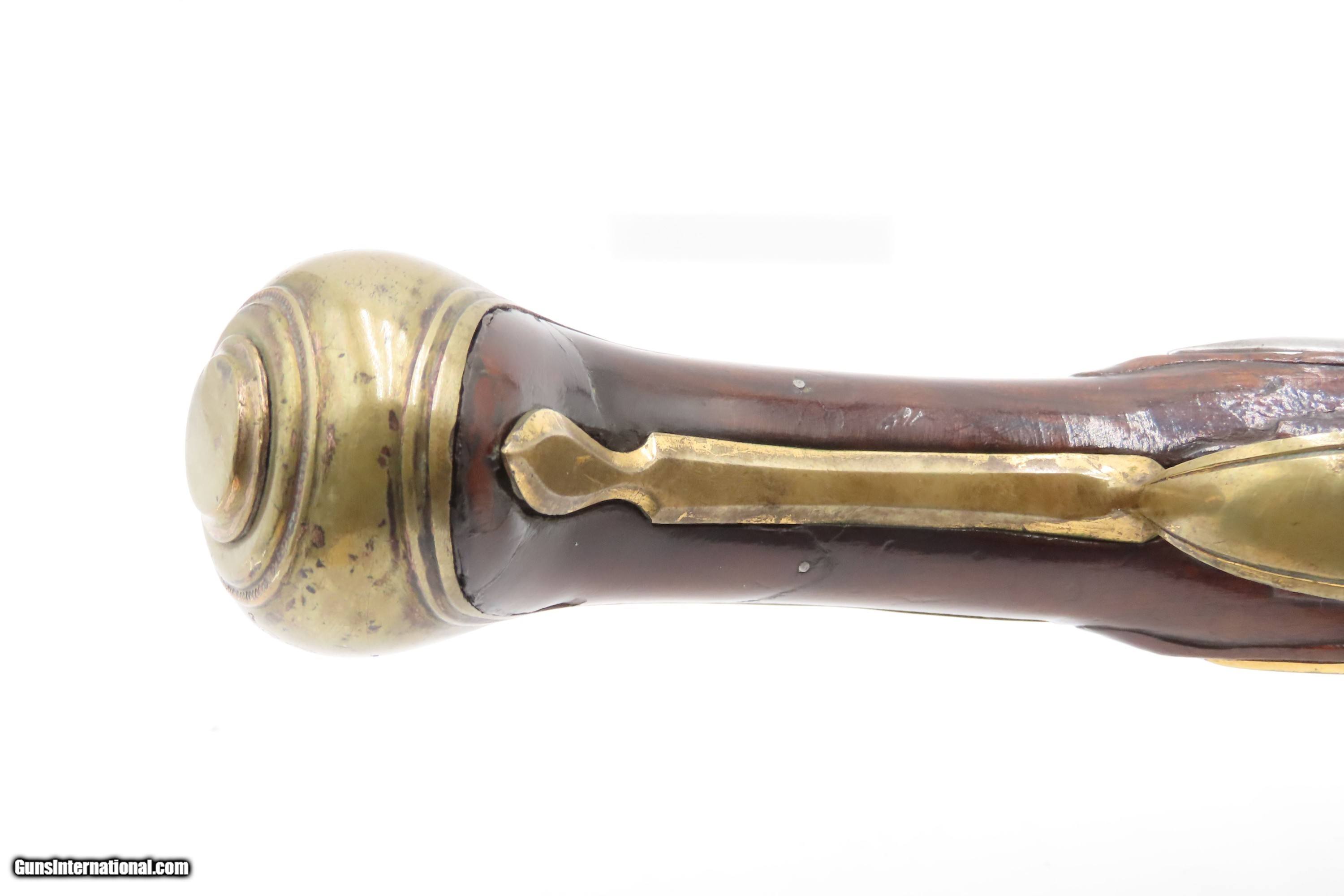 Description: Late 1700s LECONTE/A.LIEGE Marked Antique BELGIAN Flintlock HOLSTER Pistol ENGRAVED .65 Cal. LARGE Self Defense HORSE Pistol Here Ancestry Guns presents an antique Belgian Flintlock Horse/Holster Pistol, made circa the late-1700s in Liege, Belgium. This 18th century pistol from Continental Europe and could have been in service during the American Revolutionary War as well as possibly the Napoleonic Wars. Like the cavalry pistols from other nations such as Britain and France, this was a large, single shot pistol with an engraved brass pommel that could be used as a club when the single shot was expended. Here is a fantastic, scarce and historical European Horse / Holster Pistol from one of the most pivotal times in European history! This pistol is full-sized, made for wearing on a belt or carrying on the pommel holster of a horse. Then as now, rifles and muskets were the primary arm of the day, useful for everything from hunting to combat. Pistols were certainly not as numerous but still very useful for combat since most firearms at this time were limited to a single shot. Imagine if one discharged their single shot firearm only to miss or have another enemy close the distance. A man expecting trouble might carry as many pistols on his person as he could. The true flintlock continued to be in common use for over two centuries, replaced by percussion cap and, later, the cartridge-based systems in the early-to-mid 19th century. The overall condition is very good. This example has been refurbished. Strong action. The bore has some shimmer but is mostly dark, and remains smooth. Bright gray patina. Lightly engraved and carved. Solid wood with less than average wear. Markings are sharp. Own the original! This is a legitimate antique and not a reproduction. Barrel is 13-3/8 inches. Caliber: .65 Flintlock Overall condition as seen in photos. Very Fast. Very Safe. FREE SHIPPING WORLDWIDE. Delivered directly to your door by express mail! Guaranteed AUTHENTIC & Includes CERTIFICATE OF AUTHENTICITY. $2300 #259518 SOLD Antique: Yes |