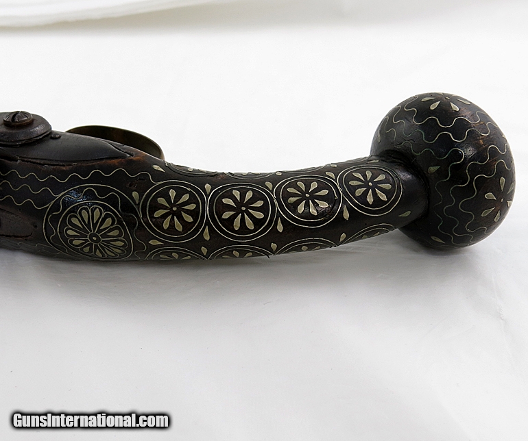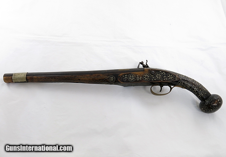 Description: Late 18th/Early 19th Century Ottoman Empire Flintlock Pistol. Stock profusely inlaid (silver?). Overall excellent condition. Measures 20 1/2" in length SOLD Antique: Yes |