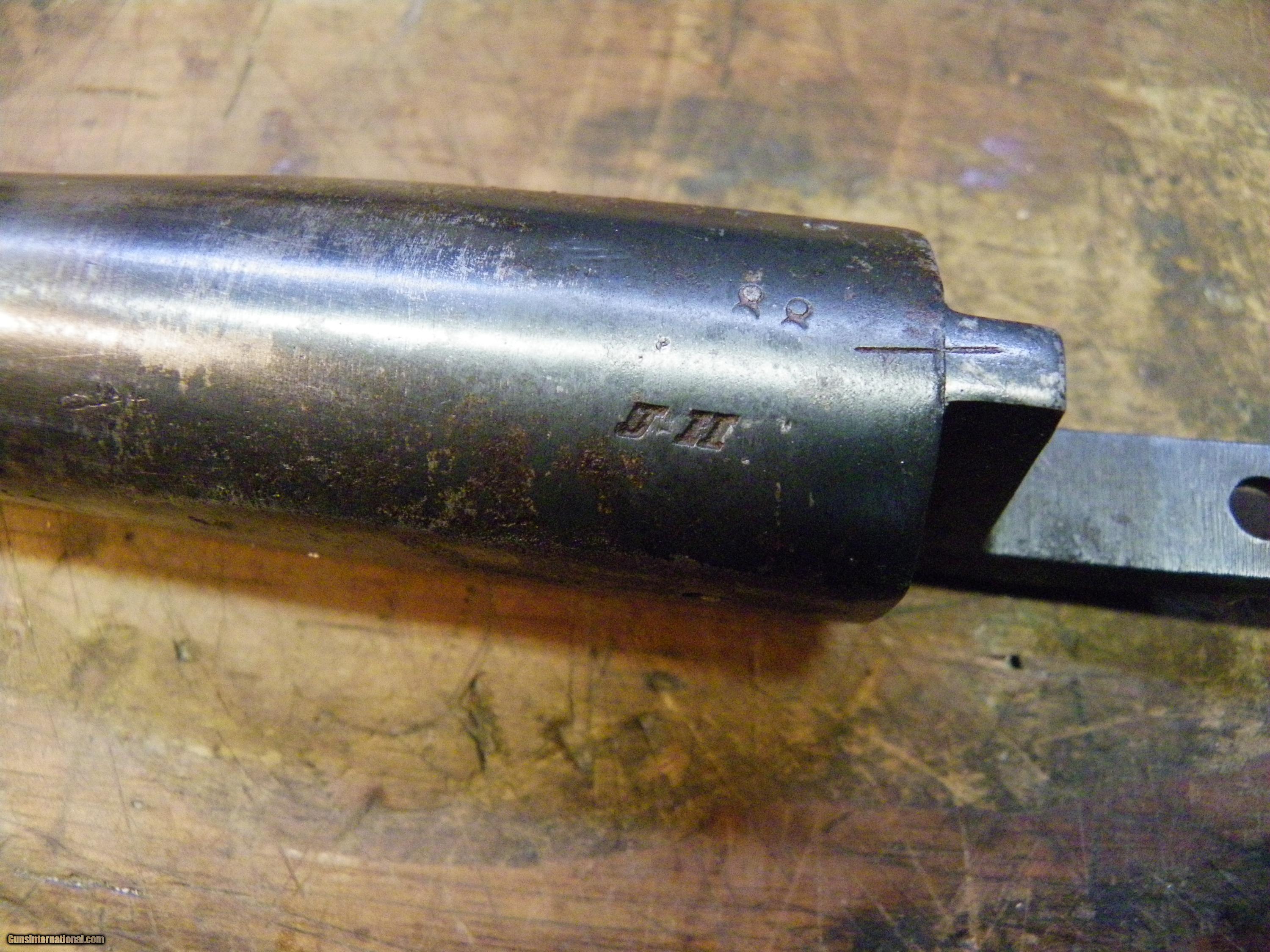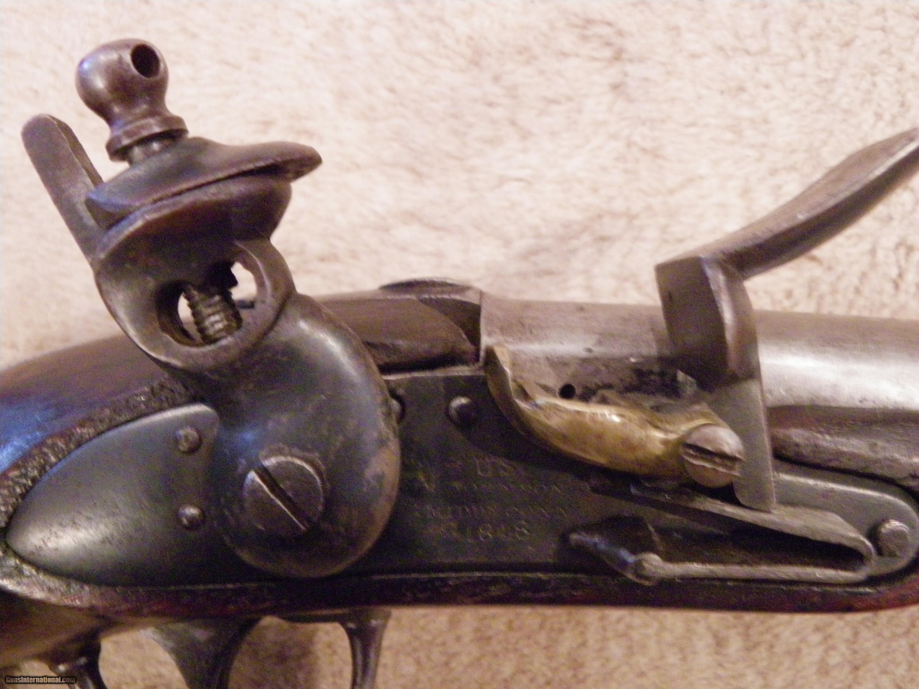 Description: Very nice, original condition, Mexican War era flintlock pistol. .54 cal 8.5" smoothbore barrel with some pitting on inner edge of muzzle. All metal parts are a nice even gray/brown patina. Lock plate retains 95% original blue with rear area going slightly brown. Hammer retains 90+% blue, frizzen about 60% blue/brown patina. Trigger and barrel tang retain 90% blue. Screws are all in very good shape with exception or ram rod guide, which shows some abuse. Stock is fine with some scratches, 2 small cracks, and typical burn damage in area around flash pan. Lock plate marked U.S., R. Johnson, Middn. Conn.,1843. Left side of has 2, very sharp cartouch. Barrel does not have proof marks on top, but they are on the bottom and clearly visible when barrel is removed from stock, see last 3 photos. F 6A-034, or cover of Flayderman's 8th Edition. This is a nice gun! $1600 plus S & H. SOLD Antique: Yes Manufacturer: R. Johnson Model: 1843 Caliber Info: .54 Bore: smooth/dark Condition: fine Metal Condition: excellent gray patina Wood Condition: excellent oil finish Bore Condition: VG+ |