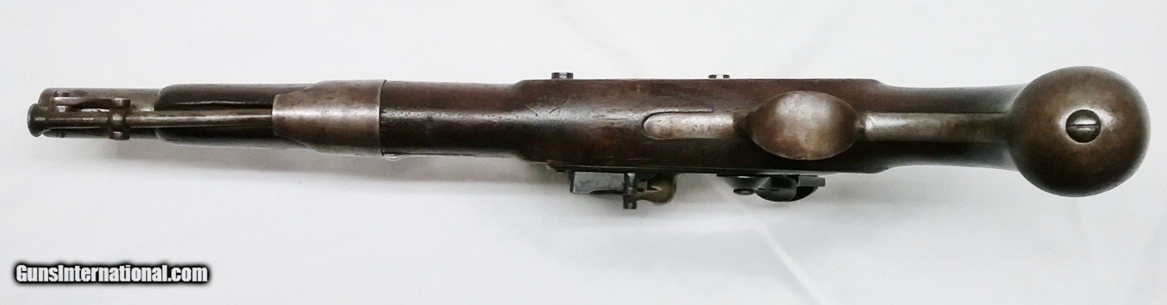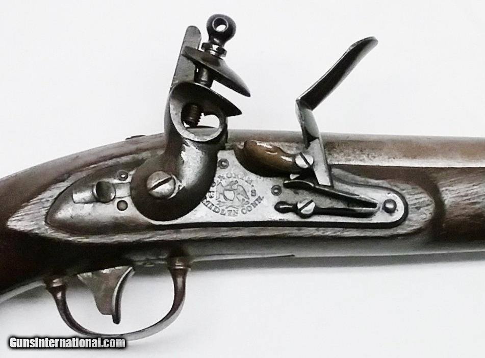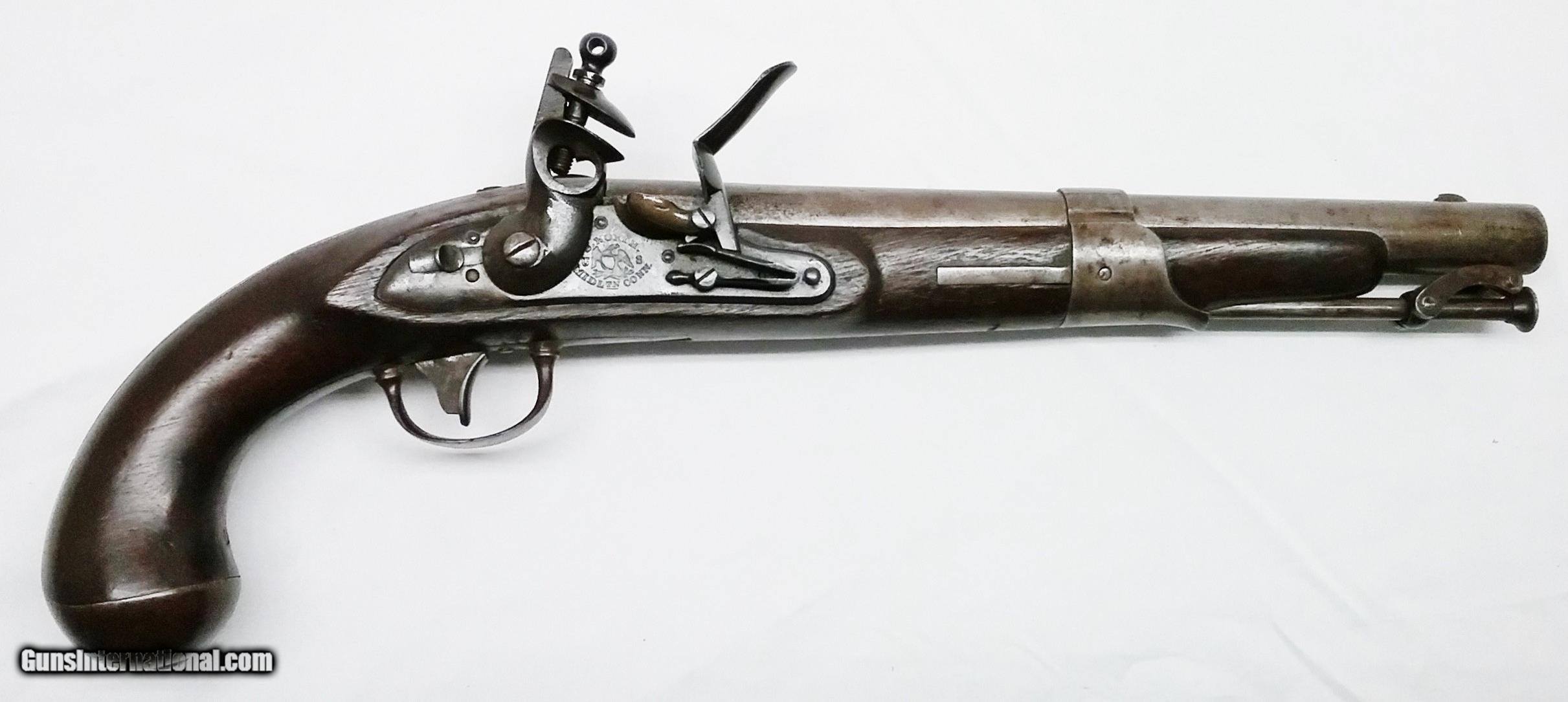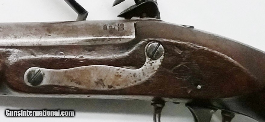 Description: P-36-14 S. North – 1819 – 52 cal. – STK# P-36-14 This original S. North Army contract flintlock pistol 52 cal smooth bore has a 10” tapered round barrel. Only 20,400 were made at the Harpers Ferry Armory starting in July 1819. The stamping on the barrel is JD/P/US is the proof mark that John D. Johnson tested this barrel. The barrel and the bore are in good condition with the exception of minor sporadic pitting throughout. The Walnut stock is in good condition with a minor unrepaired crack in the stock on the left side just in front of the upper lock screw. There is a cartouche barely visible on the left side by the lock bolt which looks to be LS (Luther Sage). Mounted to the stock is all iron furniture and a captured swivel iron ramrod. The lock with a safety selector is activated by a single pinned trigger. It is stamped S. NORTH above the U and S on either side of a spread eagle with MIDDLTN CONN on the bottom. Condition: Good over-all. The length is 15-1/2”, the weight is 2.7 lbs. Our stock number is P-36-14. Will ship to anywhere in the United States, buyer pays freight and insurance. SOLD Antique: Yes Manufacturer: S. North Model: 1819 Bore: Smooth Chambers: 1 Condition: Good Metal Condition: Good Wood Condition: Good Bore Condition: Good Barrels: One Barrel Type: Tapered Round Action: Flintlock Triggers: 1 Stock: Walnut Weight: 2.7 lbs. Sights: Fixed Item Location: OR - Oregon |