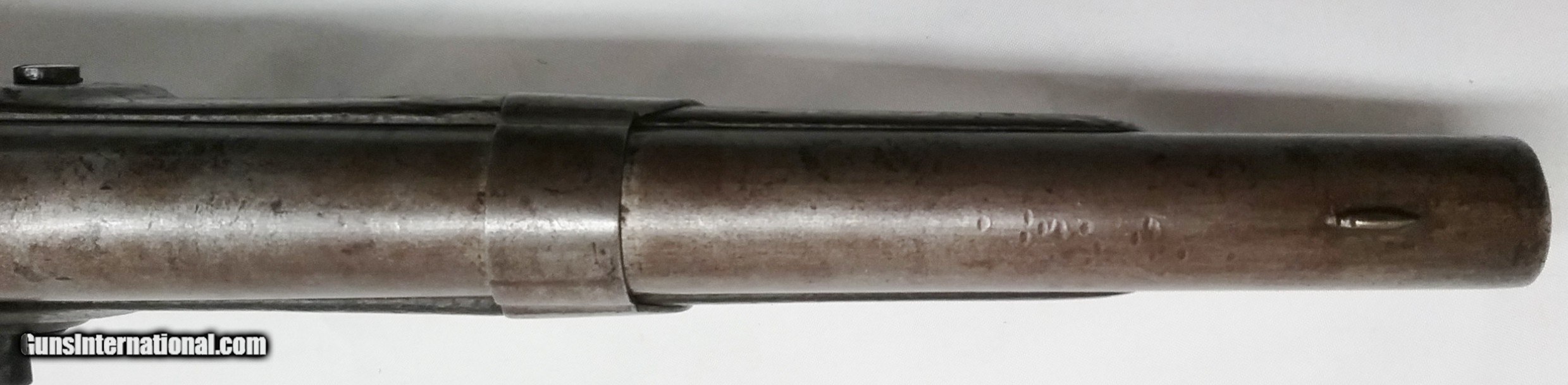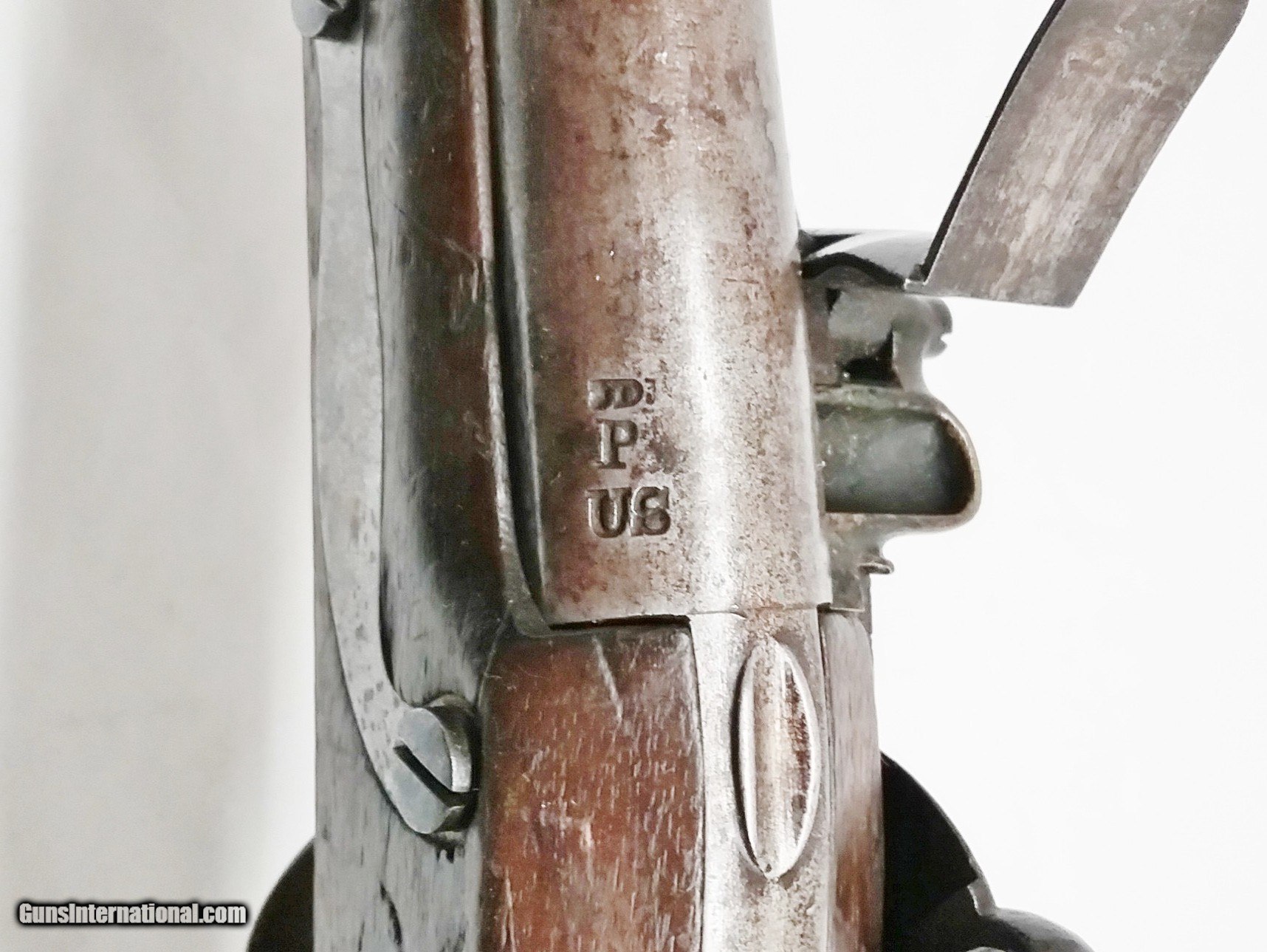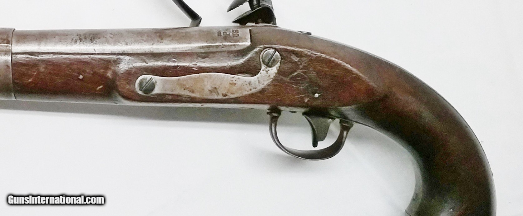 Description: P-36-14 S. North – 1819 – 52 cal. – STK# P-36-14 This original S. North Army contract flintlock pistol 52 cal smooth bore has a 10” tapered round barrel. Only 20,400 were made at the Harpers Ferry Armory starting in July 1819. The stamping on the barrel is JD/P/US is the proof mark that John D. Johnson tested this barrel. The barrel and the bore are in good condition with the exception of minor sporadic pitting throughout. The Walnut stock is in good condition with a minor unrepaired crack in the stock on the left side just in front of the upper lock screw. There is a cartouche barely visible on the left side by the lock bolt which looks to be LS (Luther Sage). Mounted to the stock is all iron furniture and a captured swivel iron ramrod. The lock with a safety selector is activated by a single pinned trigger. It is stamped S. NORTH above the U and S on either side of a spread eagle with MIDDLTN CONN on the bottom. Condition: Good over-all. The length is 15-1/2”, the weight is 2.7 lbs. Our stock number is P-36-14. Will ship to anywhere in the United States, buyer pays freight and insurance. SOLD Antique: Yes Manufacturer: S. North Model: 1819 Bore: Smooth Chambers: 1 Condition: Good Metal Condition: Good Wood Condition: Good Bore Condition: Good Barrels: One Barrel Type: Tapered Round Action: Flintlock Triggers: 1 Stock: Walnut Weight: 2.7 lbs. Sights: Fixed Item Location: OR - Oregon |