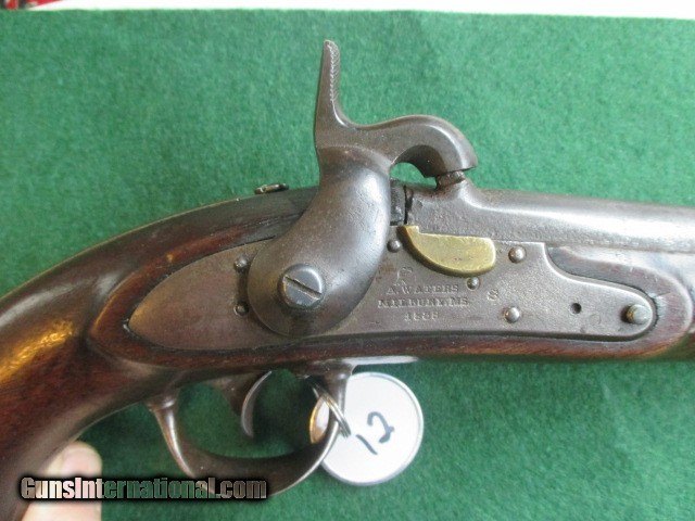 Description: Listed for sale is an original US Model 1836 Flintlock Pistol made in 1838 and converted to percussion just prior to the Civil War. It was made by A Waters of Milbury, MS. In very good original condition with no cracks in the wood and the pistol functions as it should. Bore is dirty with some minor pitting. This gun is historically significant as it was the primary issue pistol during the Mexican American War ( 1846-1848). These pistols saw a lot of use during the Civil War. The cartouche is very faint and unreadable. SOLD Antique: Yes Manufacturer: A Waters Model: Model 1836 Serial Number: None |
