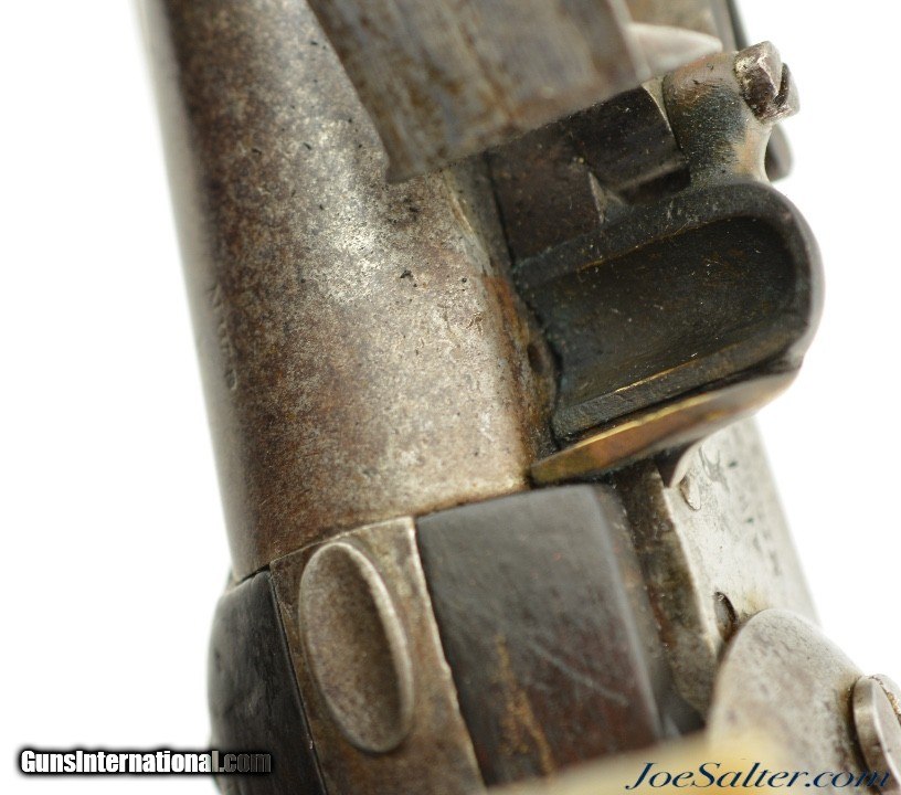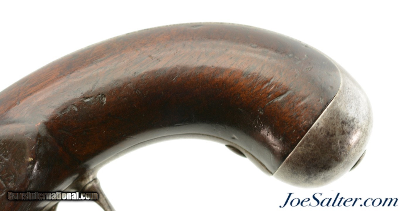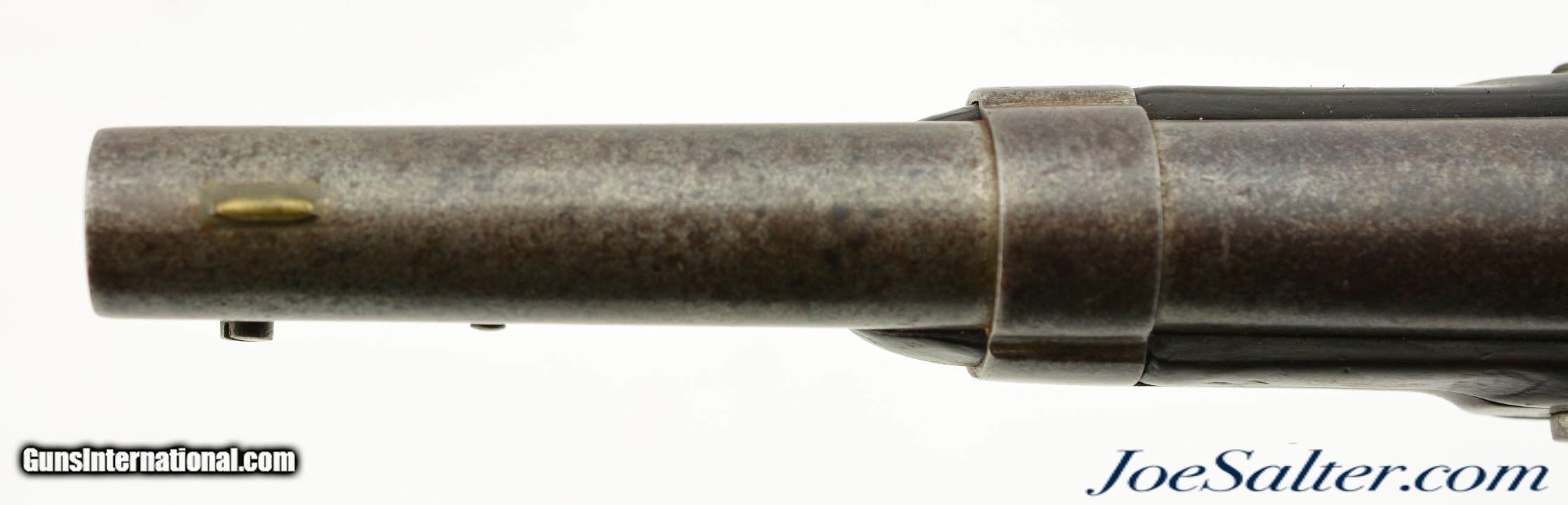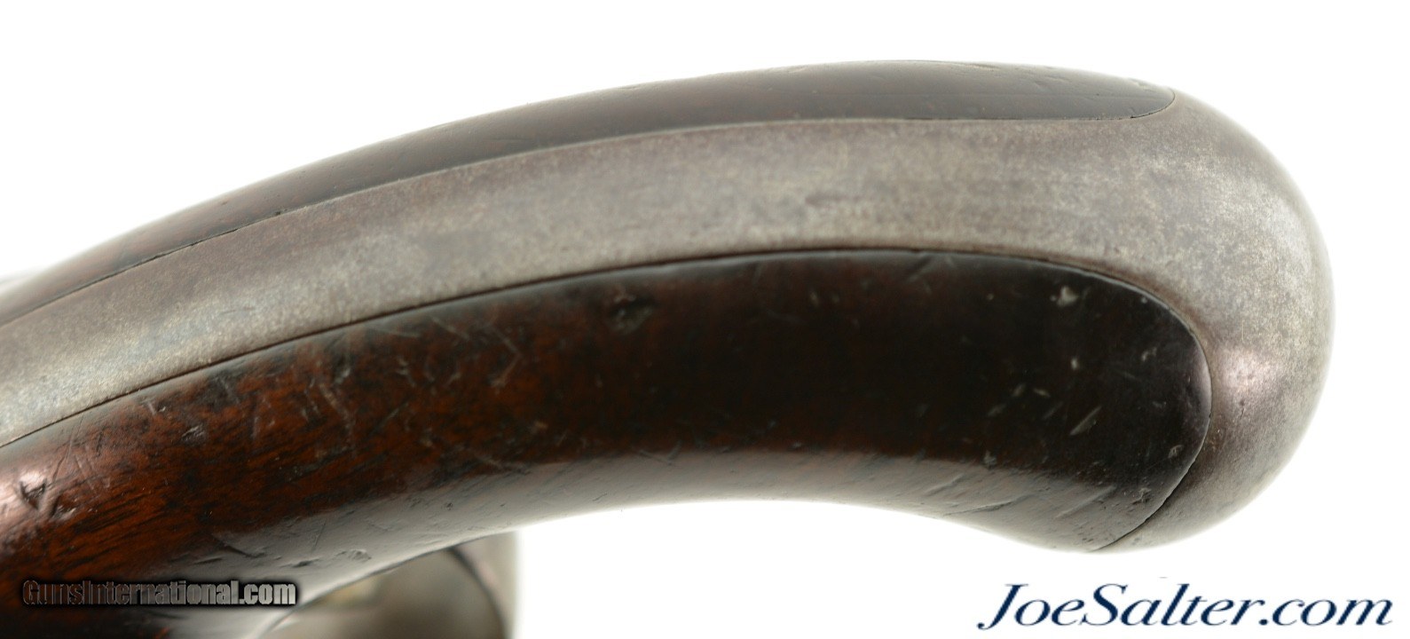 Description: NSN, .54 Caliber, 8 1/2" barrel with a fair, lightly pitted bore. This is an 1843-dated pistol that has an overall mottled gray patina mixing with spots of plum-brown freckling evenly scattered about the surface metal. The barrel markings are still visible at the breech, and the lock plate is marked "(Eagle Head) / A. WATERS / MILBURY MS. / 1843" beneath the brass pan, which has a dull yellow-ochre patina. The lock is tight and the mechanics are fully functional while the walnut stock has an thick, added oil finish over numerous small handling marks and surface blemishes scattered about. There is a visible cartouche on the left side opposite the lock, as well as an added rack or inventory number, "52." This is a handsome pistol, and is in about very good condition overall. Antique; Antique: Yes Price: $2,295.00 Contact Seller |