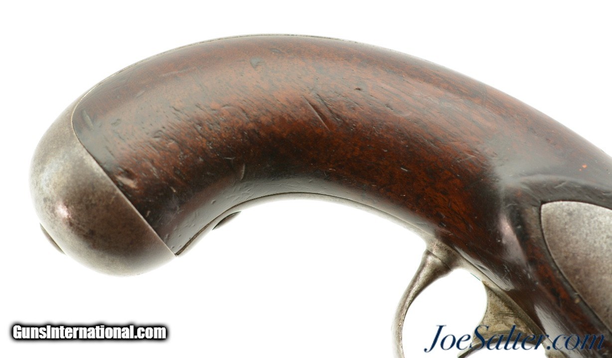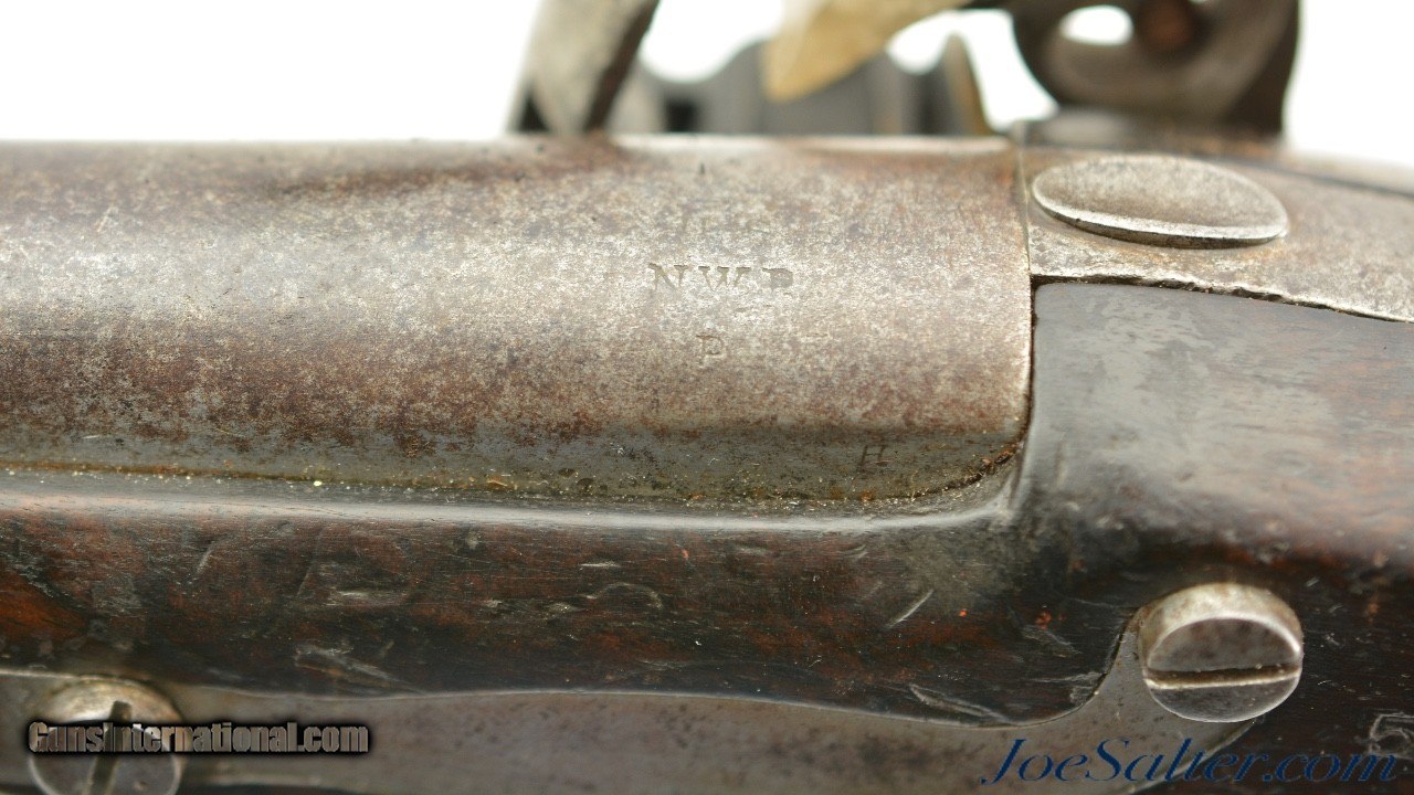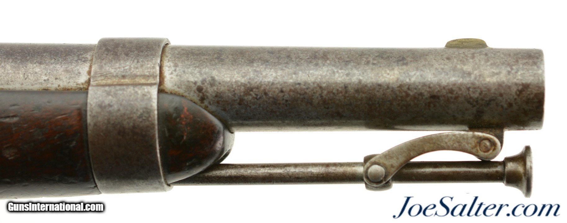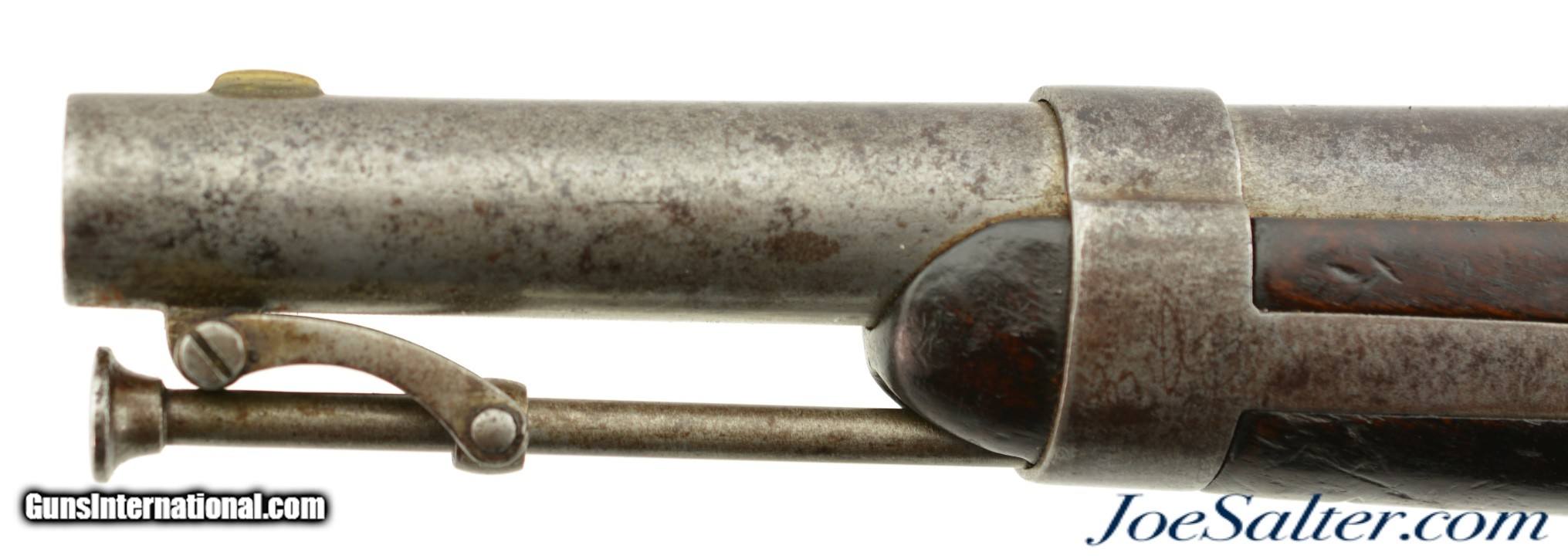 Description: NSN, .54 Caliber, 8 1/2" barrel with a fair, lightly pitted bore. This is an 1843-dated pistol that has an overall mottled gray patina mixing with spots of plum-brown freckling evenly scattered about the surface metal. The barrel markings are still visible at the breech, and the lock plate is marked "(Eagle Head) / A. WATERS / MILBURY MS. / 1843" beneath the brass pan, which has a dull yellow-ochre patina. The lock is tight and the mechanics are fully functional while the walnut stock has an thick, added oil finish over numerous small handling marks and surface blemishes scattered about. There is a visible cartouche on the left side opposite the lock, as well as an added rack or inventory number, "52." This is a handsome pistol, and is in about very good condition overall. Antique; Antique: Yes Price: $2,295.00 Contact Seller |