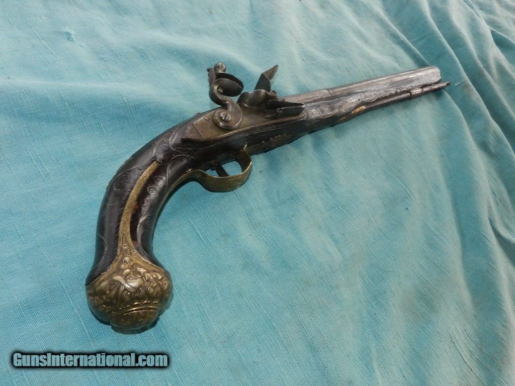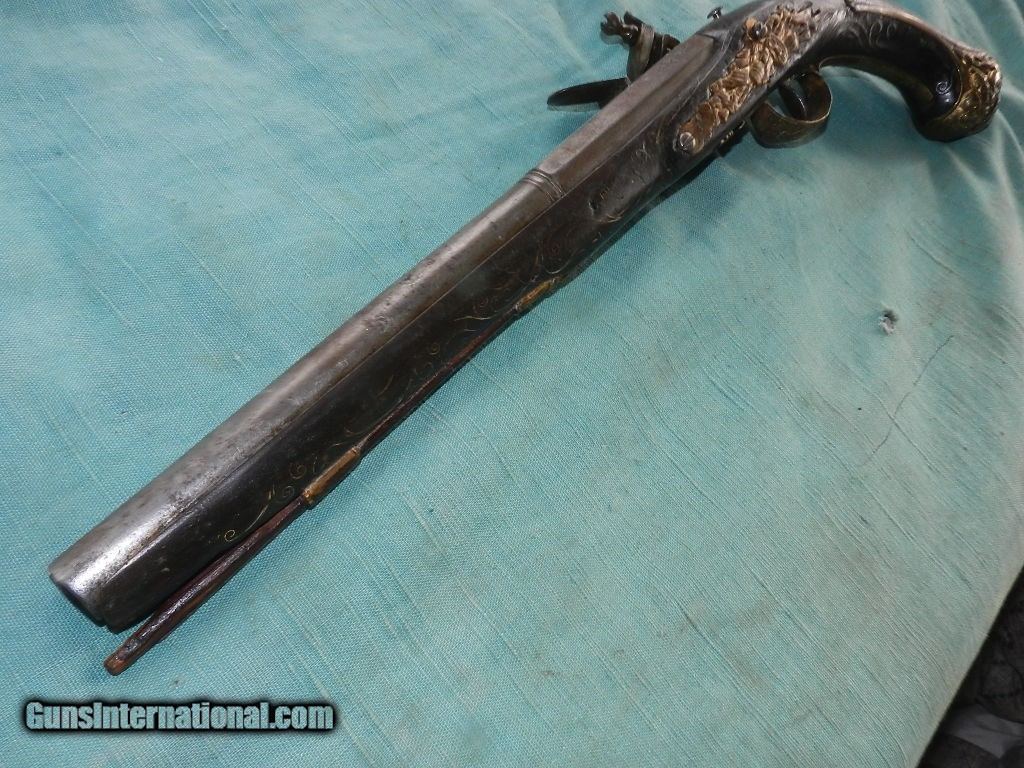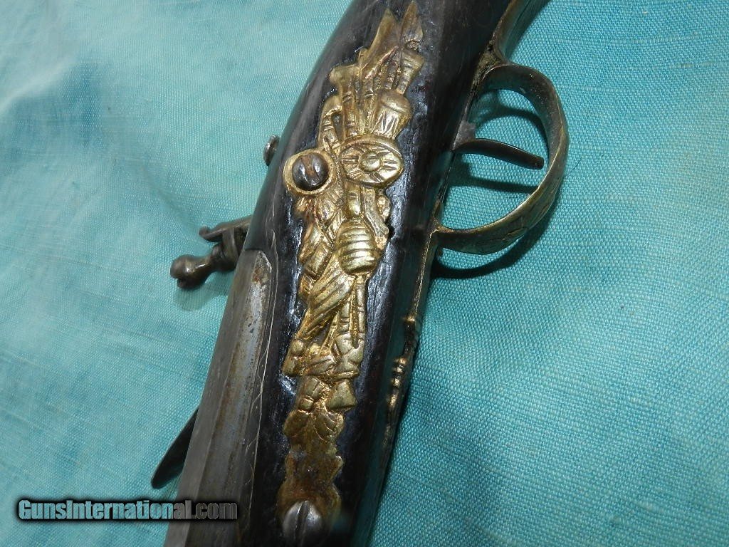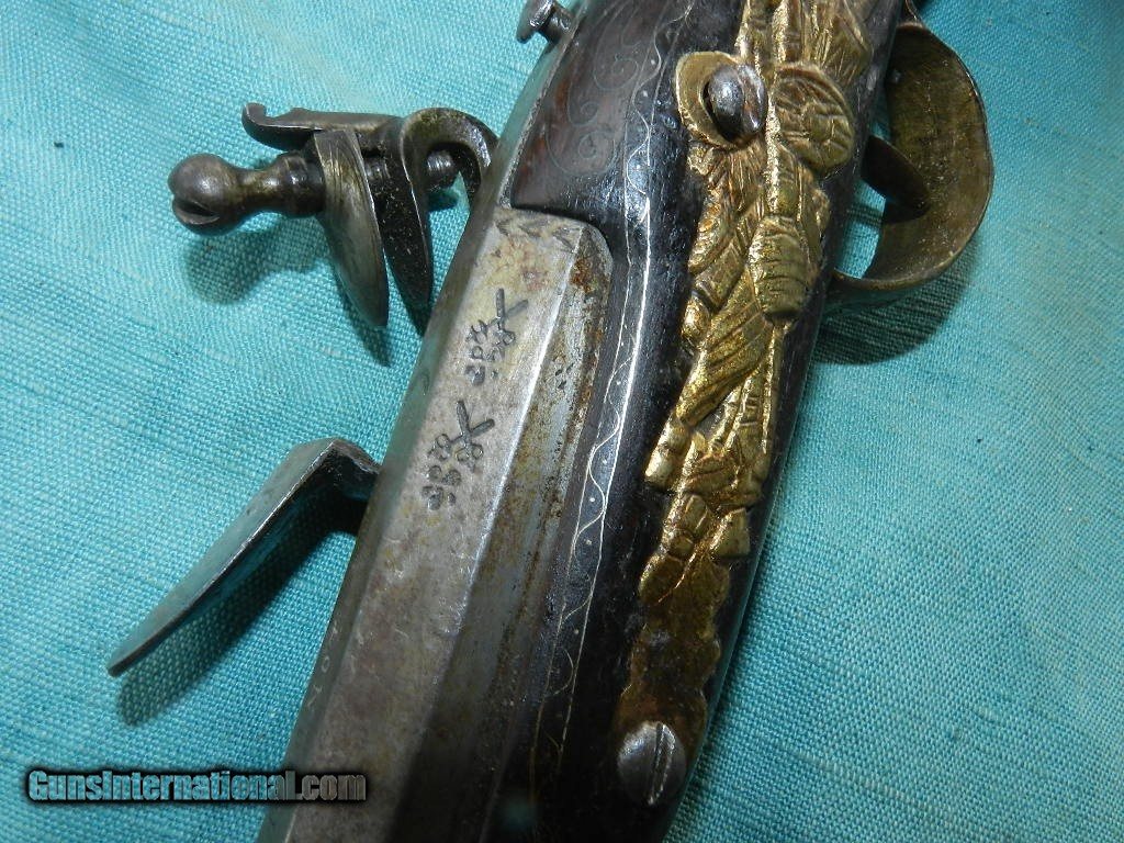 Description: <<<SOLD>>>An early ornate Flintlock pistol of about 17th or 18th century often used by Pirates with a working lock and very strong mainspring. These early guns are not safe to fire as we don;t know th condition of the breech plug. Overall it is about 18" with a 11" octagonal barrel of about .62 cal. Common for the times and these were usually made in France, Italy, Spain, or England.This early flintlocks had wire inlays and the more fancy; the higher the rank of it's owner. The brass furniture of this exaample is cast, and the side plate is war drums, cannons, flages, etc. The top of the barrel has chisel engraved LONDON as well as cross scepters of London proofs.Most of these guns didn;t survive are they went to the bottom of the sea in naval engagements. or were smashed to peices in a fight as the gun would fire one shoot, and the brass skill crusher butt-cap was used as a club! When buying a gun always have it examined by a competent gunsmith before shooting. To buy a gun from me you must get a direct email for me, with details, and shipping cost. We don’t have a web site .I prefer money orders or a check. Item ships when funds come in. I try to keep guns affordable, which means I make less money than most dealers. You won’t get altitude sickness, or nose bleed, with my prices! I consistently have the best selection of older guns If you attempt to buy, you must still contact us for details . Best to email to buy. Sometimes a local person can stop buy and purchase before the gun is removed. Sometimes not home to get calls. Some guns are required shipment to a gun dealer near you for a transfer to you when it arrives. Otherwise many older or black powder guns ship to your door. With the widest selection of older guns at great prices, We don’t have a store, and sell on the internet only. I’m easy to get along with. Thank You SOLD Antique: Yes |