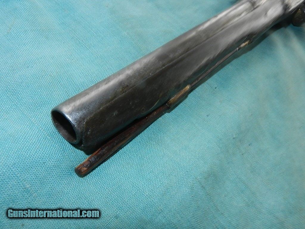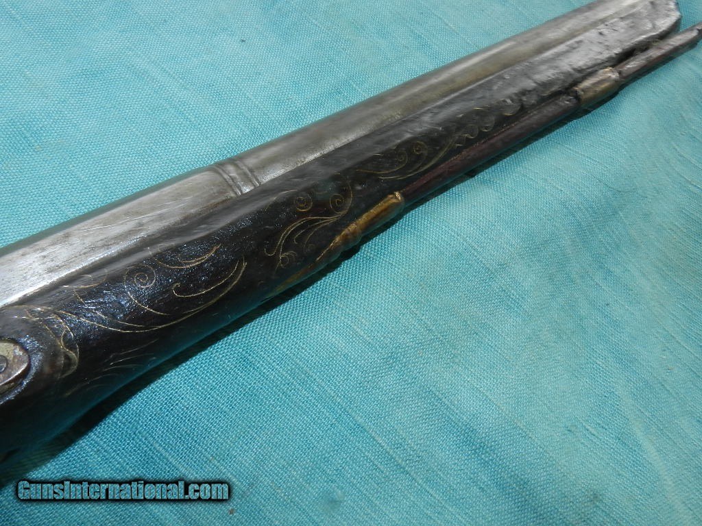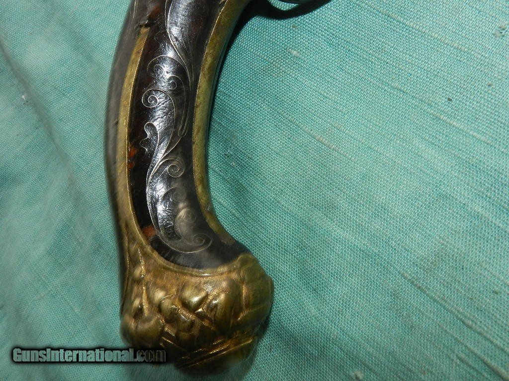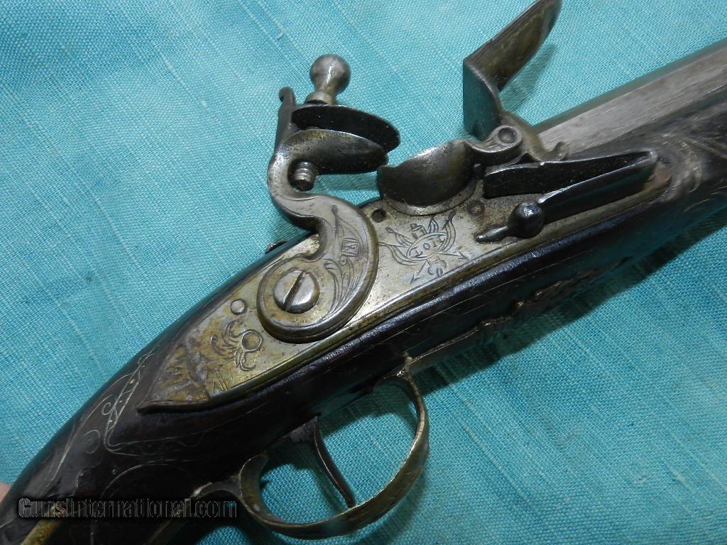 Description: <<<SOLD>>>An early ornate Flintlock pistol of about 17th or 18th century often used by Pirates with a working lock and very strong mainspring. These early guns are not safe to fire as we don;t know th condition of the breech plug. Overall it is about 18" with a 11" octagonal barrel of about .62 cal. Common for the times and these were usually made in France, Italy, Spain, or England.This early flintlocks had wire inlays and the more fancy; the higher the rank of it's owner. The brass furniture of this exaample is cast, and the side plate is war drums, cannons, flages, etc. The top of the barrel has chisel engraved LONDON as well as cross scepters of London proofs.Most of these guns didn;t survive are they went to the bottom of the sea in naval engagements. or were smashed to peices in a fight as the gun would fire one shoot, and the brass skill crusher butt-cap was used as a club! When buying a gun always have it examined by a competent gunsmith before shooting. To buy a gun from me you must get a direct email for me, with details, and shipping cost. We don’t have a web site .I prefer money orders or a check. Item ships when funds come in. I try to keep guns affordable, which means I make less money than most dealers. You won’t get altitude sickness, or nose bleed, with my prices! I consistently have the best selection of older guns If you attempt to buy, you must still contact us for details . Best to email to buy. Sometimes a local person can stop buy and purchase before the gun is removed. Sometimes not home to get calls. Some guns are required shipment to a gun dealer near you for a transfer to you when it arrives. Otherwise many older or black powder guns ship to your door. With the widest selection of older guns at great prices, We don’t have a store, and sell on the internet only. I’m easy to get along with. Thank You SOLD Antique: Yes |