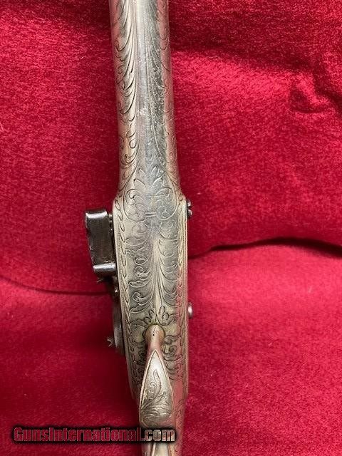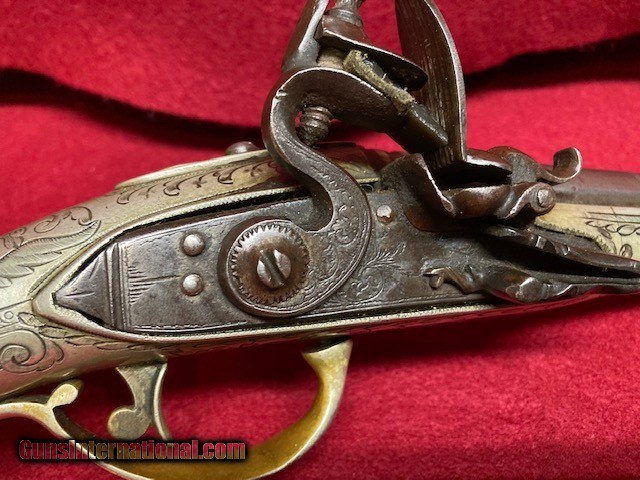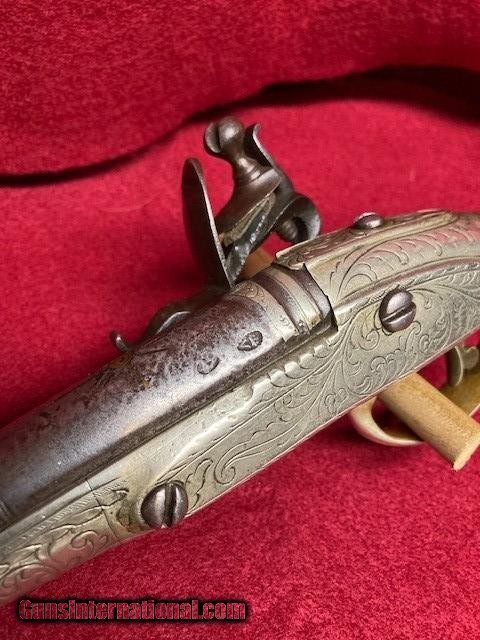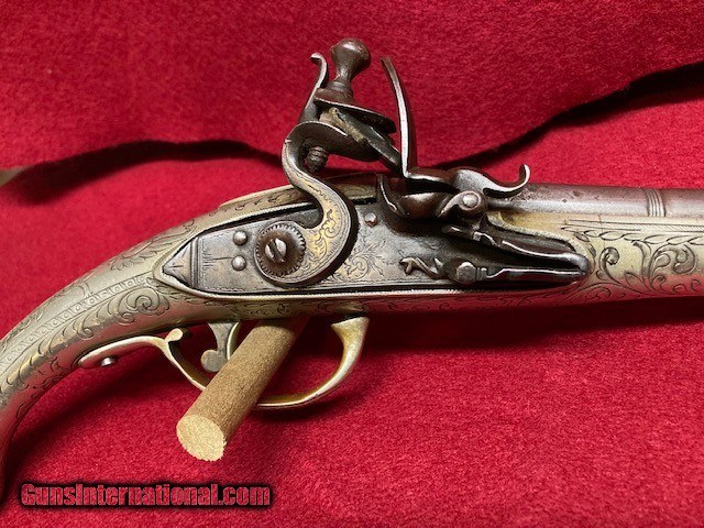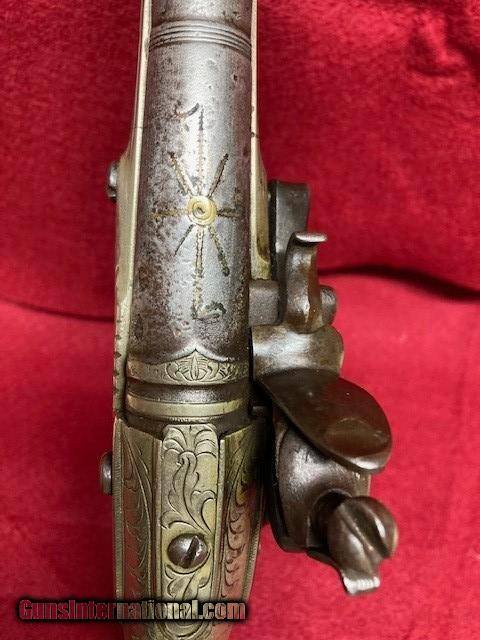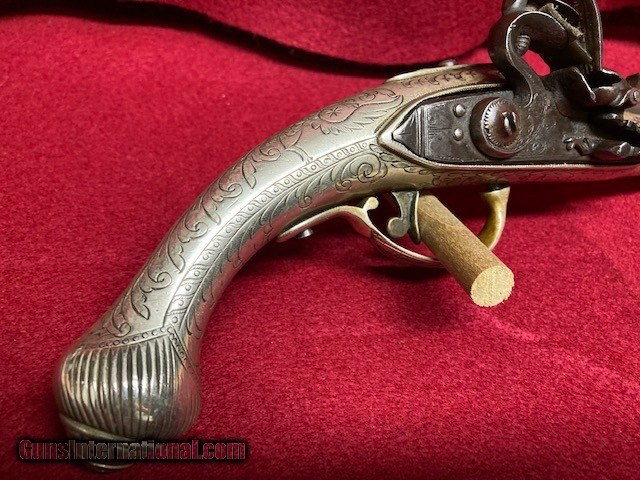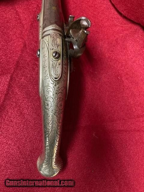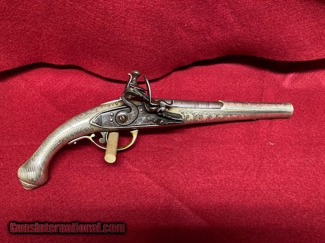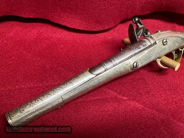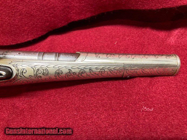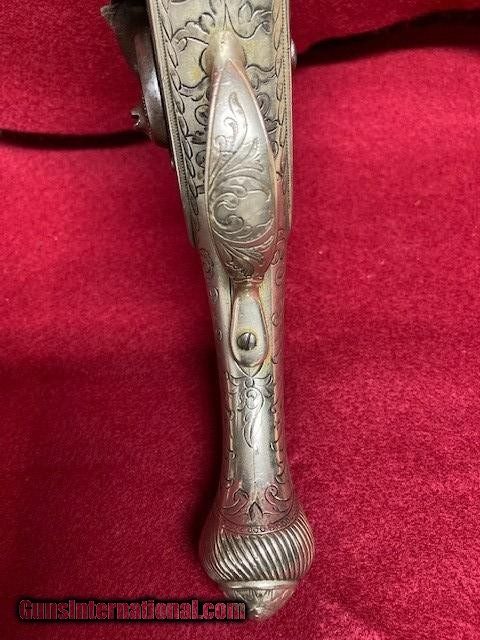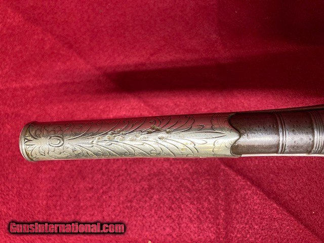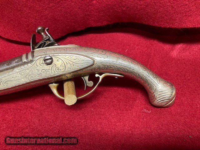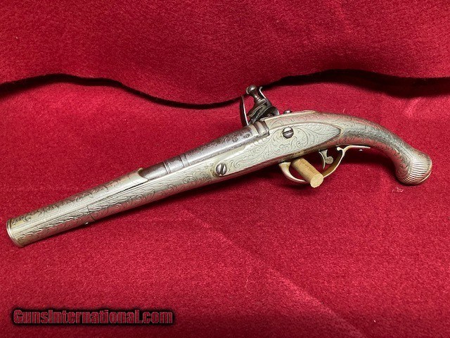 Description: **FINAL REDUCTION**[ was $1995.00** ONE HECK OF A DEAL**MOTIVATED SELLER. HIGHLY Ornate, Fully Functioning! I present what I believe to be a Mid-Eastern( Turkish?Ottoman?Balken?) type flintlock pistol of 18th-19th century descent. Caliber is approximately 58-60. BEAUTIFUL PIECE. I find no markings anywhere on this piece other than the 2 barrel proofs. Fully ENGRAVED silver stock and barrel shroud. Engraved hammer and lockplate. This fine piece has a 8.5" barrel and is 14" in overall length. Maybe made for someone of importance or of upper class of this Era?? At any rate, a nice,nice piece in very good, operable condition. Maybe worth well more than I am asking. Thanks for looking! $50.00 Shipping.. NO FFL Required. SOLD Antique: Yes |