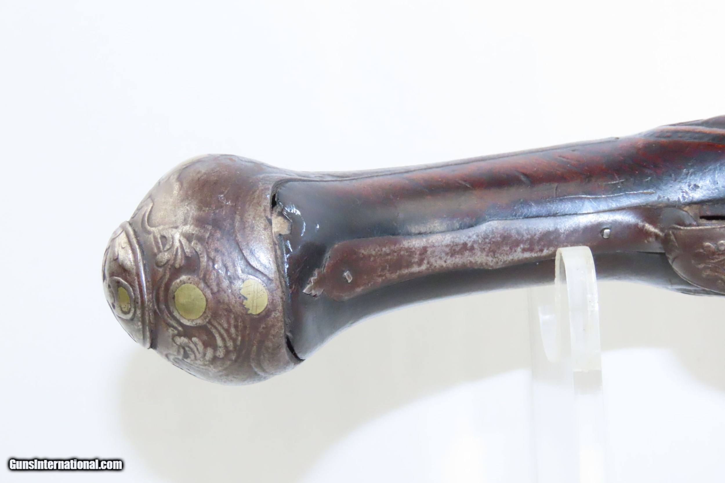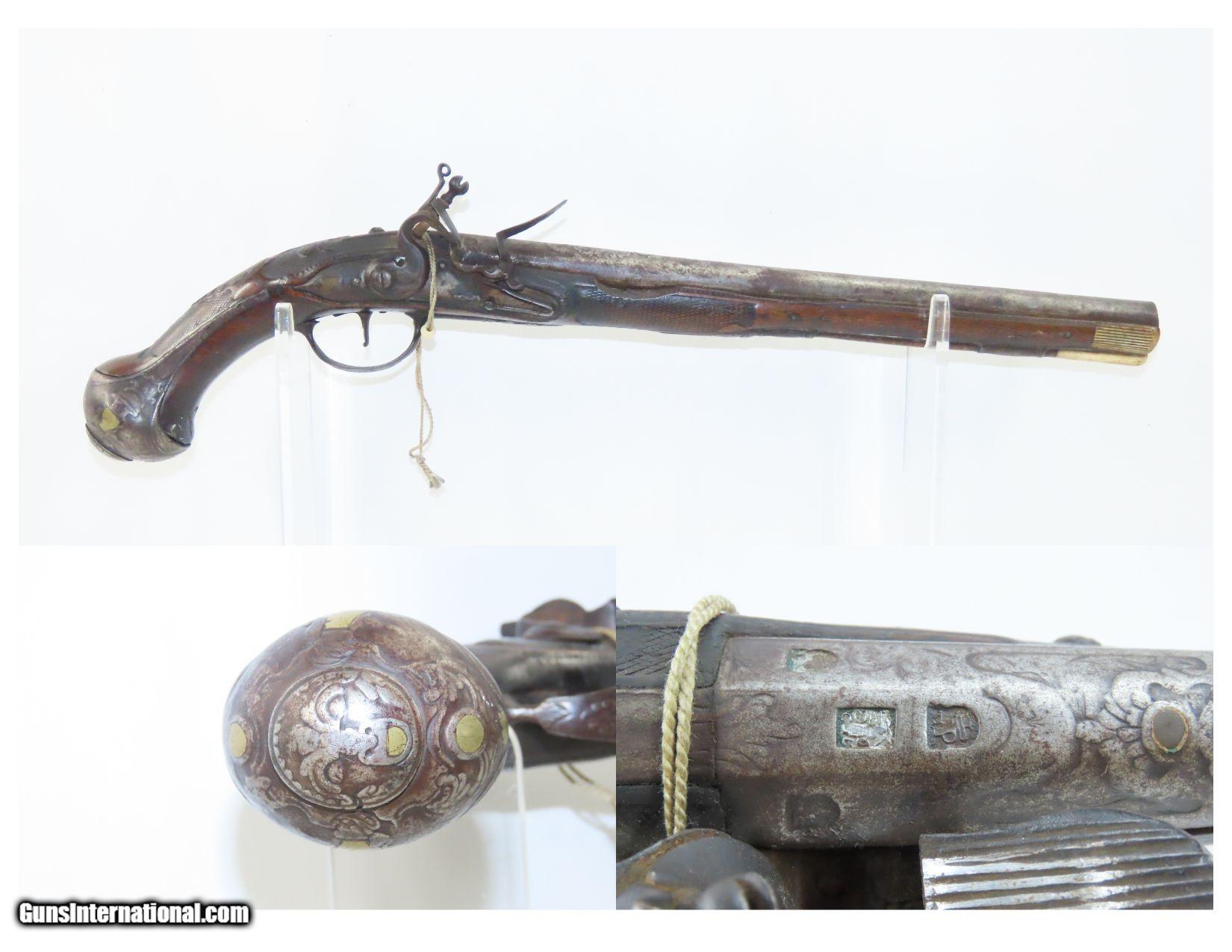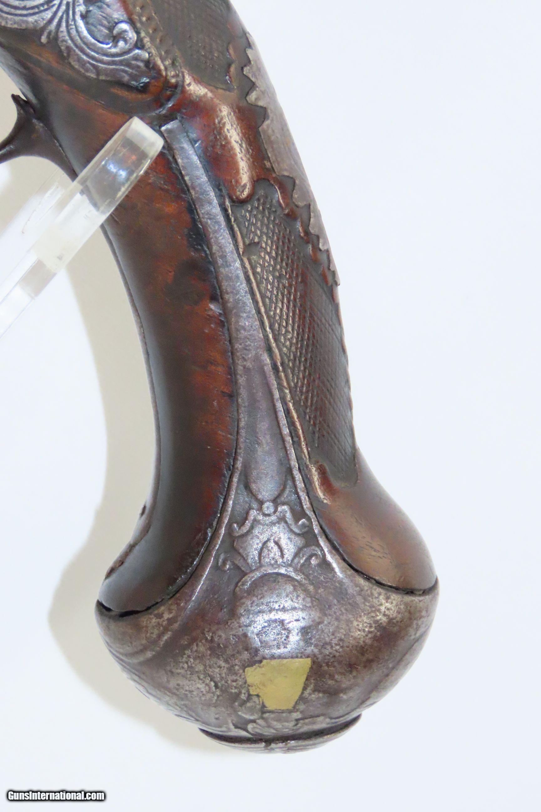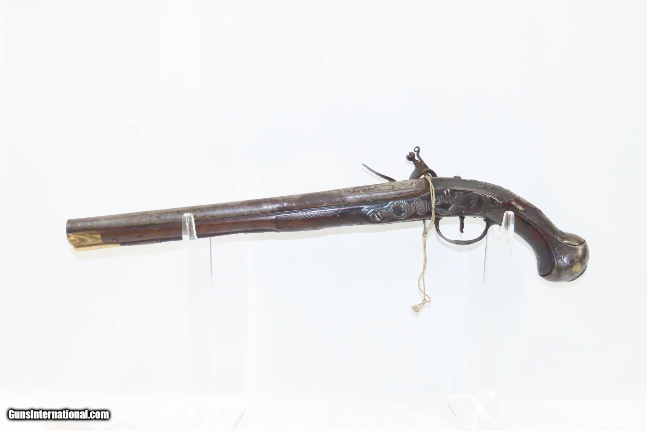 Description: Ornate SPANISH Antique FLINTLOCK Pistol .65 Caliber Single Shot Sidearm Engraved Hardware, Carved Stock, Ivory Tipped Here we present an antique Spanish Flintlock Pistol, made circa the late-18th Century. This large bore pistol would have been intended for use as a martial sidearm. Its barrel is a very long 14 inches in length. This pistol has a .65 caliber bore and would have been most at home tucked into a belt or holster when not punching large holes. One can easily imagine this in the hands of a military officer or perhaps even a Spanish pirate. This one has been well-used and remain in good condition. The pommel is capped in the European style and would have made a good bludgeon once the single shot was fired. The pommel cap and trigger guard are decorated with small primitive figures. The stock has been carved and checkered. Spanish maker markings can be observed on the top of the barrel. The overall condition is good. Strong and tight action. Smooth, patinaed bore. Solid stock with an old chip on the right forend. Own the original! This is a legitimate antique and not a reproduction. Barrel is 14 inches. Caliber: .65 Flintlock Overall condition as seen in photos. Very Fast. Very Safe. FREE SHIPPING WORLDWIDE. Delivered directly to your door by express mail! Guaranteed AUTHENTIC & Includes CERTIFICATE OF AUTHENTICITY. ancestryguns $1995 #215321 SOLD Antique: Yes |