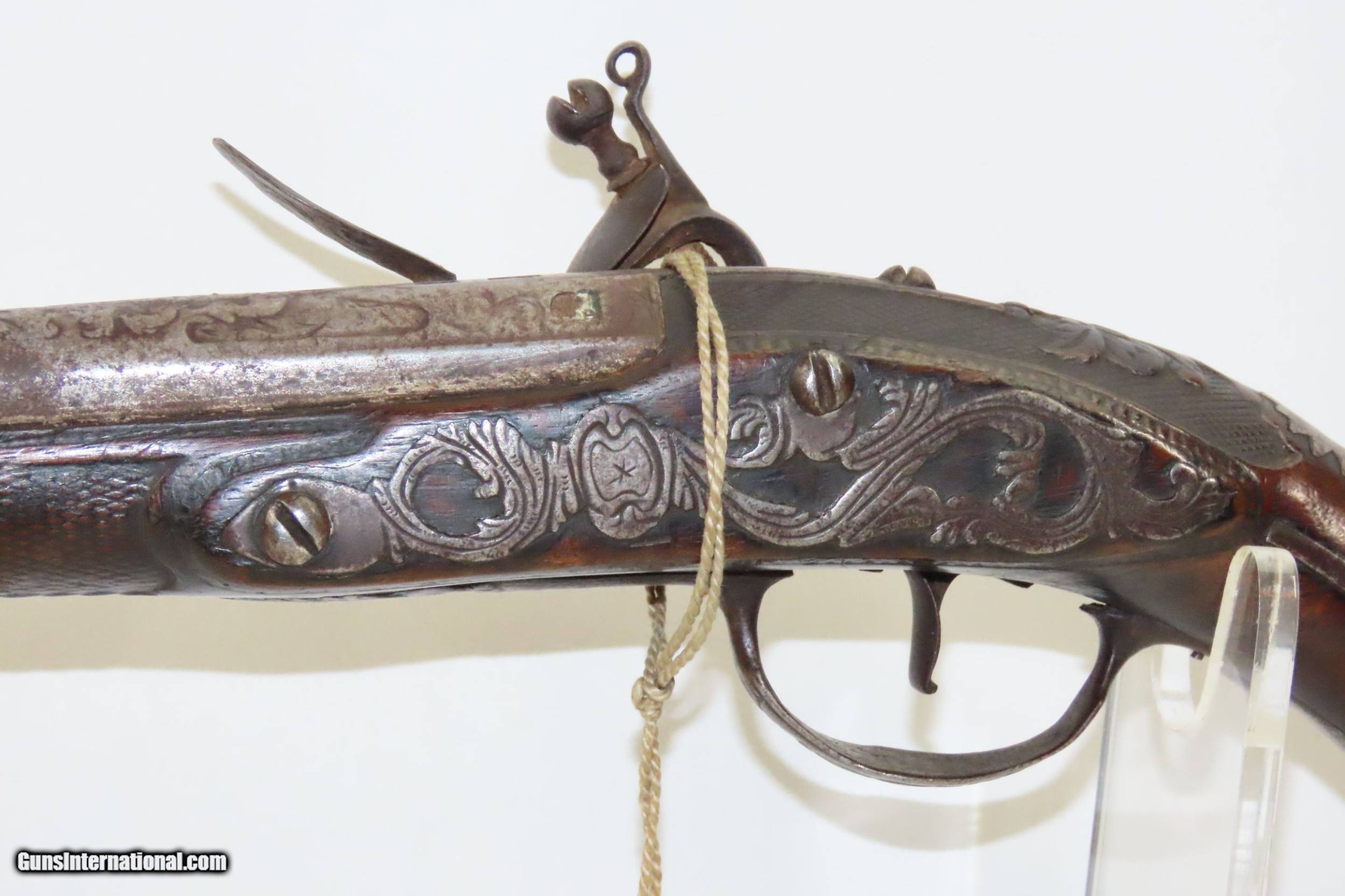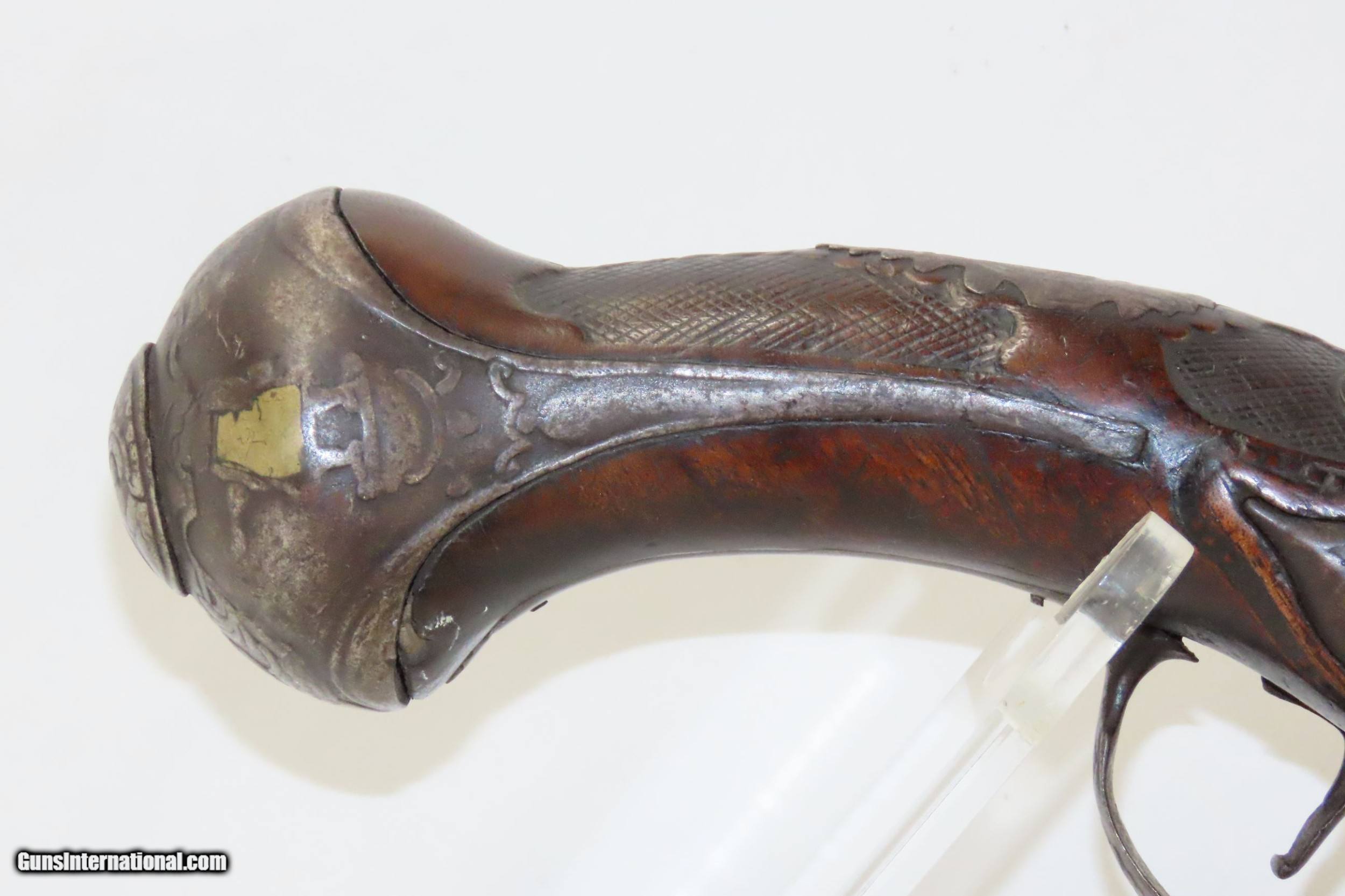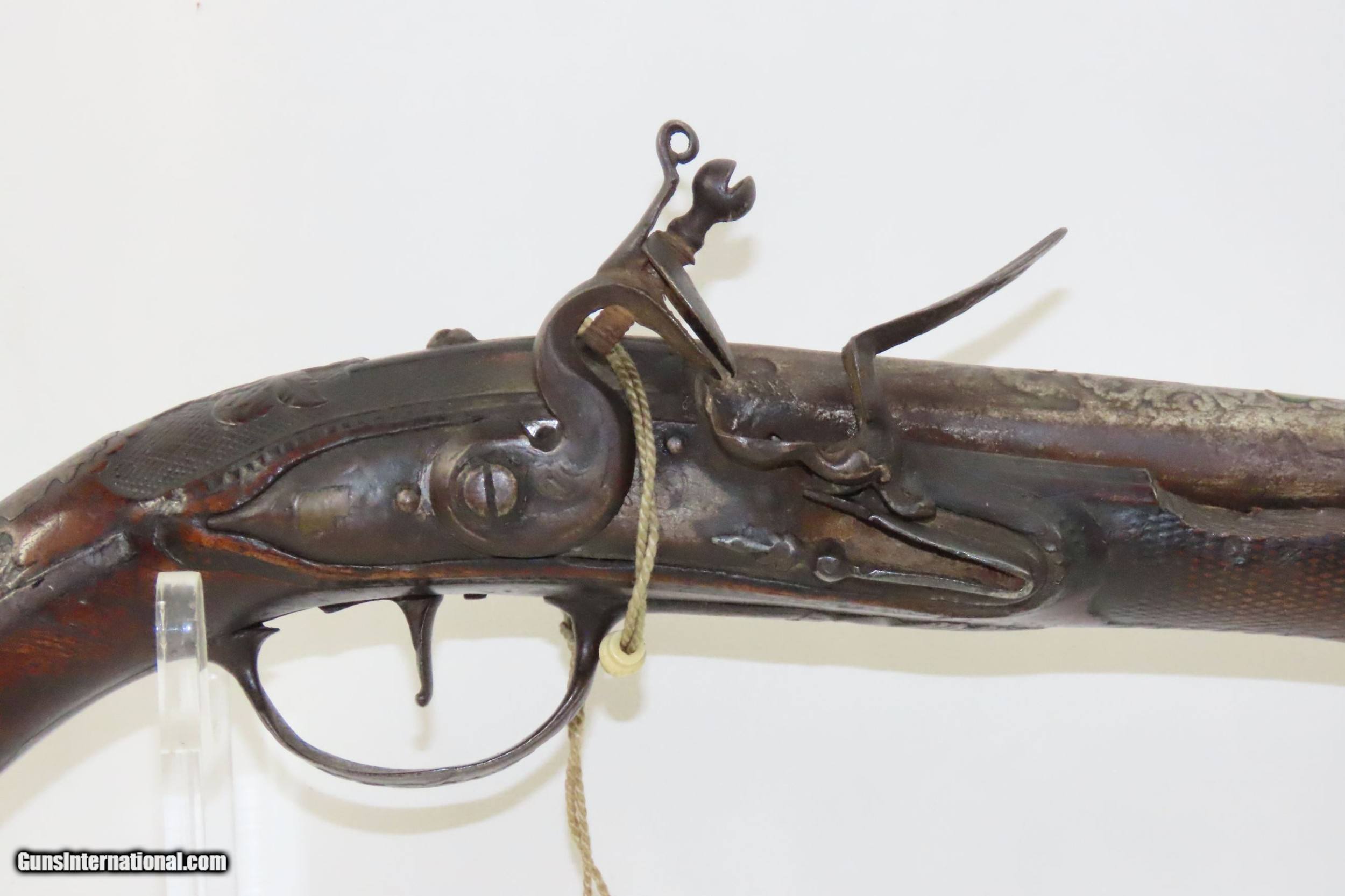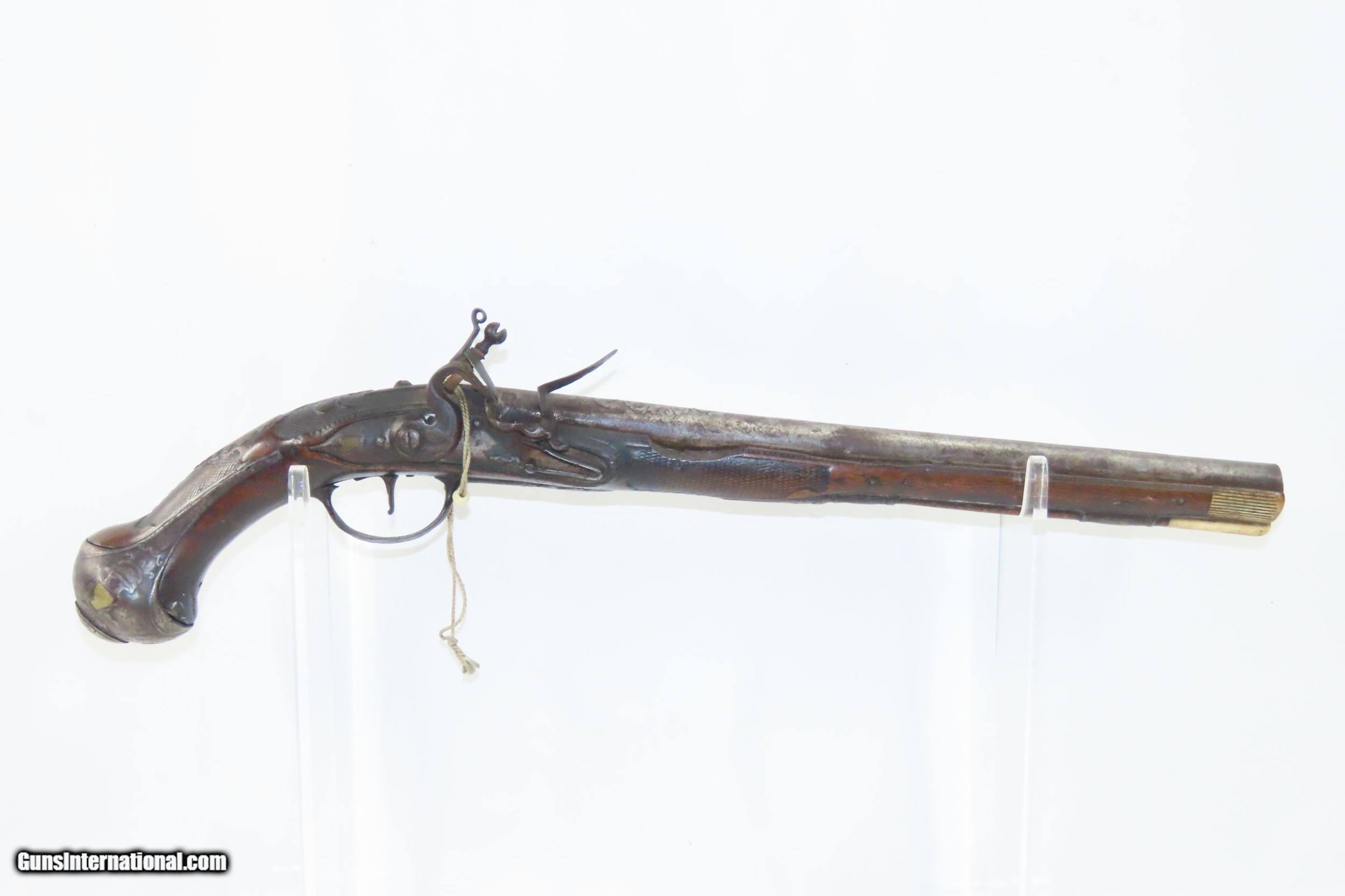 Description: Ornate SPANISH Antique FLINTLOCK Pistol .65 Caliber Single Shot Sidearm Engraved Hardware, Carved Stock, Ivory Tipped Here we present an antique Spanish Flintlock Pistol, made circa the late-18th Century. This large bore pistol would have been intended for use as a martial sidearm. Its barrel is a very long 14 inches in length. This pistol has a .65 caliber bore and would have been most at home tucked into a belt or holster when not punching large holes. One can easily imagine this in the hands of a military officer or perhaps even a Spanish pirate. This one has been well-used and remain in good condition. The pommel is capped in the European style and would have made a good bludgeon once the single shot was fired. The pommel cap and trigger guard are decorated with small primitive figures. The stock has been carved and checkered. Spanish maker markings can be observed on the top of the barrel. The overall condition is good. Strong and tight action. Smooth, patinaed bore. Solid stock with an old chip on the right forend. Own the original! This is a legitimate antique and not a reproduction. Barrel is 14 inches. Caliber: .65 Flintlock Overall condition as seen in photos. Very Fast. Very Safe. FREE SHIPPING WORLDWIDE. Delivered directly to your door by express mail! Guaranteed AUTHENTIC & Includes CERTIFICATE OF AUTHENTICITY. ancestryguns $1995 #215321 SOLD Antique: Yes |