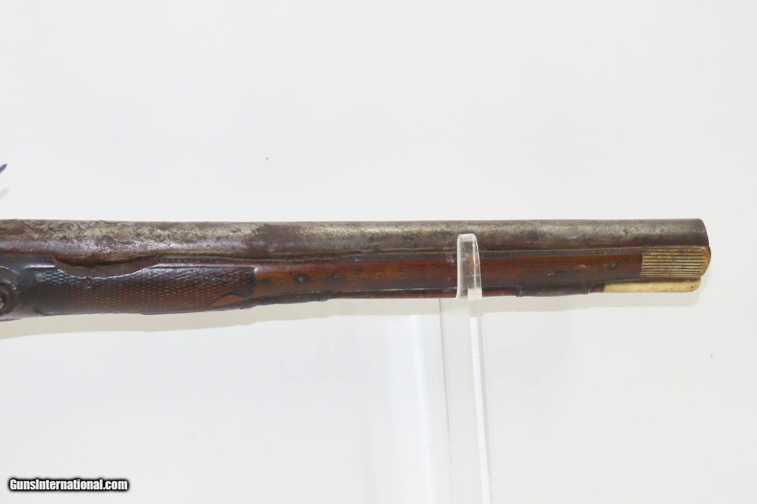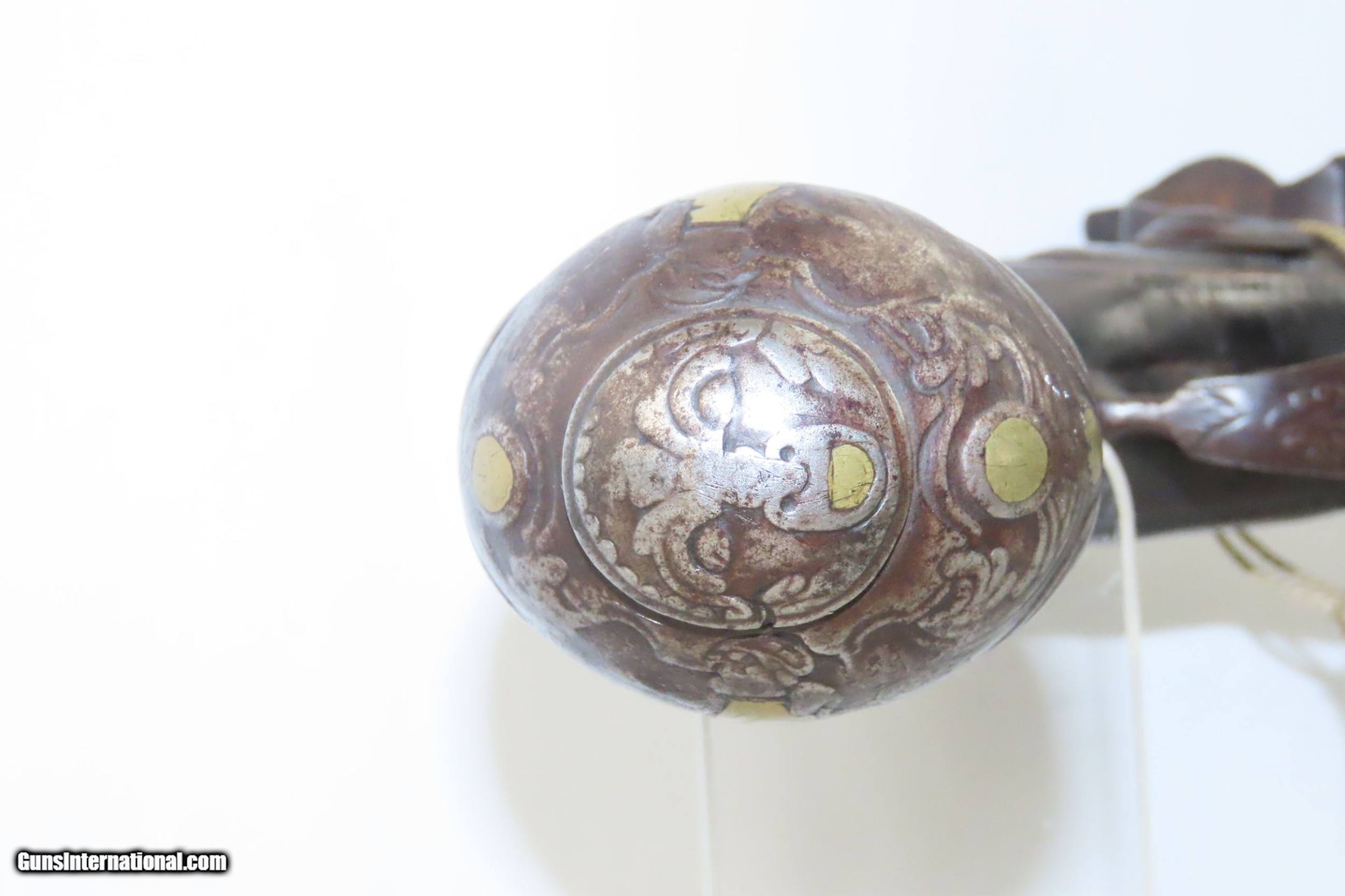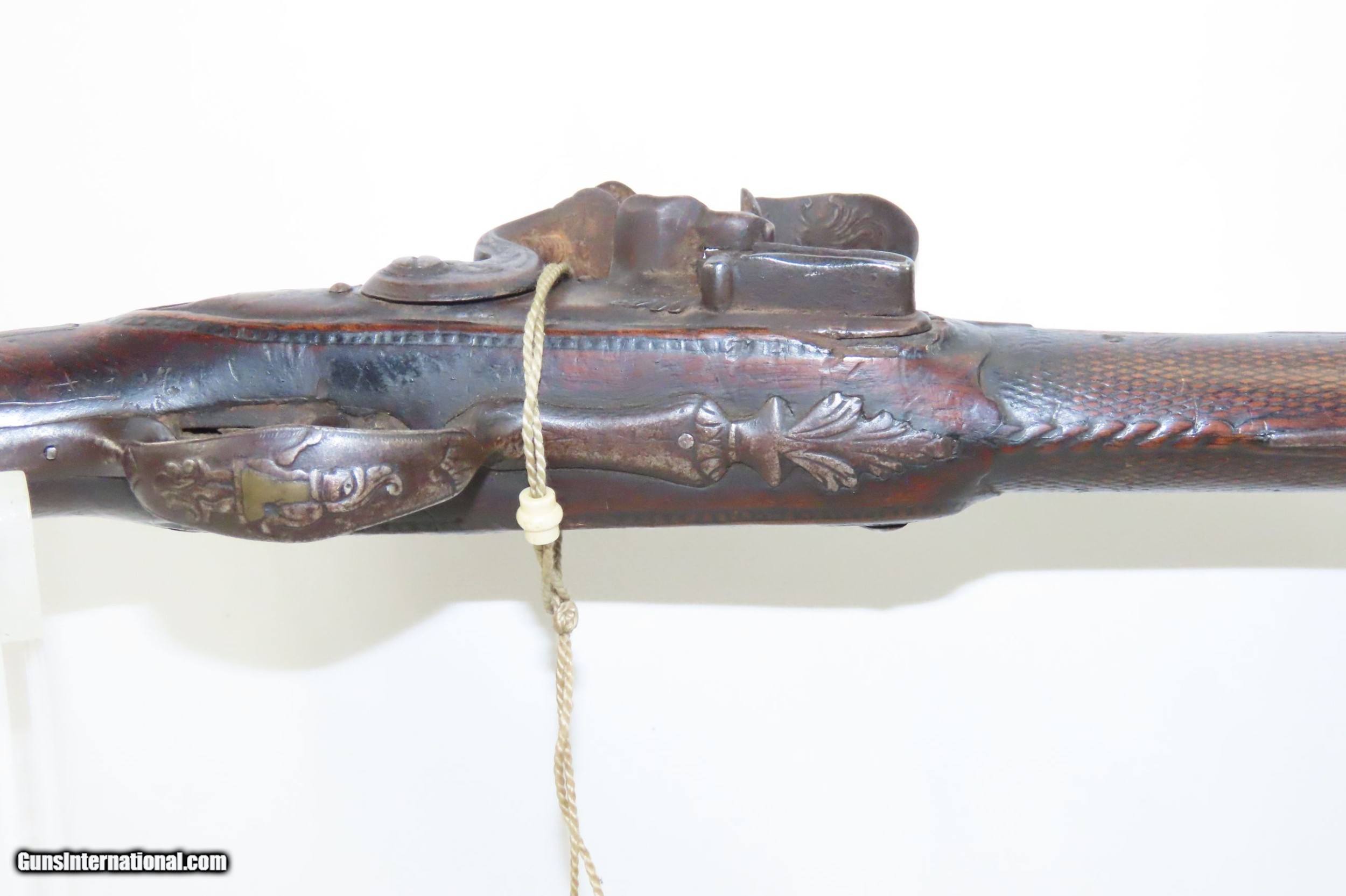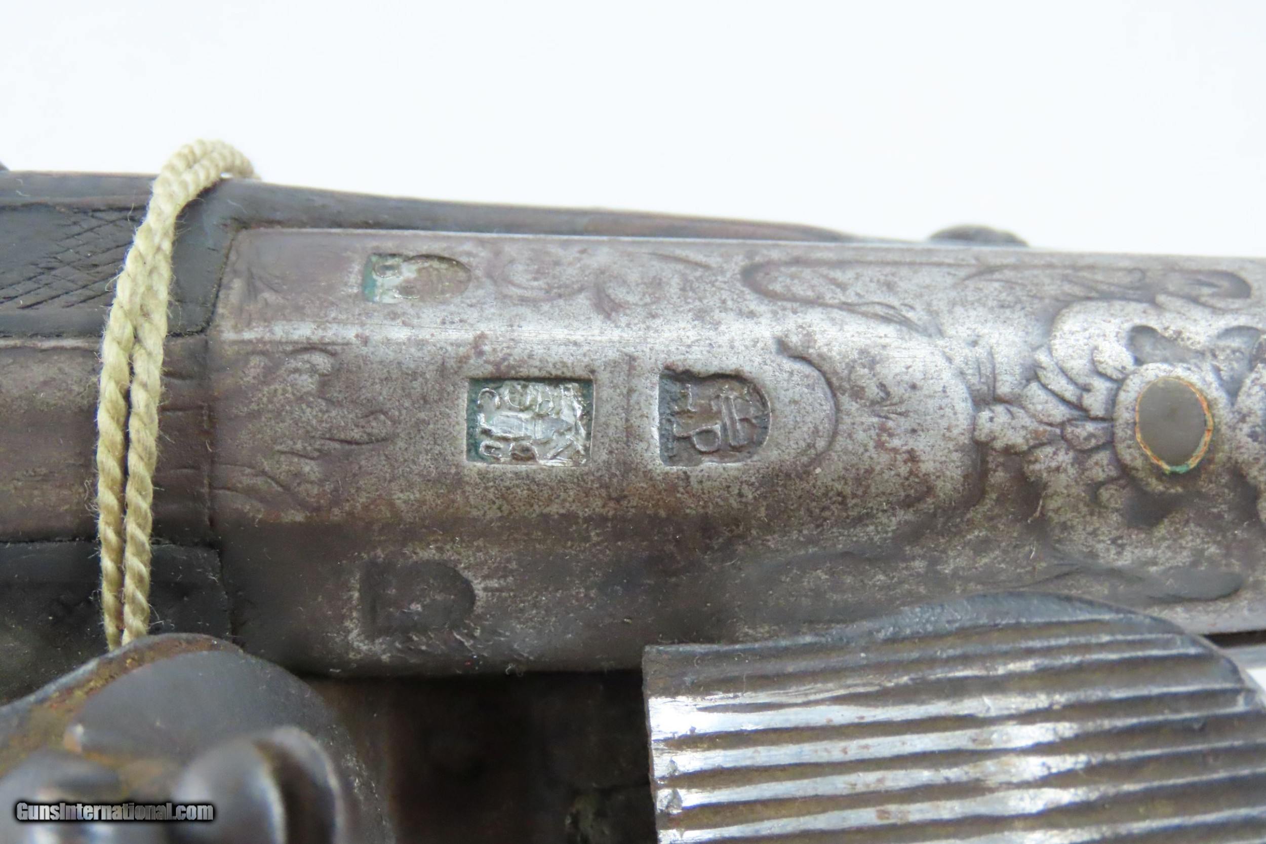 Description: Ornate SPANISH Antique FLINTLOCK Pistol .65 Caliber Single Shot Sidearm Engraved Hardware, Carved Stock, Ivory Tipped Here we present an antique Spanish Flintlock Pistol, made circa the late-18th Century. This large bore pistol would have been intended for use as a martial sidearm. Its barrel is a very long 14 inches in length. This pistol has a .65 caliber bore and would have been most at home tucked into a belt or holster when not punching large holes. One can easily imagine this in the hands of a military officer or perhaps even a Spanish pirate. This one has been well-used and remain in good condition. The pommel is capped in the European style and would have made a good bludgeon once the single shot was fired. The pommel cap and trigger guard are decorated with small primitive figures. The stock has been carved and checkered. Spanish maker markings can be observed on the top of the barrel. The overall condition is good. Strong and tight action. Smooth, patinaed bore. Solid stock with an old chip on the right forend. Own the original! This is a legitimate antique and not a reproduction. Barrel is 14 inches. Caliber: .65 Flintlock Overall condition as seen in photos. Very Fast. Very Safe. FREE SHIPPING WORLDWIDE. Delivered directly to your door by express mail! Guaranteed AUTHENTIC & Includes CERTIFICATE OF AUTHENTICITY. ancestryguns $1995 #215321 SOLD Antique: Yes |