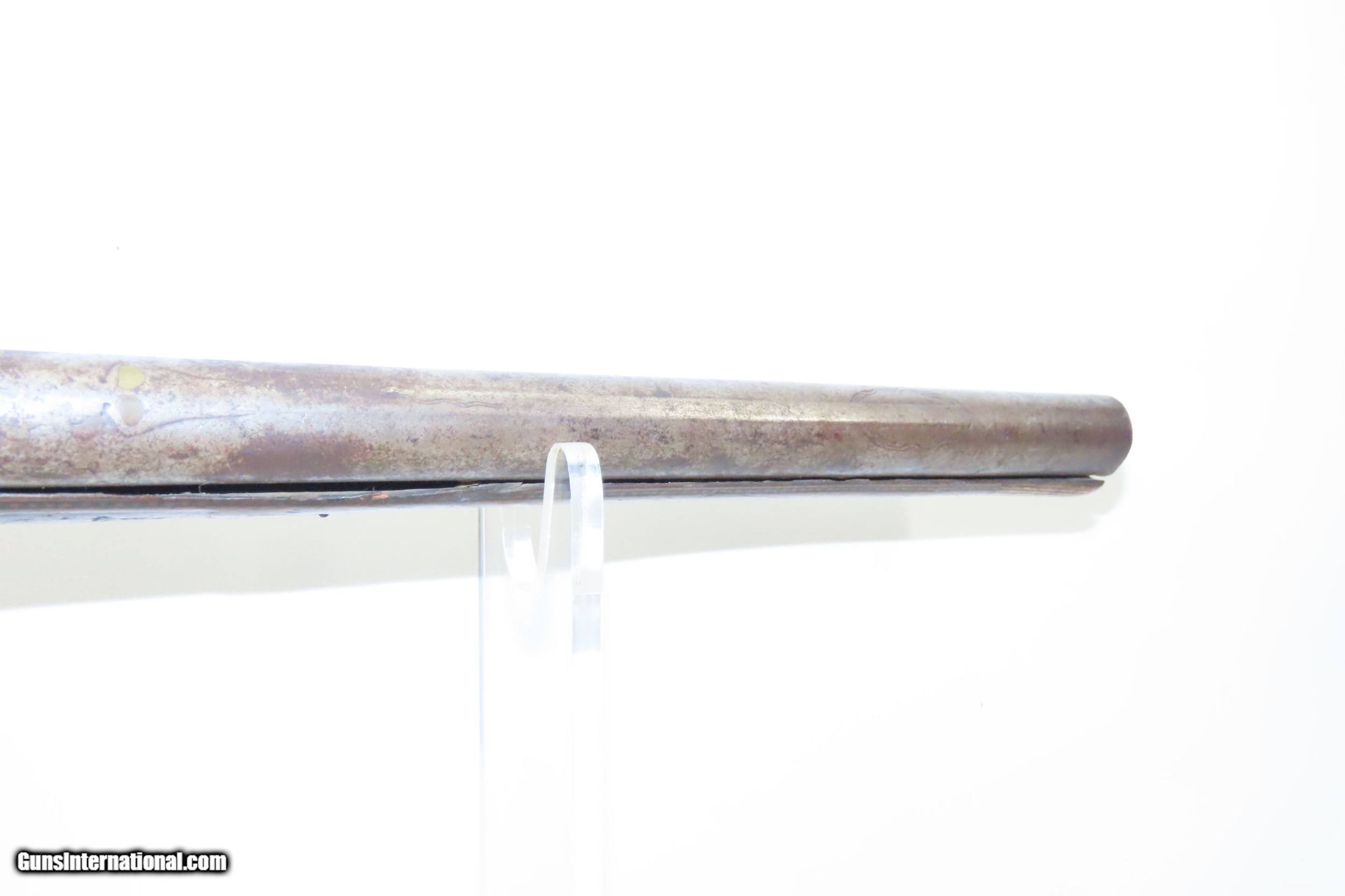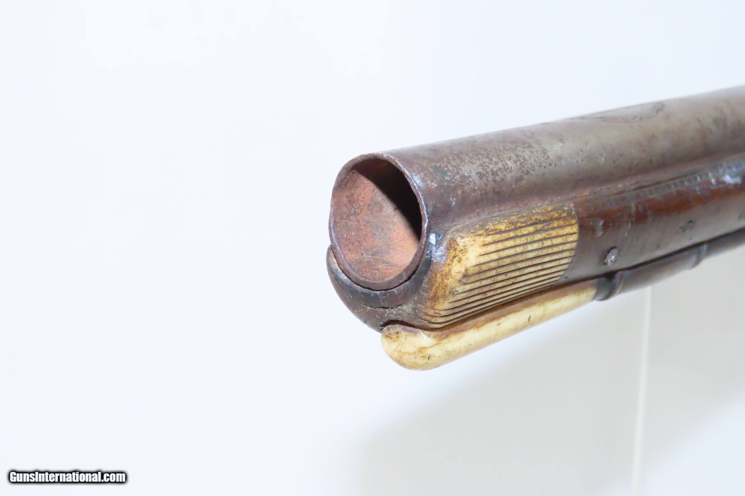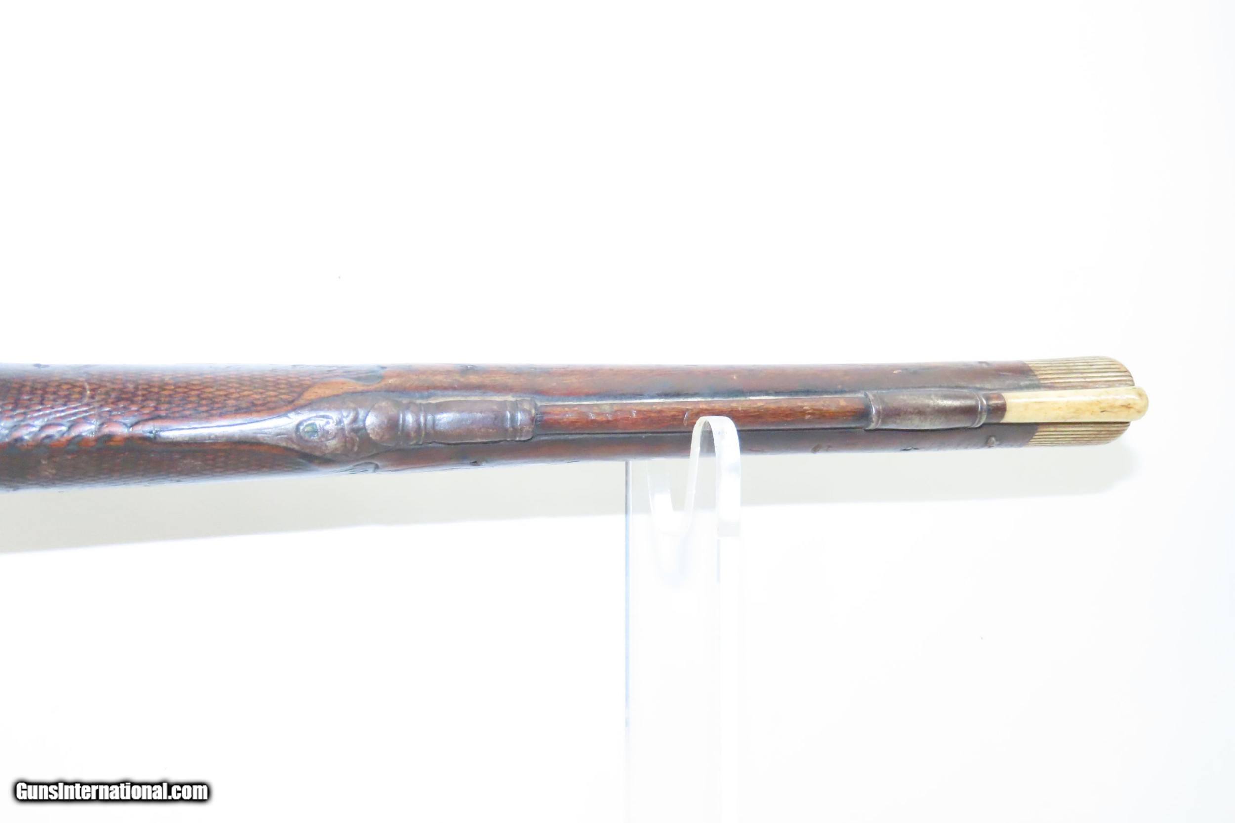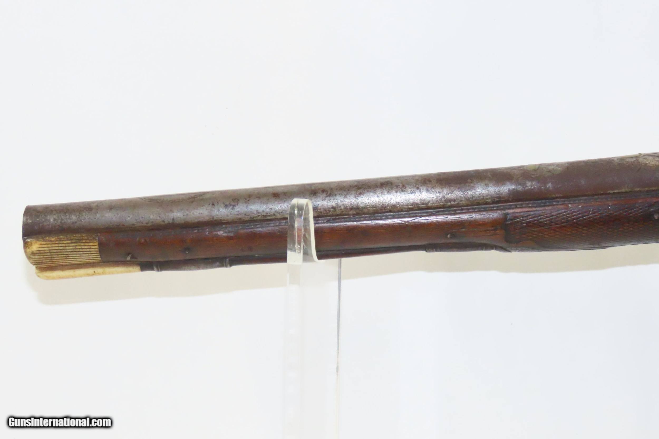 Description: Ornate SPANISH Antique FLINTLOCK Pistol .65 Caliber Single Shot Sidearm Engraved Hardware, Carved Stock, Ivory Tipped Here we present an antique Spanish Flintlock Pistol, made circa the late-18th Century. This large bore pistol would have been intended for use as a martial sidearm. Its barrel is a very long 14 inches in length. This pistol has a .65 caliber bore and would have been most at home tucked into a belt or holster when not punching large holes. One can easily imagine this in the hands of a military officer or perhaps even a Spanish pirate. This one has been well-used and remain in good condition. The pommel is capped in the European style and would have made a good bludgeon once the single shot was fired. The pommel cap and trigger guard are decorated with small primitive figures. The stock has been carved and checkered. Spanish maker markings can be observed on the top of the barrel. The overall condition is good. Strong and tight action. Smooth, patinaed bore. Solid stock with an old chip on the right forend. Own the original! This is a legitimate antique and not a reproduction. Barrel is 14 inches. Caliber: .65 Flintlock Overall condition as seen in photos. Very Fast. Very Safe. FREE SHIPPING WORLDWIDE. Delivered directly to your door by express mail! Guaranteed AUTHENTIC & Includes CERTIFICATE OF AUTHENTICITY. ancestryguns $1995 #215321 SOLD Antique: Yes |