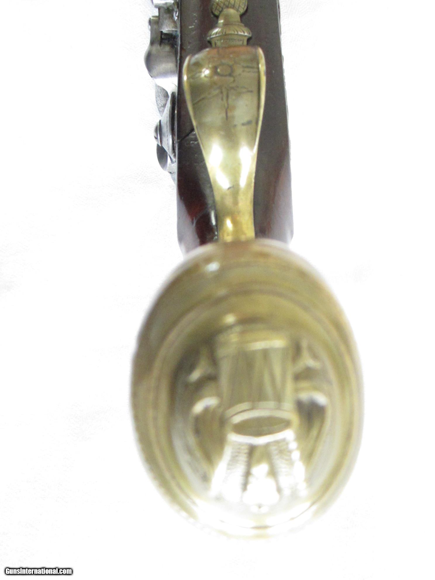 Description: Master gunsmith Edward Moody was located at Scott's Yard, Bush Lane, London, England from 1783 to 1784. Presumably this beautiful pistol was produced during that period. It is remarkable that this weapon is over 230 years old and is still in such fantastic condition. There are a few minor marks in the full walnut stock and what appears to be a professionally executed small repair on the right side at the very tip of the barrel. The hammer, lock and barrel are engraved, finished bright and in excellent condition. The lock is marked prominately with the makers name "MOODY", and the barrel is marked"LONDON" in sharp letters. The trigger guard, butt , side plate and escutcheon are all in brass and are very fancy with Royal/Military like designs. There are two prominent proof marks on the left side of the barrel opposite the hammer. The bore looks good. The frizzen is scratched indicating this gun has been fired but it obviously has seen little use and has been well cared for. There is a nice wooden ramrod. The barrel is 6" long and .65 caliber. The overall length is 11& 1/2 ". The hammer holds on full and 1/2 cock and the action is strong. This is one for the discriminateing collector. An antique so no FFL is required. Can be shipped direct. SOLD Antique: Yes Manufacturer: Edward Moody London Model: Gentlemans Flintlock Pistol Serial Number: none Caliber Info: .65 Bore: good Condition: Excellent Metal Condition: Excellent Wood Condition: Excellent Bore Condition: Good Barrels: one Barrel Type: round Action: flintlock Triggers: one Stock: full/walnut Finish: bright/brass Manufacture Date: 1783/1784 Engraving: yes Item Location: California |