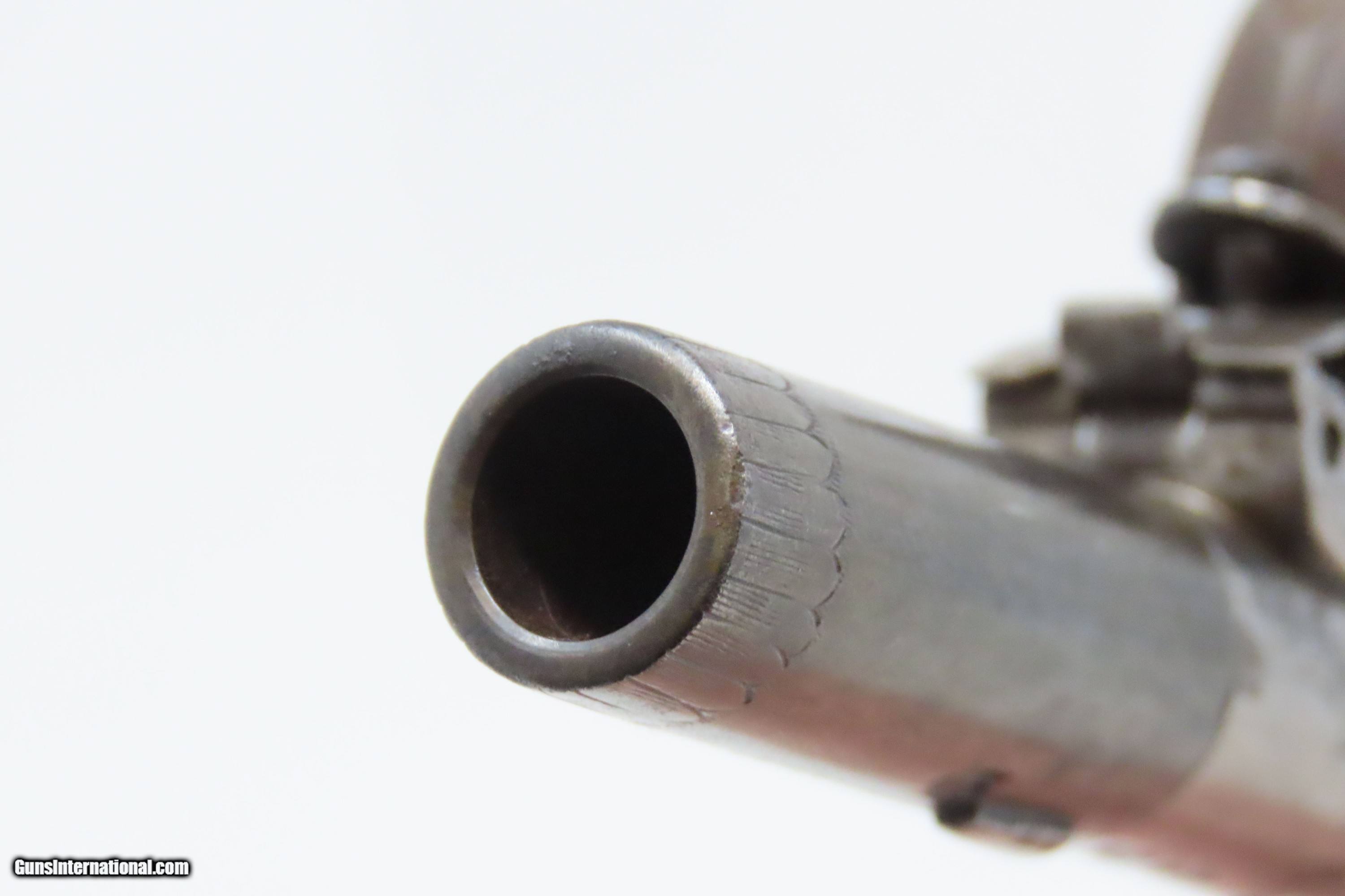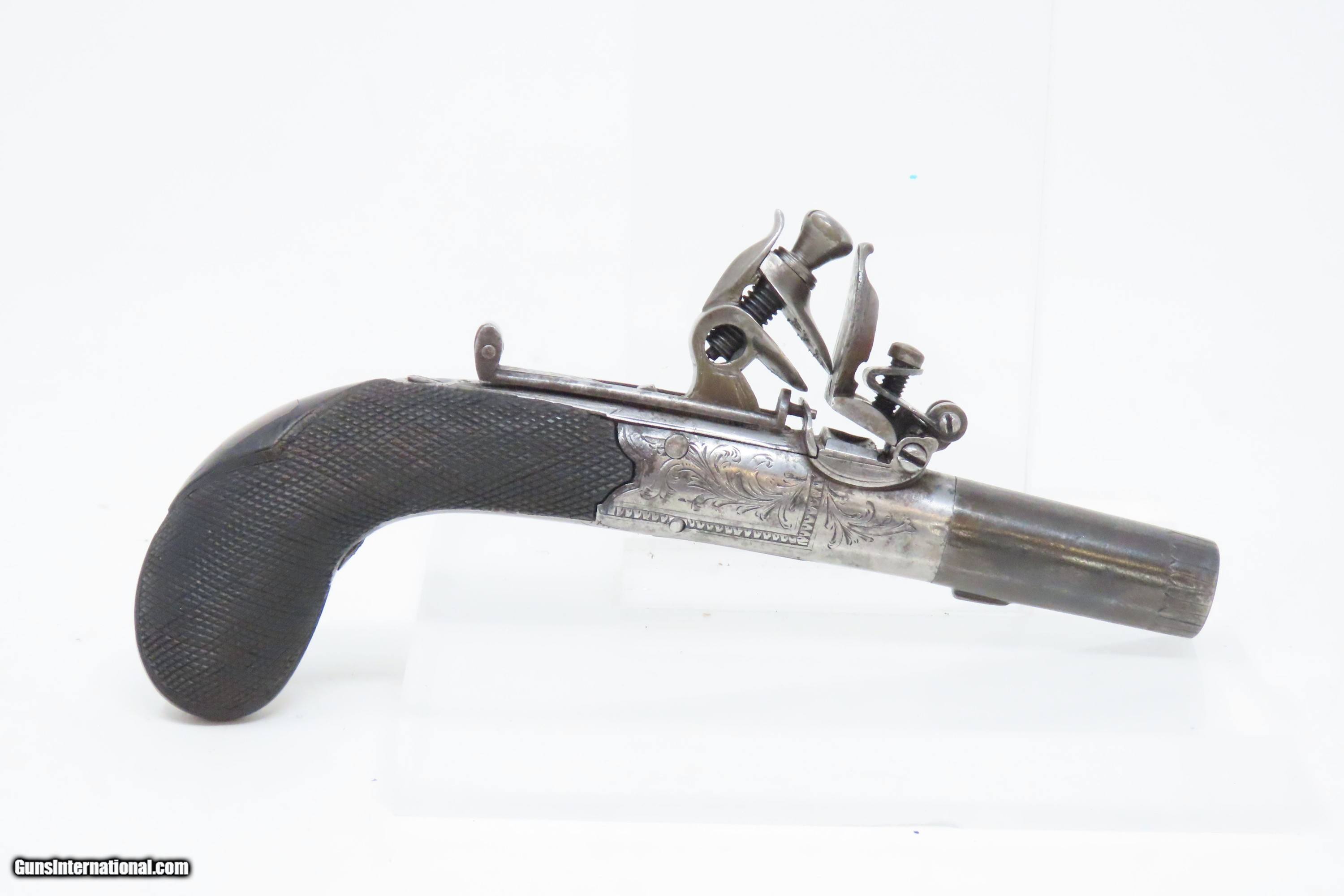 Description: PAIR of Antique BRITISH Mabson, Labron, & Mabson .32 Cal. FLINTLOCK Pistols Engraved, Made Circa the Early-1800s in Birmingham Here we present a pair of antique Mabson, Labron, & Mabson Flintlock Pocket Pistols, made circa the 1820s in Birmingham, England. The frames are marked with “Mabson, Labron, & Mabson” on the left. The undersides of the barrels are British proof marked. These very small pistols feature a turn-off barrel and folding trigger. The turn-off barrel made for easier loading without a ramrod, as well as allowed the user to use a larger ball than could be used by loading from the muzzle, creating a much better gas seal. The frames of these guns are nicely engraved on both sides of the frame, the underside of the pistol, and around the muzzle. These little self-defense pistols would have been most at home in the pocket of anyone in the busy cities of Paris, London, and Liege during the very early 1800s. These pistols are small, light and simple. They were favored among the gentry and women because of these traits. Men would carry them concealed in a waistcoat pocket and women would hide them in a hand muff. The overall condition is good. Blue finish on the barrel and bright otherwise. The actions are both strong. The bores are smooth and in good condition and both barrels turn off easily, as intended. The grips are solid. A nice little set, measuring about 5” overall each! Own the original! This is a legitimate antique and not a reproduction. Barrels are both 1-1/4 inches. Caliber: .32 Flintlock. Overall condition as seen in photos. Very Fast. Very Safe. FREE SHIPPING WORLDWIDE. Delivered directly to your door by express mail! Guaranteed AUTHENTIC & Includes CERTIFICATE OF AUTHENTICITY. ancestryguns $1750 #228565 SOLD Antique: Yes |