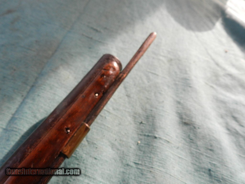 Description: With a 65 cal.,and a 12 3/8” part round part octagon smooth bore barrel with an oxidized and pitted bore. The barrel has heavy oxidation with pitting and handling showing later added varnish while the lock is smoky gray with oxidation blemishes. The one-piece walnut stock rates good as lightly cleaned with added varnish showing moderate handling marks and dents. The brass flared buttcap has light accent engraving and features a pair of extension on each side of the grip and rates good overall. The brass triggerguard has an extended tang ending in a finial with a pineapple extension in the front and rates good also. The ramrod finials and side plate are brass with a decorative brass plate on the backstrap. The lock may be a replacement and is marked “K&C” and appears to function mechanically, with the frkizzen showerng profuse sparks. When buying a gun always have it examined by a competent gunsmith before shooting. To buy a gun from me you must get a direct email for me, with details, and shipping cost. We don’t have a web site .I prefer money orders or a check. Item ships when funds come in. I try to keep guns affordable, which means I make less money than most dealers. You won’t get altitude sickness, or nose bleed, with my prices! I consistently have the best selection of older guns If you attempt to buy, you must still contact us for details . Best to email to buy. Sometimes a local person can stop buy and purchase before the gun is removed. Sometimes not home to get calls. Some guns are required shipment to a gun dealer near you for a transfer to you when it arrives. Otherwise many older or black powder guns ship to your door. With the widest selection of older guns at great prices, We don’t have a store, and sell on the internet only. I’m easy to get along with. Thank You Antique: Yes Price: $795.00 Contact Seller |