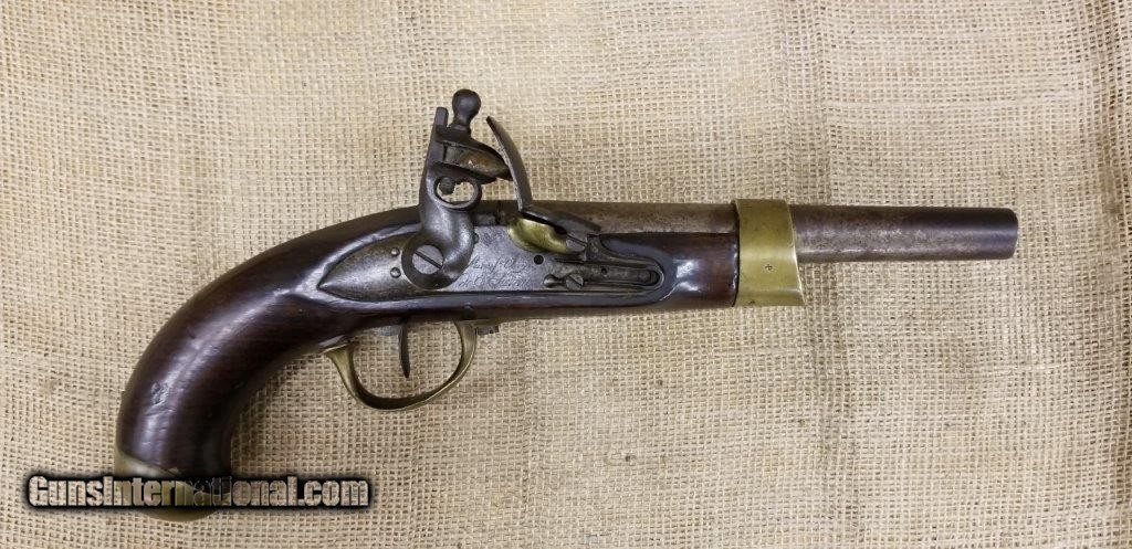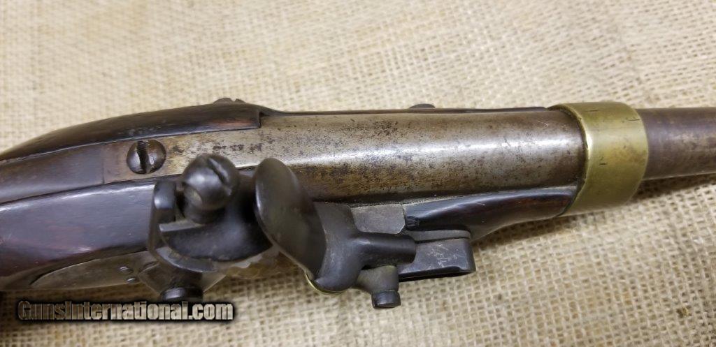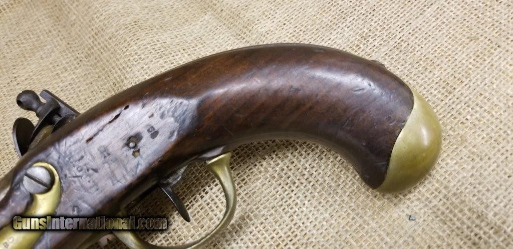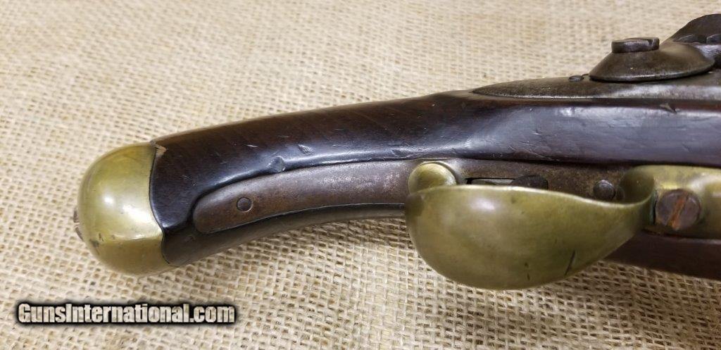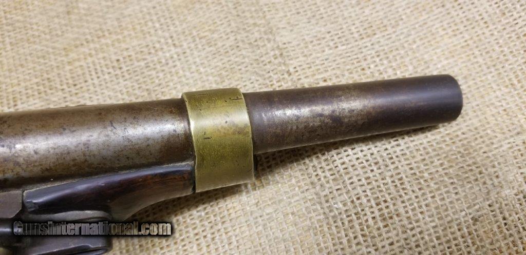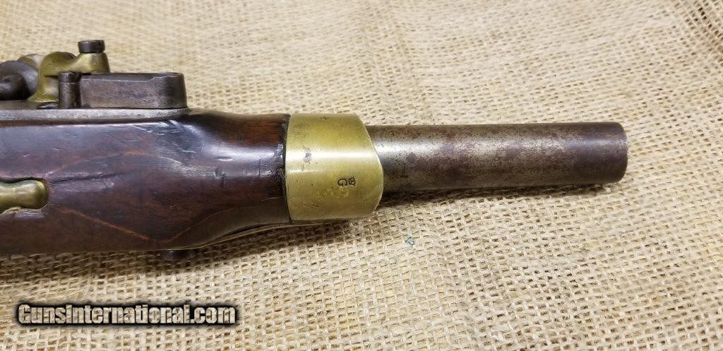 Description: Pistol Model An XIII Manufacture Imperiale of St. Etienne 1813 Only a few years after the introduction of the flintlock pistol model An IX in 1802, it was already decided to produce a new model pistol. This was the result of a discussion between the army and navy. The compromises are made to the best of the army pistol An IX and that of the naval pistol Model 1786 and combines them into a new model pistol, the model An XIII. The production started in 1806 and very large numbers were produced in order to meet the needs of the Napoleonic Armies. The An XIII pistol model remained in production until 1818 and more than 300,000 pistols were produced. This model was not only made in the factories in France, but also in various factories in the occupied countries. The pistol model An XIII was the most used handgun of Napoleon's cavalry. Inspector Gouilloud mark of Crown over G in numerous places, model number on top of barrel worn off, missing ramrod. This pistol was produced in the famous French town of St. Etienne, lockplate is marked “Manifacture Imperiale de S. Etienne” which means Saint Etienne Imperial Manufacture Brass furniture and walnut stock. Two stage action, smoothbore, .69 caliber, 7 3/4” tapered round barrel. Brass furniture includes flashpan, buttcap, barrel band, triggerguard & sideplate. Overall length is 13 3/4 inches. SOLD Antique: Yes |