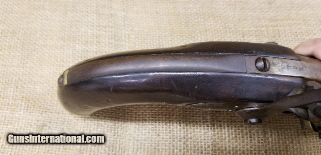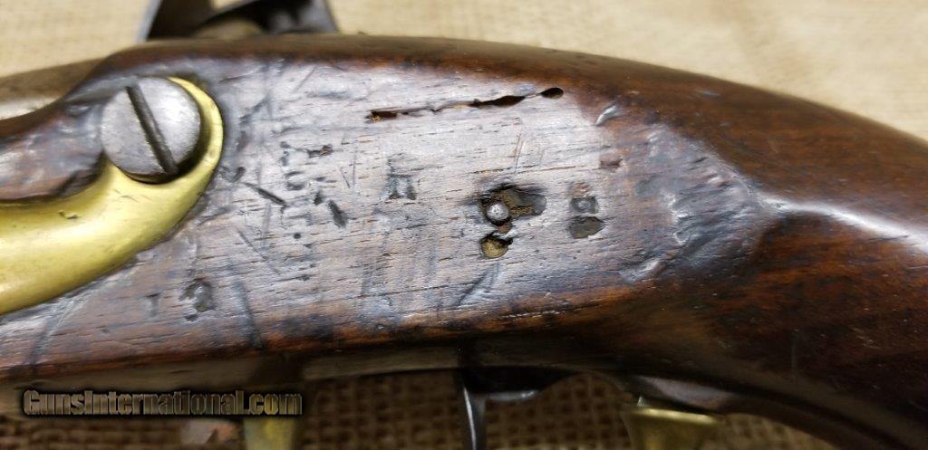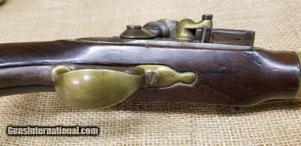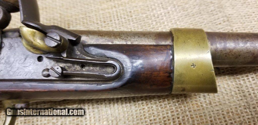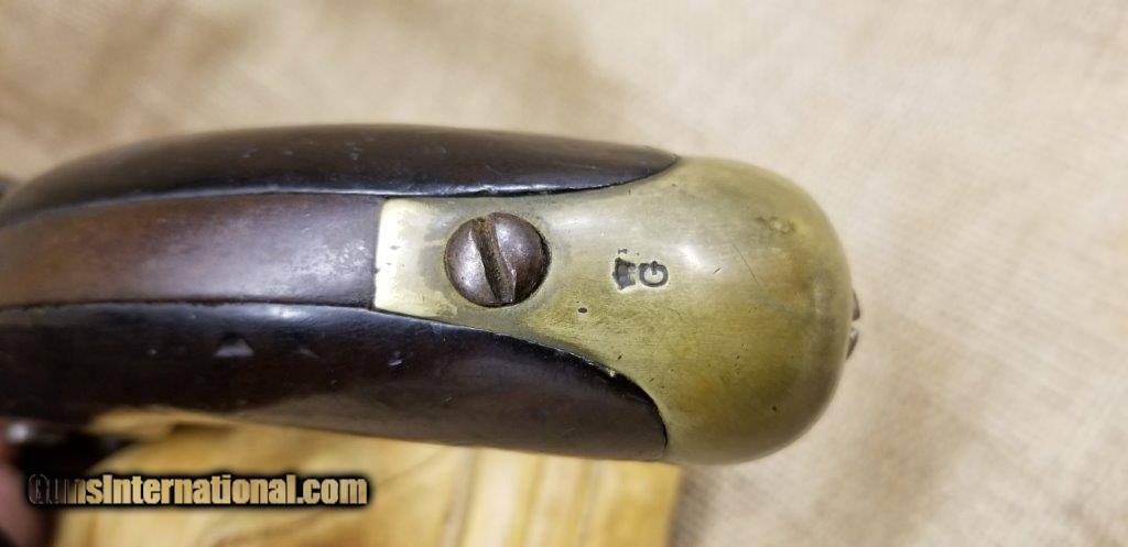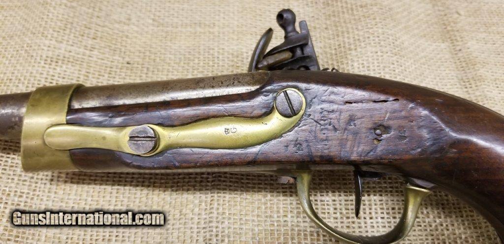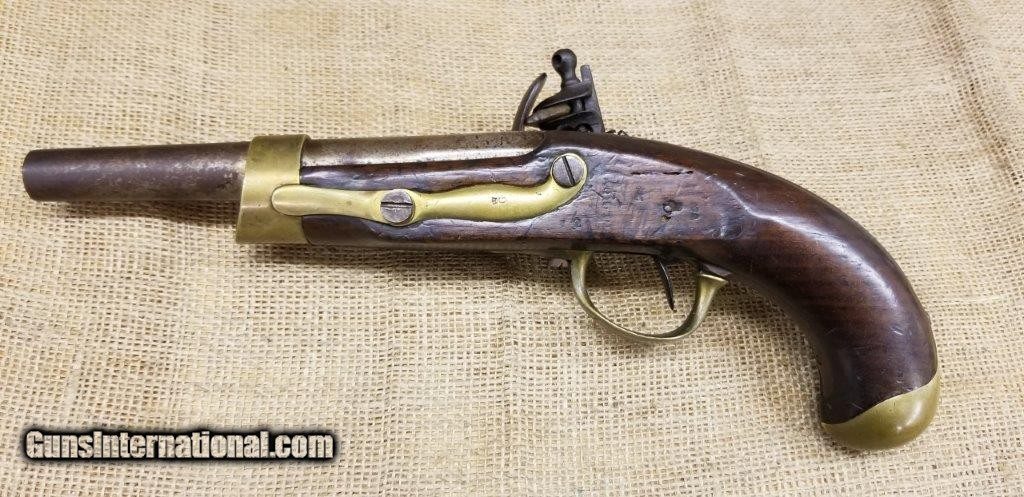 Description: Pistol Model An XIII Manufacture Imperiale of St. Etienne 1813 Only a few years after the introduction of the flintlock pistol model An IX in 1802, it was already decided to produce a new model pistol. This was the result of a discussion between the army and navy. The compromises are made to the best of the army pistol An IX and that of the naval pistol Model 1786 and combines them into a new model pistol, the model An XIII. The production started in 1806 and very large numbers were produced in order to meet the needs of the Napoleonic Armies. The An XIII pistol model remained in production until 1818 and more than 300,000 pistols were produced. This model was not only made in the factories in France, but also in various factories in the occupied countries. The pistol model An XIII was the most used handgun of Napoleon's cavalry. Inspector Gouilloud mark of Crown over G in numerous places, model number on top of barrel worn off, missing ramrod. This pistol was produced in the famous French town of St. Etienne, lockplate is marked “Manifacture Imperiale de S. Etienne” which means Saint Etienne Imperial Manufacture Brass furniture and walnut stock. Two stage action, smoothbore, .69 caliber, 7 3/4” tapered round barrel. Brass furniture includes flashpan, buttcap, barrel band, triggerguard & sideplate. Overall length is 13 3/4 inches. SOLD Antique: Yes |