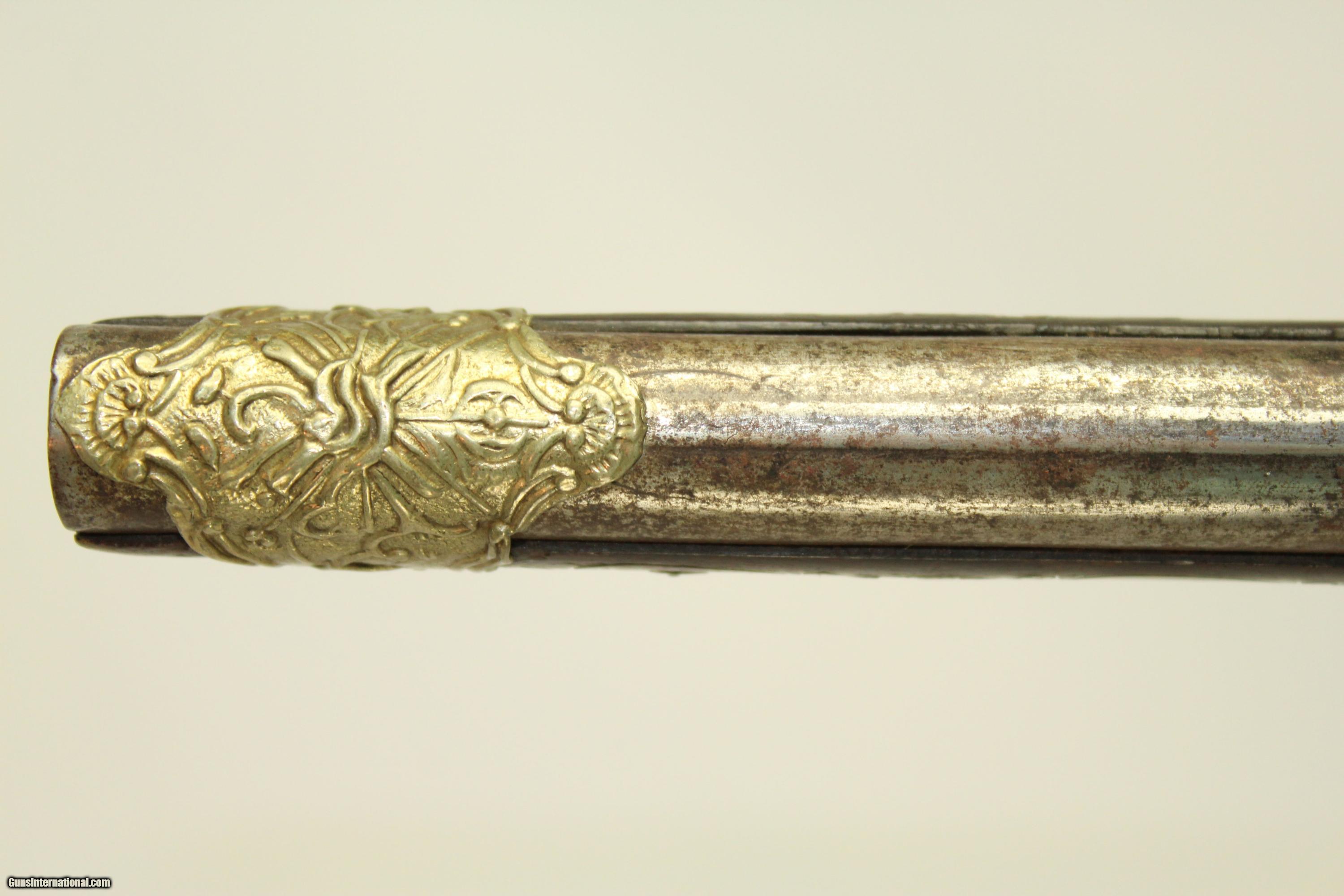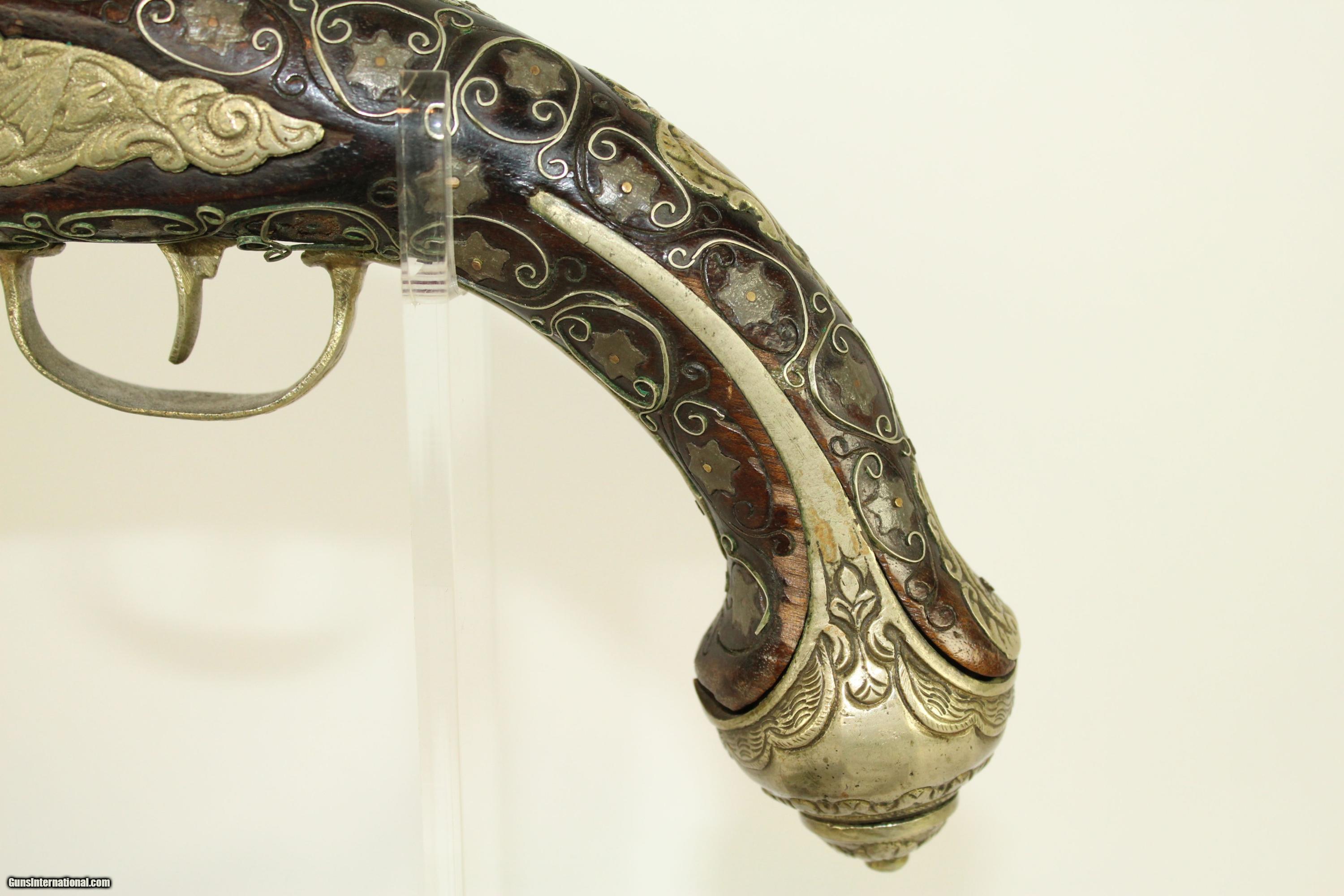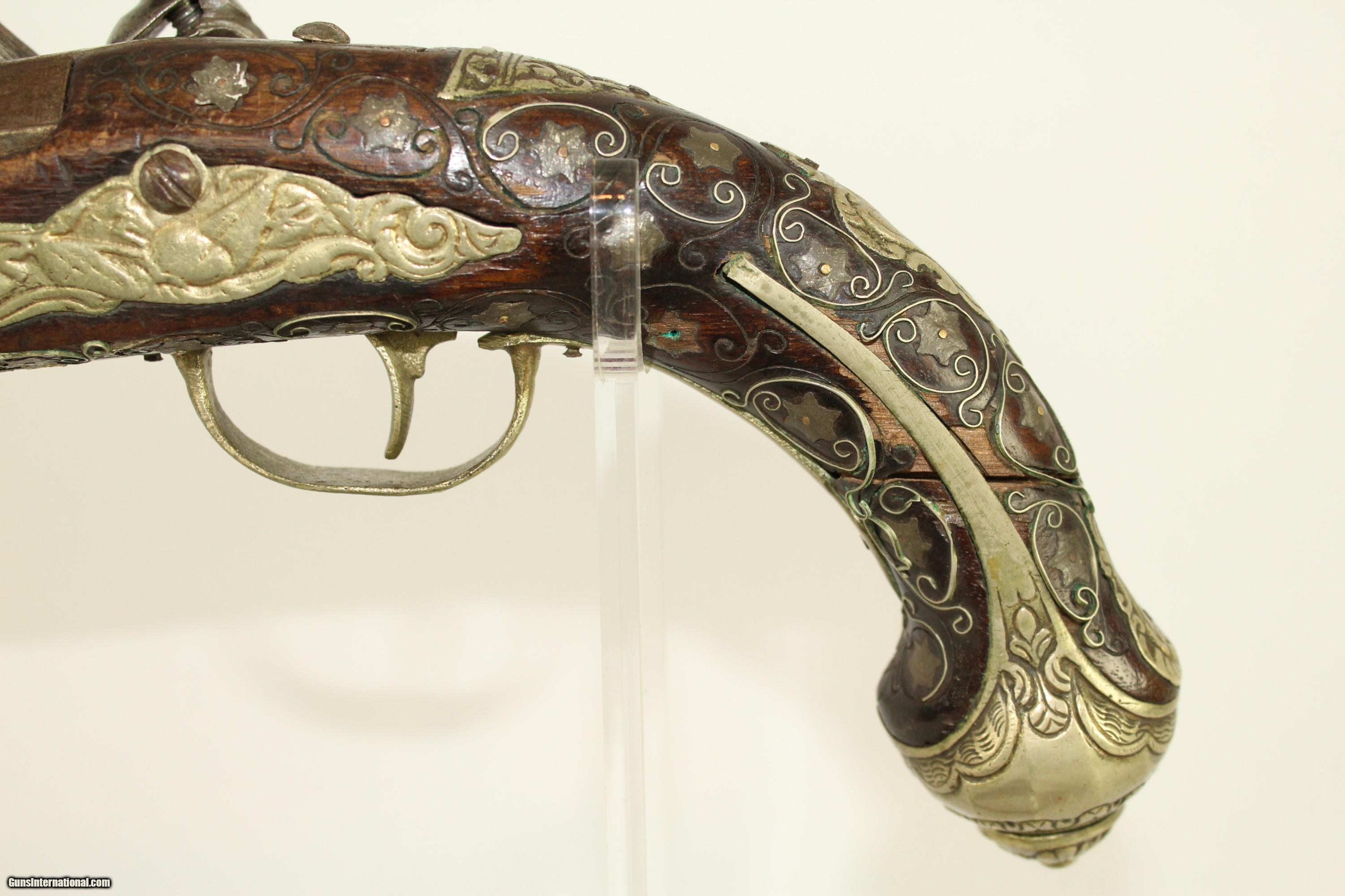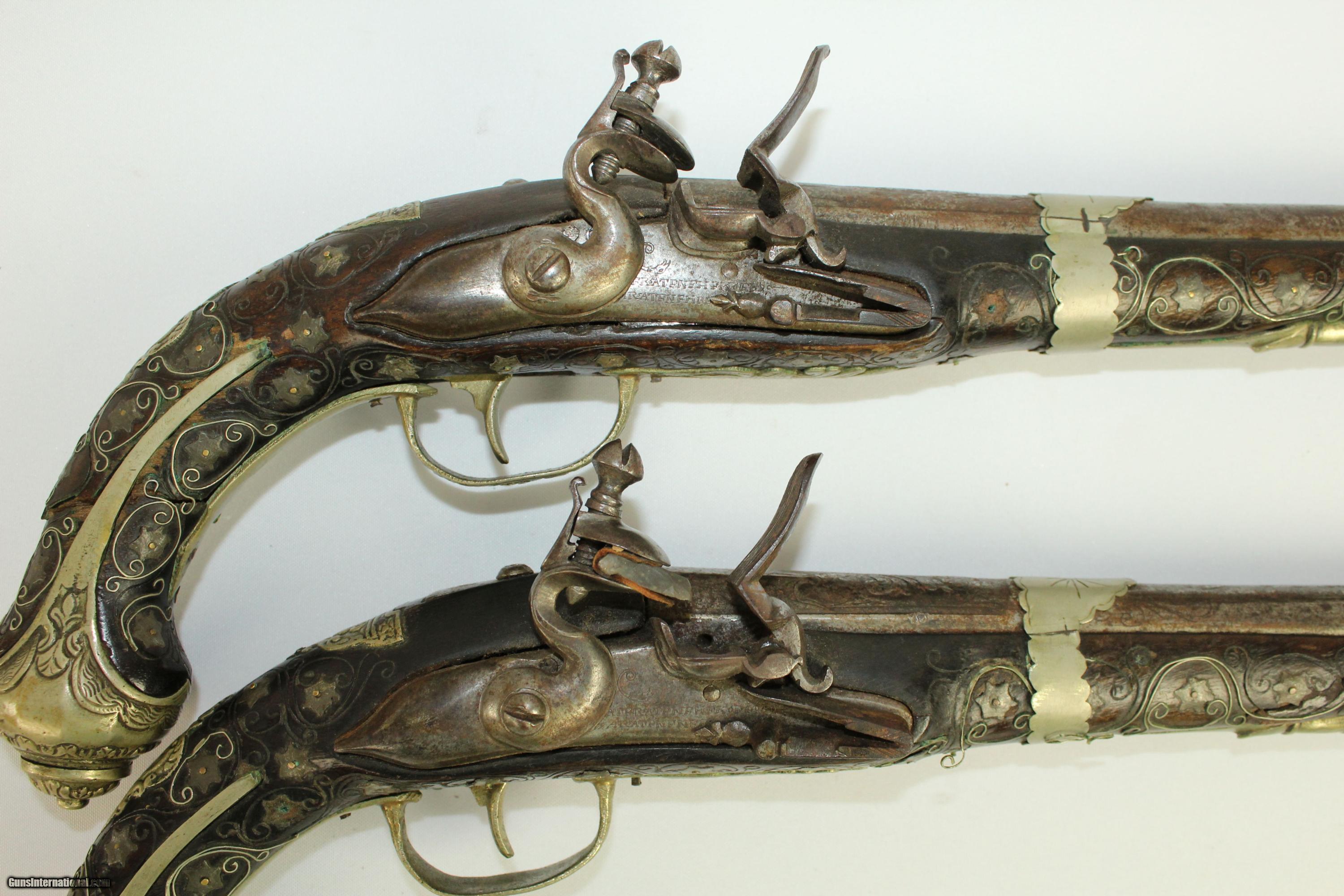 Description: U.S. President Grover Cleveland’s Turkish Pistols With Notarized Statement from 1948, Double Holster Here we present an antique Pair of Turkish Flintlock Pistols, made in the early 19th century. With the pistols comes an ornate double holster. The pistols themselves are highly decorated and include extensive wire inlays, figured brass pommels and accents, as well as barrel bands. Each pistol has a fixed ramrod which is typical of Ottoman pistols. Also with this set comes a document notarized on October 13, 1948, stating that William Thayer purchased these pistols from U.S. President Grover Cleveland’s heirs and that this pistol was at one time owned by him. President Cleveland was a Democrat who, before being elected President, was a lawyer, Sheriff of Erie County in New York, Mayor of Buffalo, and Governor of New York. He was the only U.S. President in history to have served two non-consecutive terms. He was defeated during his re-election by Benjamin Harrison in what has become to be known as one of the most corrupt elections in U.S. history. As he and his family were leaving the White House his wife, Frances Cleaveland, instructed a staffer, saying “I want you to take good care of all the furniture and the ornaments in the house, for I want to find everything just as it is now, when we come back again.” Cleveland then defeated Harrison 4 years later in his re-election to regain the post. It is interesting to note that during his second term, on several occasions, Cleveland voraciously condemned the Ottoman Turks’ massacre of Armenian Christians. One occasion followed the Occupation of the Ottoman Bank in Constantinople by the Armenian Revolutionary Federation on August 26, 1896, when 26 of the group armed themselves and captured international attention by occupying (and not robbing) the bank. “I do not believe that the present sombre prospect in Turkey will be long permitted to offend the sight of Christendom. It so mars the humane and enlightened civilization that belongs to the close of the 19th century that it seems hardly possible that the earnest demand of good peoples throughout the Christian world for its corrective treatment will remain unanswered.” He was a non-interventionist, who followed his own interpretation of the Monroe Doctrine. Therefore he declined to send troops to intervene in the crisis, but instead offered asylum to those wanting to flee the terror of the Sultan. One wonders if these pistols and their holster might not be a gift from grateful Armenians. Cleveland spent a considerable amount of his free time hunting and fishing, and it is said that he had a name for each of the rifles in his collection. “Death and Destruction” was the name of his favorite. The NRA currently has in their collection one of his shotguns, a rare Colt 8 gauge side-by-side. The overall condition of the pistols is fair. The barrels and locks share a mostly even patina. The markings on the locks are clear. The stocks are heavily inlaid with wire and décor. The wood is somewhat chipped and repaired, but are absolutely suited for display. The bores are in very good condition. The actions are functional. The holster is delicate and complete a nice display. Own the original! This is a legitimate antique and not a reproduction. Barrel is 13-3/4 inches in length. Caliber: .66 The bores are in very good condition and the actions are functional. Overall condition as seen in photos. Here are two very interesting pistols from the collection of an American President. Very Fast. Very Safe. FREE SHIPPING WORLDWIDE. Delivered directly to your door by express mail! Guaranteed AUTHENTIC & Includes CERTIFICATE OF AUTHENTICITY. ancestryguns $4500 #21669 & 21670 SOLD Antique: Yes |