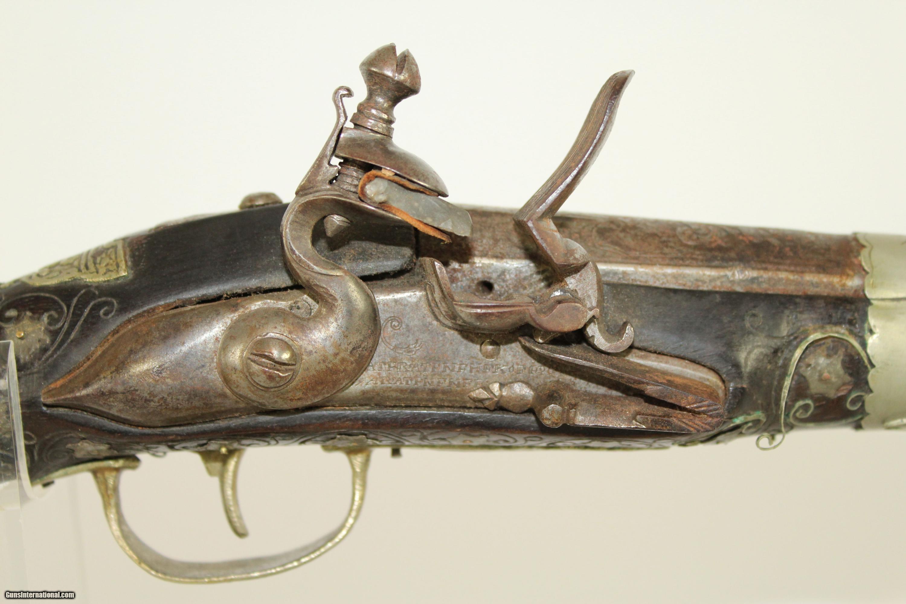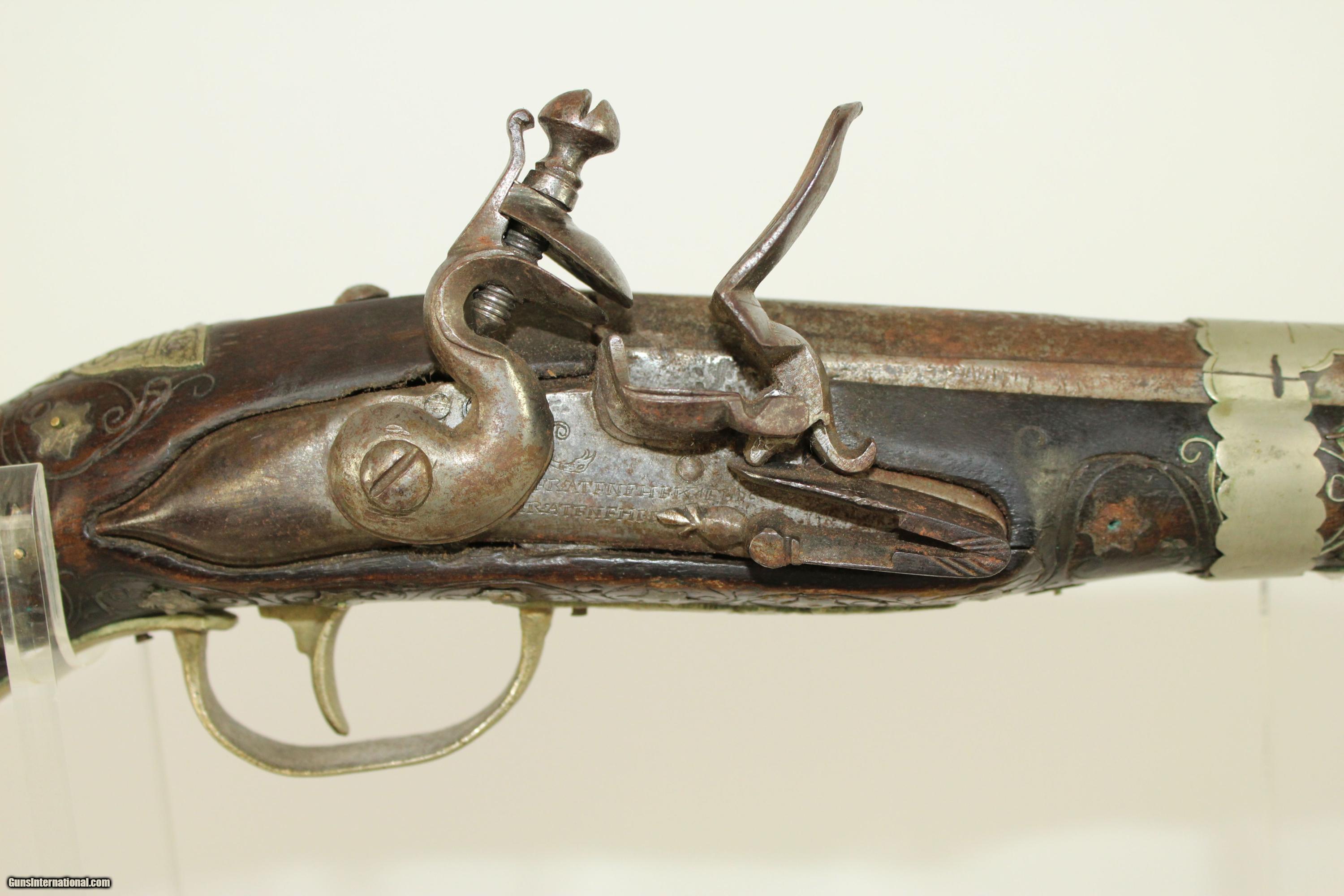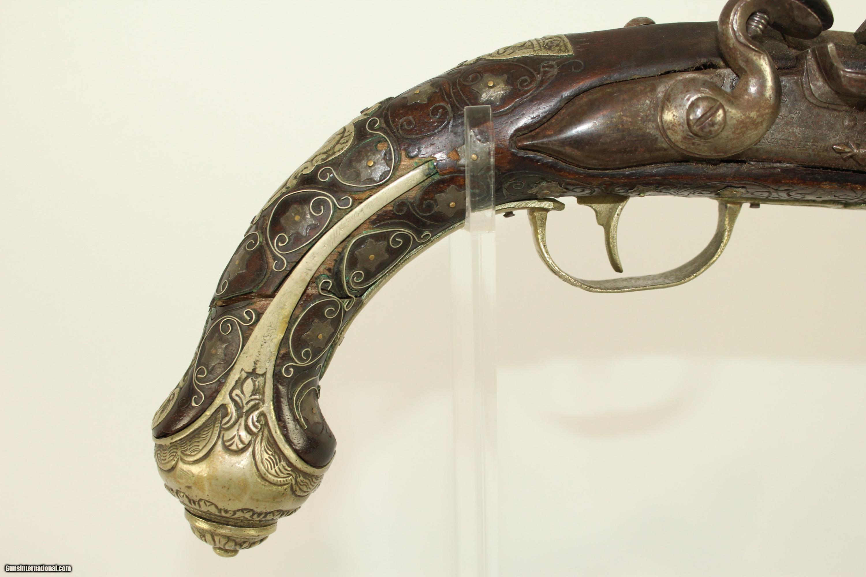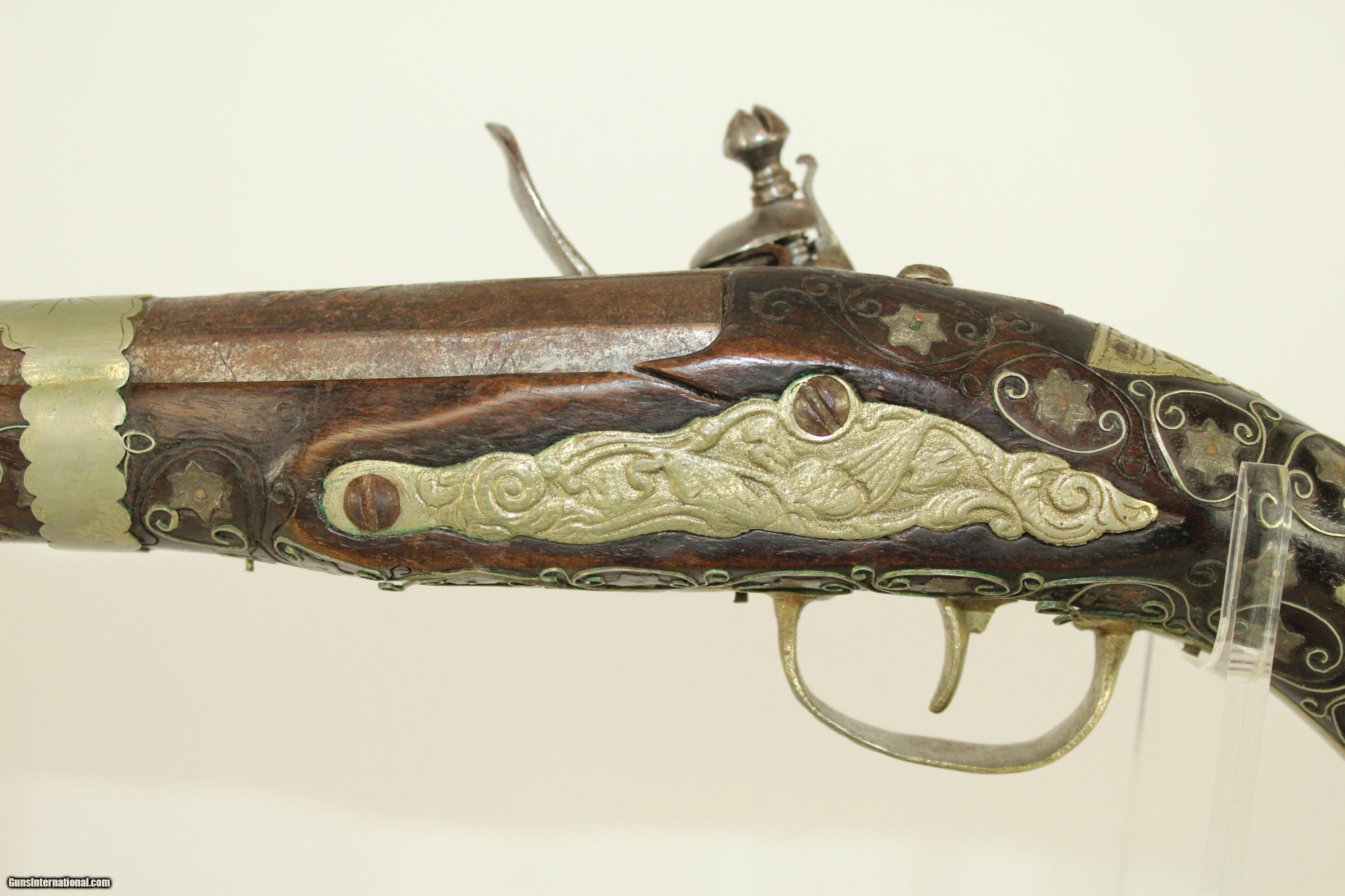 Description: U.S. President Grover Cleveland’s Turkish Pistols With Notarized Statement from 1948, Double Holster Here we present an antique Pair of Turkish Flintlock Pistols, made in the early 19th century. With the pistols comes an ornate double holster. The pistols themselves are highly decorated and include extensive wire inlays, figured brass pommels and accents, as well as barrel bands. Each pistol has a fixed ramrod which is typical of Ottoman pistols. Also with this set comes a document notarized on October 13, 1948, stating that William Thayer purchased these pistols from U.S. President Grover Cleveland’s heirs and that this pistol was at one time owned by him. President Cleveland was a Democrat who, before being elected President, was a lawyer, Sheriff of Erie County in New York, Mayor of Buffalo, and Governor of New York. He was the only U.S. President in history to have served two non-consecutive terms. He was defeated during his re-election by Benjamin Harrison in what has become to be known as one of the most corrupt elections in U.S. history. As he and his family were leaving the White House his wife, Frances Cleaveland, instructed a staffer, saying “I want you to take good care of all the furniture and the ornaments in the house, for I want to find everything just as it is now, when we come back again.” Cleveland then defeated Harrison 4 years later in his re-election to regain the post. It is interesting to note that during his second term, on several occasions, Cleveland voraciously condemned the Ottoman Turks’ massacre of Armenian Christians. One occasion followed the Occupation of the Ottoman Bank in Constantinople by the Armenian Revolutionary Federation on August 26, 1896, when 26 of the group armed themselves and captured international attention by occupying (and not robbing) the bank. “I do not believe that the present sombre prospect in Turkey will be long permitted to offend the sight of Christendom. It so mars the humane and enlightened civilization that belongs to the close of the 19th century that it seems hardly possible that the earnest demand of good peoples throughout the Christian world for its corrective treatment will remain unanswered.” He was a non-interventionist, who followed his own interpretation of the Monroe Doctrine. Therefore he declined to send troops to intervene in the crisis, but instead offered asylum to those wanting to flee the terror of the Sultan. One wonders if these pistols and their holster might not be a gift from grateful Armenians. Cleveland spent a considerable amount of his free time hunting and fishing, and it is said that he had a name for each of the rifles in his collection. “Death and Destruction” was the name of his favorite. The NRA currently has in their collection one of his shotguns, a rare Colt 8 gauge side-by-side. The overall condition of the pistols is fair. The barrels and locks share a mostly even patina. The markings on the locks are clear. The stocks are heavily inlaid with wire and décor. The wood is somewhat chipped and repaired, but are absolutely suited for display. The bores are in very good condition. The actions are functional. The holster is delicate and complete a nice display. Own the original! This is a legitimate antique and not a reproduction. Barrel is 13-3/4 inches in length. Caliber: .66 The bores are in very good condition and the actions are functional. Overall condition as seen in photos. Here are two very interesting pistols from the collection of an American President. Very Fast. Very Safe. FREE SHIPPING WORLDWIDE. Delivered directly to your door by express mail! Guaranteed AUTHENTIC & Includes CERTIFICATE OF AUTHENTICITY. ancestryguns $4500 #21669 & 21670 SOLD Antique: Yes |