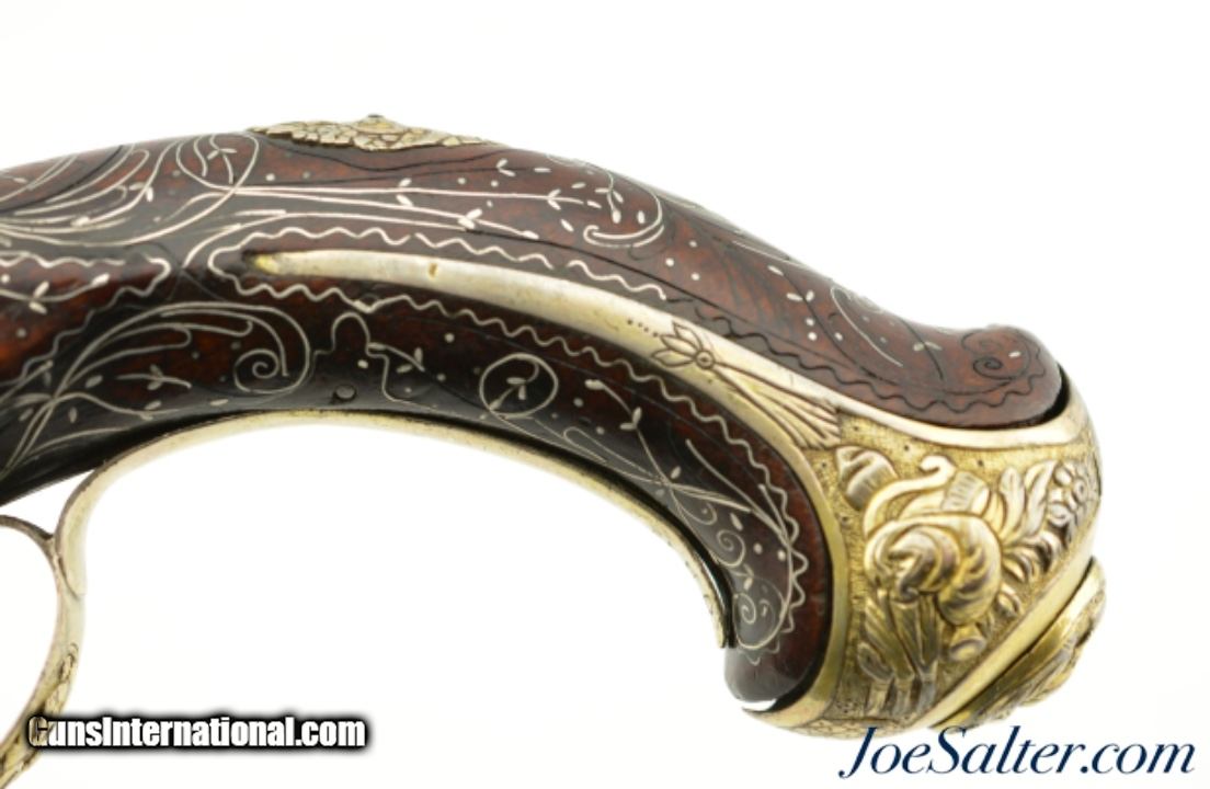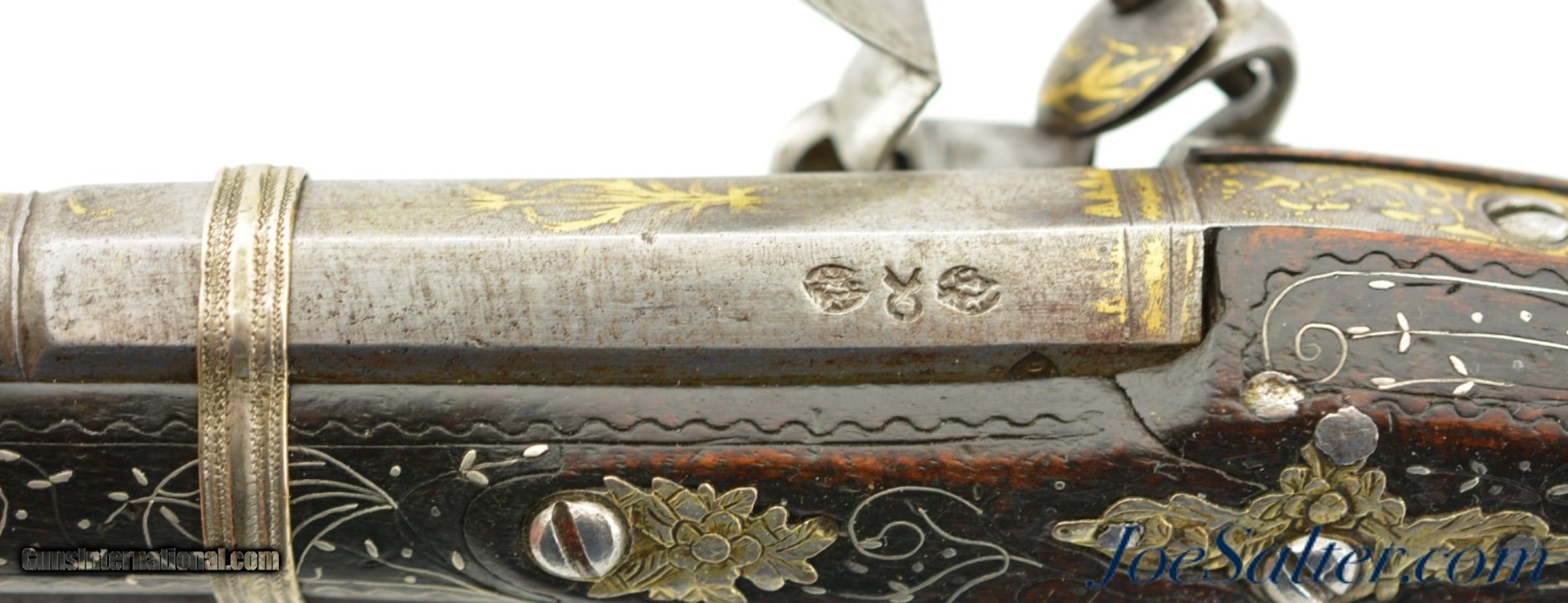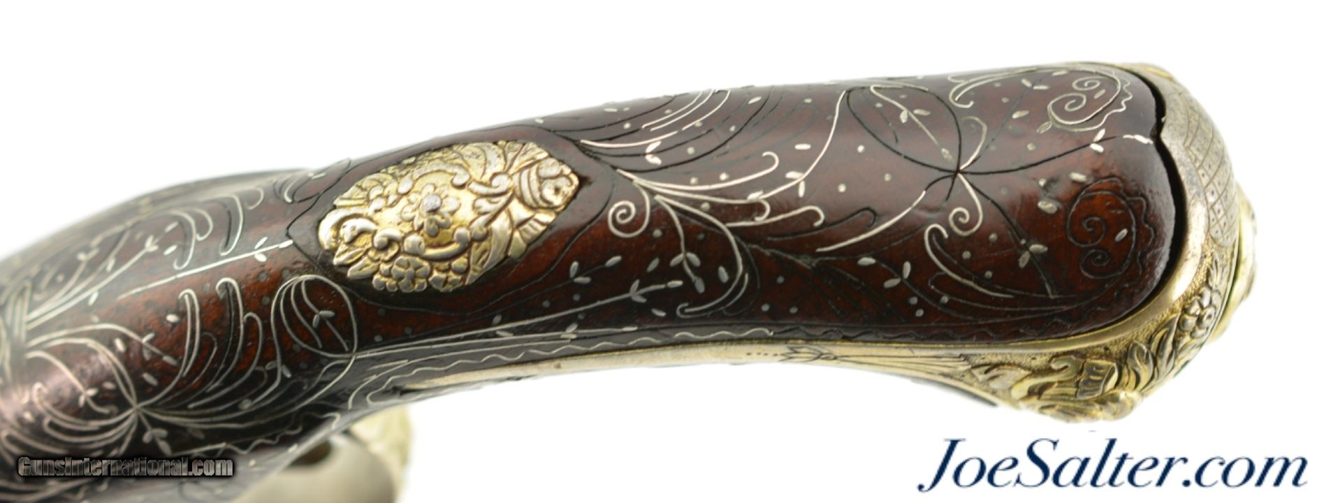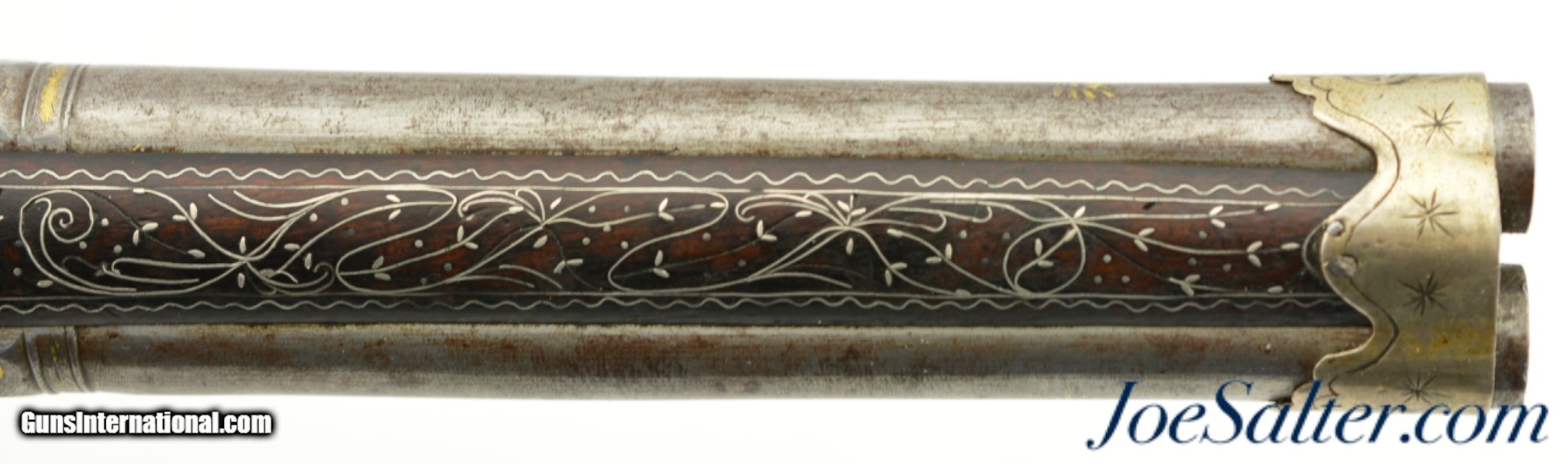 Description: NSN, .56 Caliber, 10 1/2" part octagon barrels with very good, lightly pitted bores. This is an exquisitely embellished pistol that has a two-level pan with sliding cover allowing the user to fire the top barrel first, then the lower barrel. The barrels themselves have extensive gold decorations at their breeches behind the wedding band transitions. Two silver bands are present at the breech and muzzles, the latter has engraved Turkish Crescent decorations on top and bottom. The lock has extensive foliate embellishments in gold as well. The walnut stock is liberally decorated with delicate silver wire inlays, and the deep relief engraved buttcap and trigger guard appear to have been transplanted from a Western European-made gun. The action is fully functional. This is a truly handsome pistol, and would make a wonderful addition to any collection. Antique; SOLD Antique: Yes |
