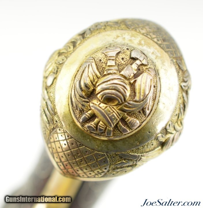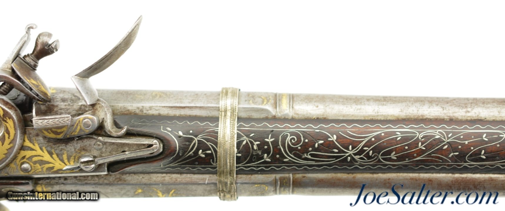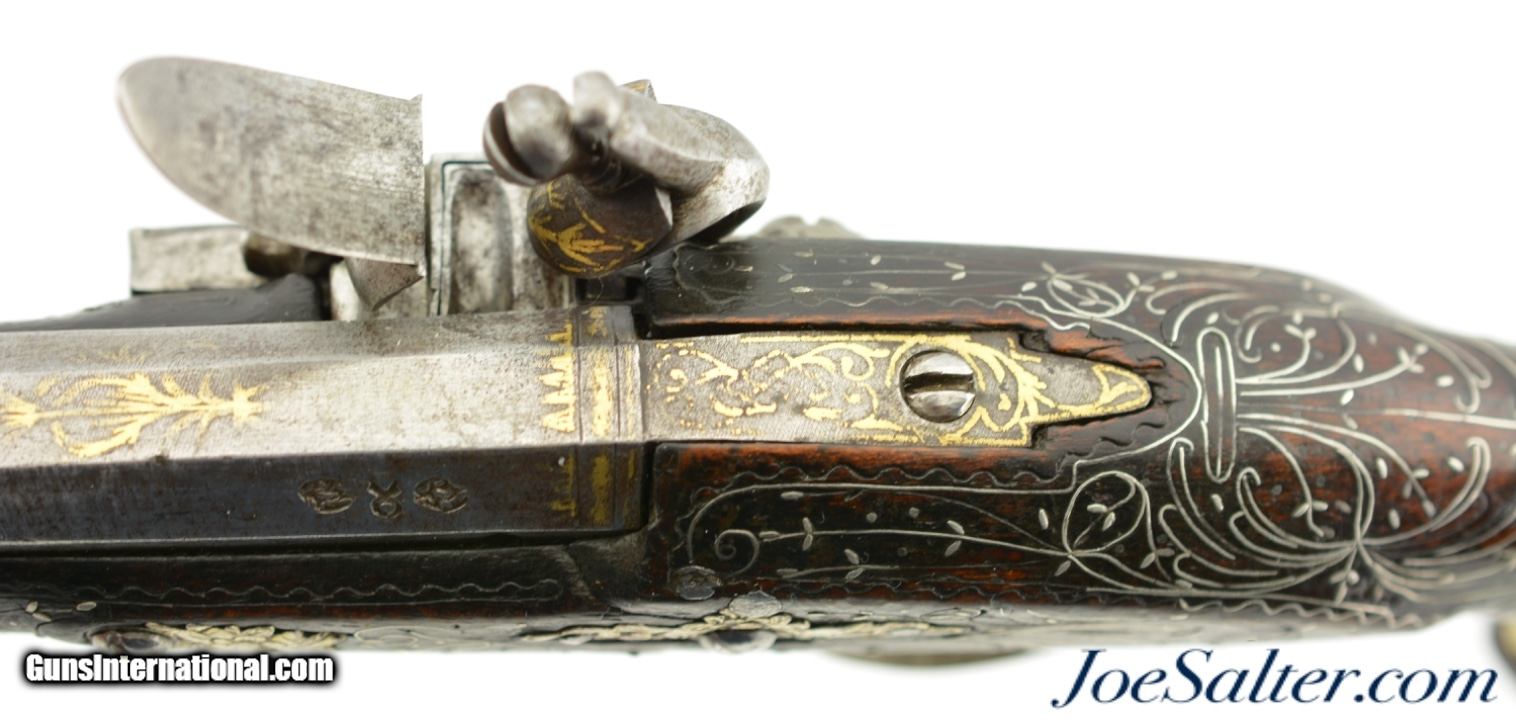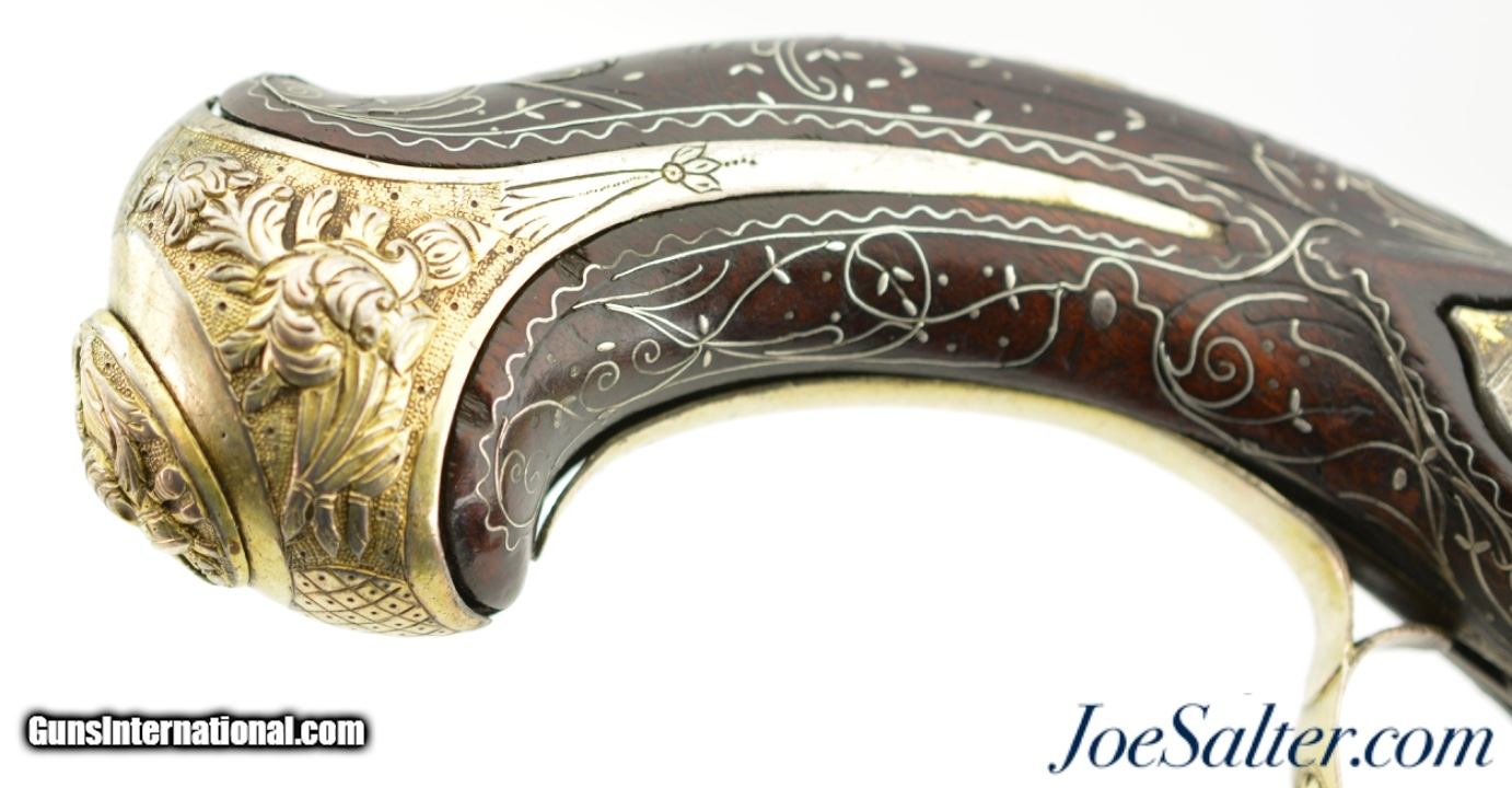 Description: NSN, .56 Caliber, 10 1/2" part octagon barrels with very good, lightly pitted bores. This is an exquisitely embellished pistol that has a two-level pan with sliding cover allowing the user to fire the top barrel first, then the lower barrel. The barrels themselves have extensive gold decorations at their breeches behind the wedding band transitions. Two silver bands are present at the breech and muzzles, the latter has engraved Turkish Crescent decorations on top and bottom. The lock has extensive foliate embellishments in gold as well. The walnut stock is liberally decorated with delicate silver wire inlays, and the deep relief engraved buttcap and trigger guard appear to have been transplanted from a Western European-made gun. The action is fully functional. This is a truly handsome pistol, and would make a wonderful addition to any collection. Antique; SOLD Antique: Yes |