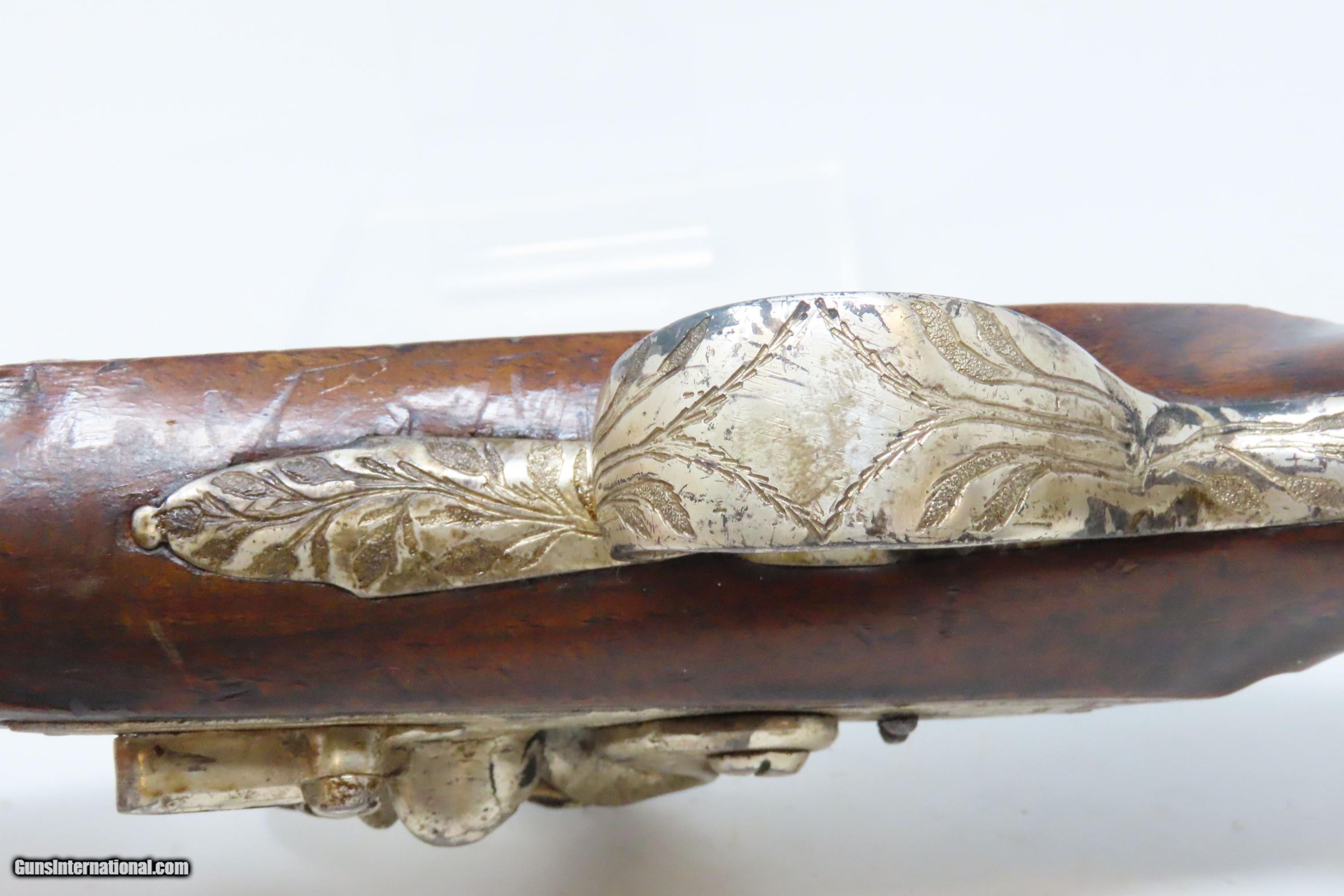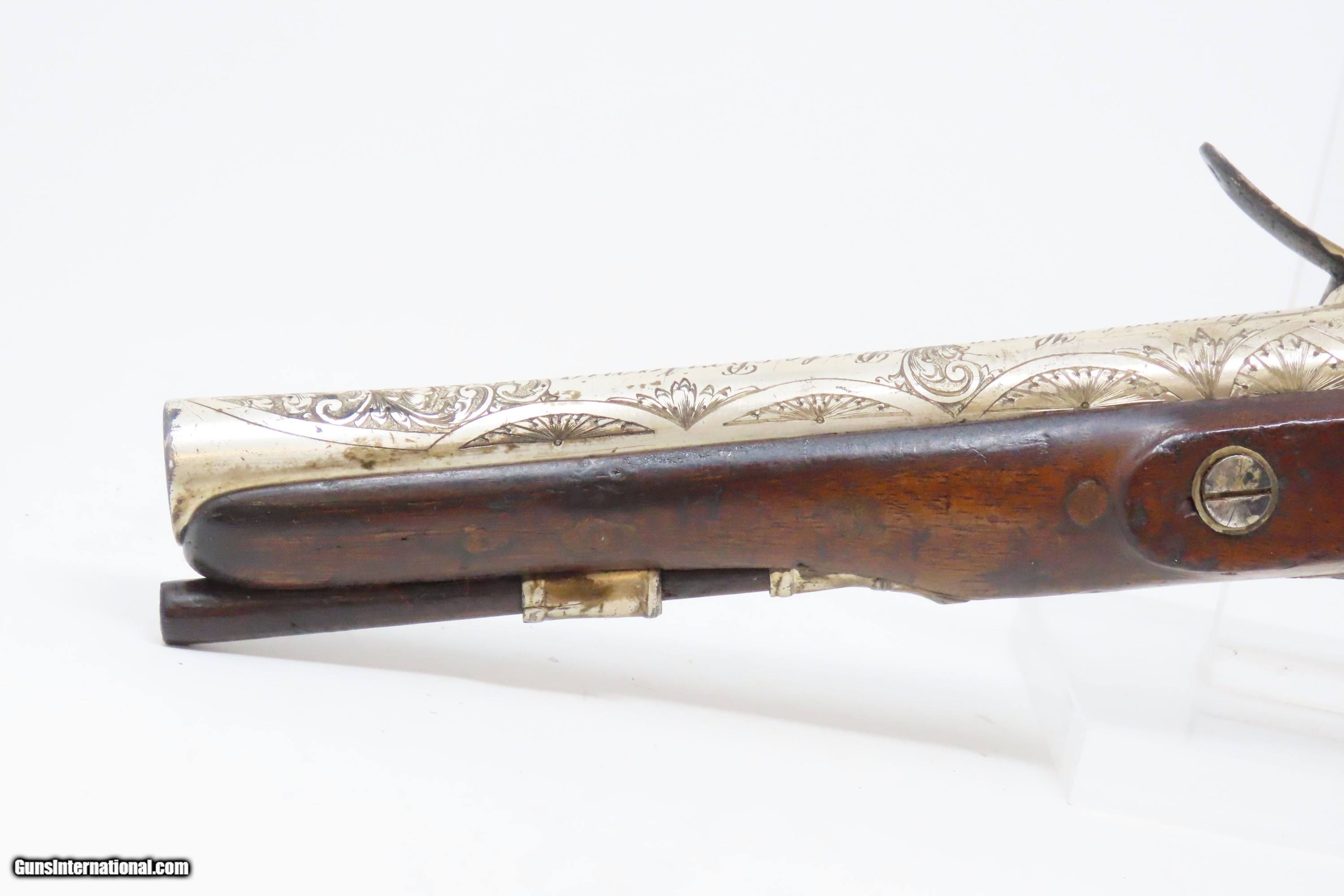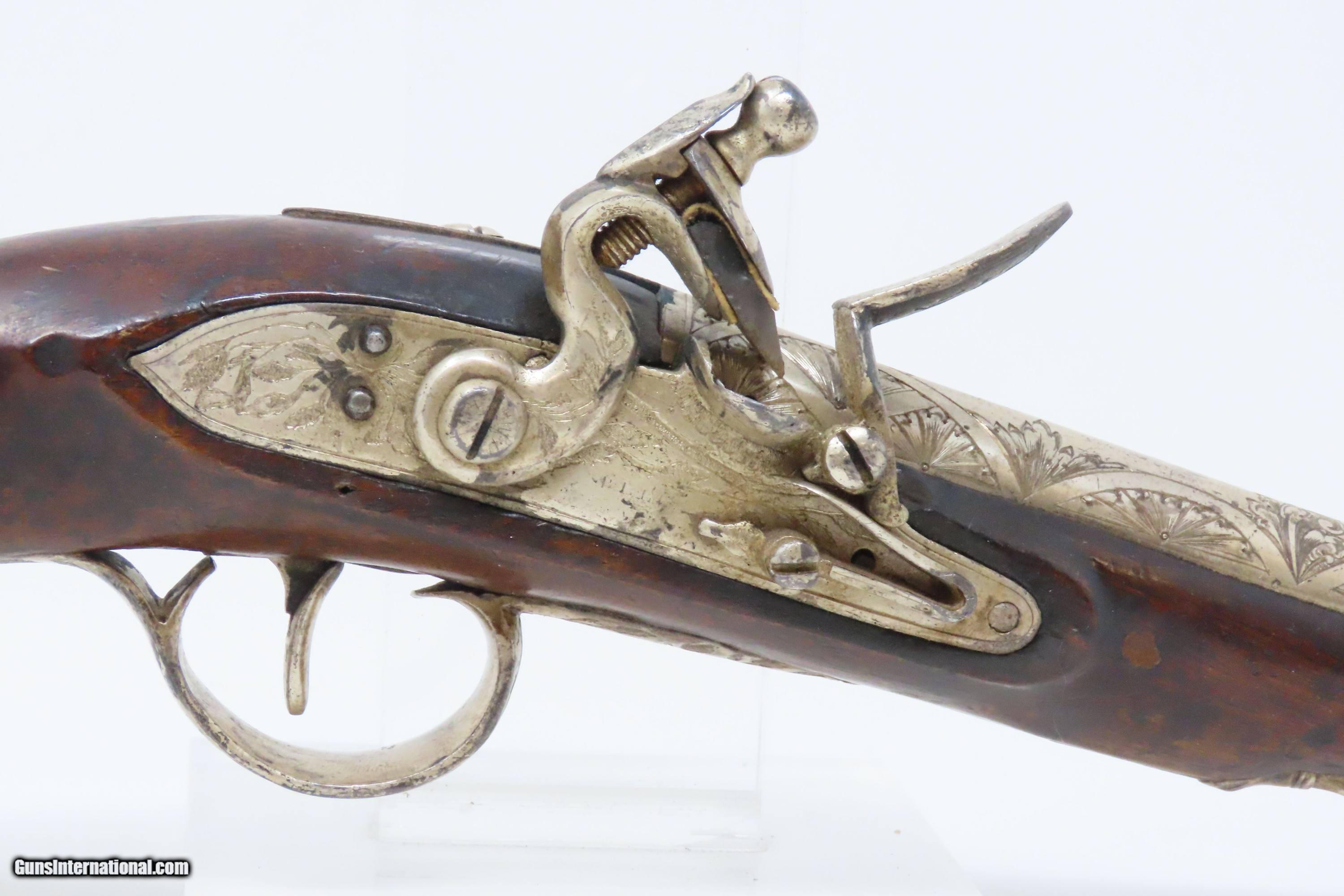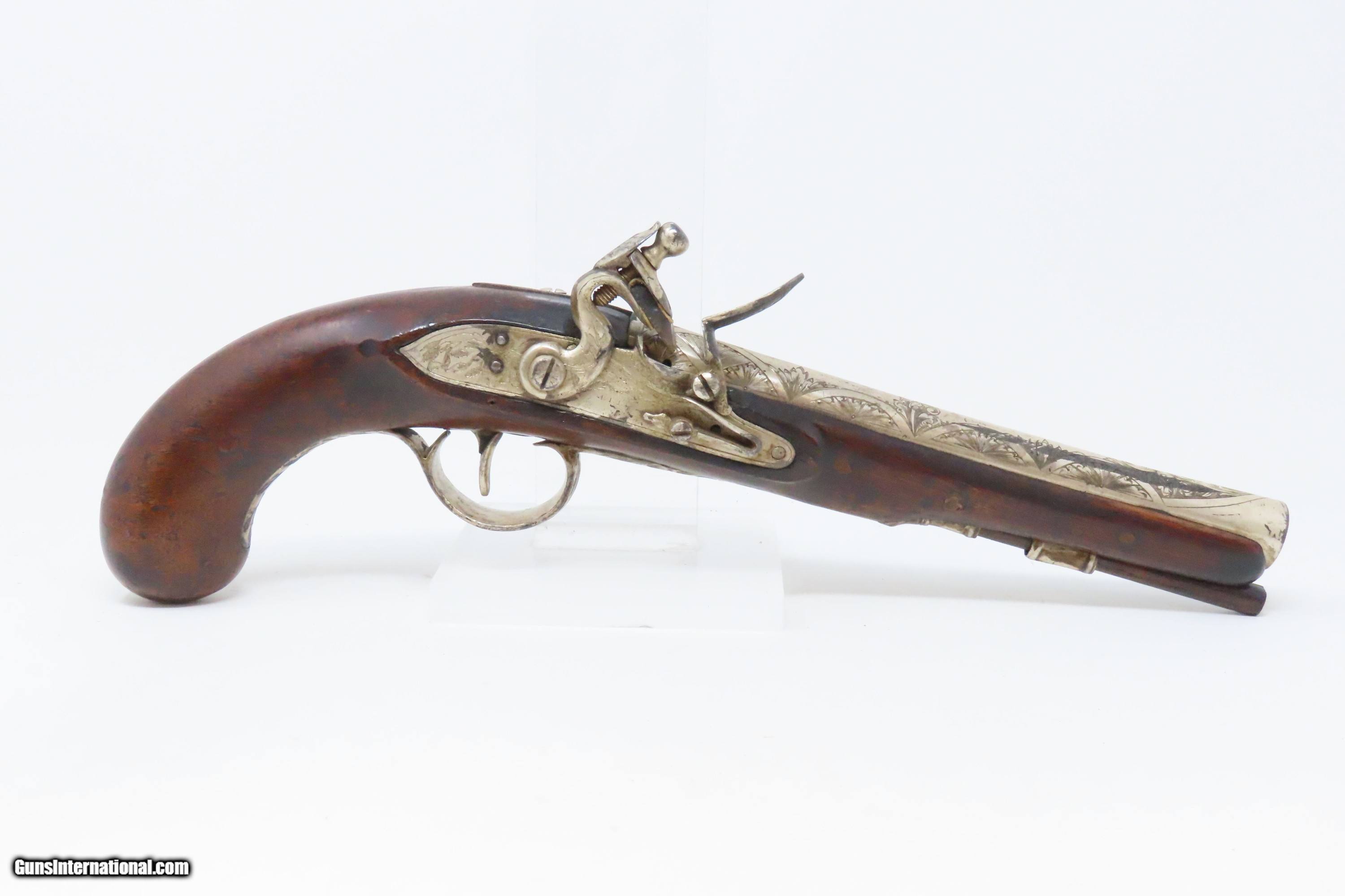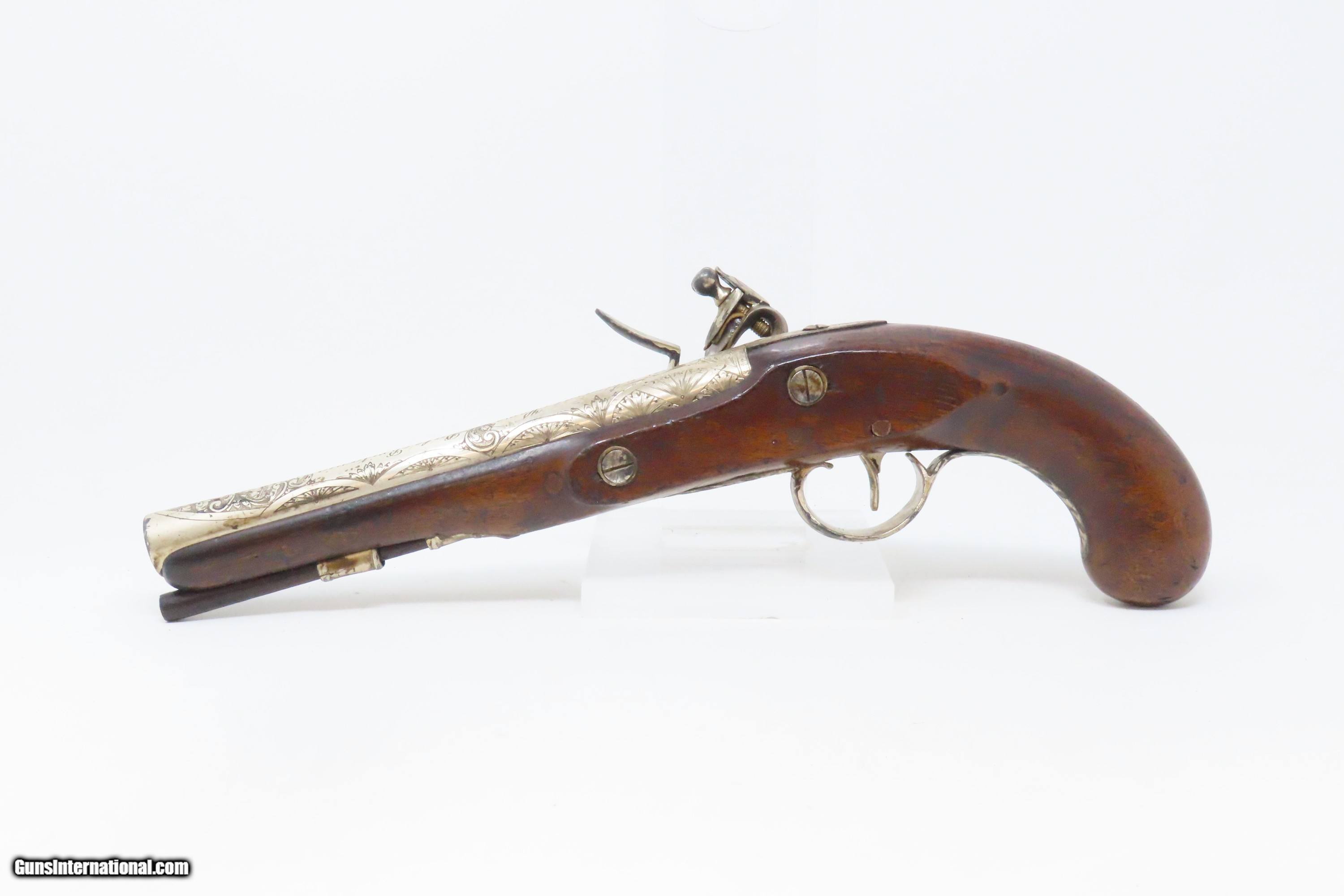 Description: RULE BRITANNIA! ADMIRAL HOWE British FLINTLOCK Pistol by ELLIS .62 Antique Ornately Engraved London Sidearm Late-18th Century Here we present an antique British Flintlock Pistol by Ellis, made circa the late-18th Century in London, England. This piece is beautifully inscribed on the barrel in presentation fashion with “ADMIRAL HOWE” and “RULE BRITANIA”. Admiral Lord Richard Howe (1726-1799) is one of the most recognizable names in British naval history. He entered the navy in 1740, at the age of 14, and was promoted quickly through the ranks, Lieutenant by May 1744 and Commander by November 1745. He spent his first years at sea in the Indies during the War of Austrian Succession, seeing action there. He was wounded in the head fighting with French privateers during the Jacobite Rebellion in 1745. In early 1755 he was in command of HMS Dunkirk at the beginning of the Seven Years’ War (French & Indian War in North America) when he captured the French warship Alcide. He spent most of the subsequent war years in the Channel between Britain and France, becoming known for his amphibious raids on French coasts. By 1770 he was made Rear Admiral and in 1775 Vice Admiral. Much of his career was spent in and around North America, so when the American Revolutionary War began, he is said to have been quite sympathetic to the colonists (and was quite popular among them from the French and Indian War), having personally met Benjamin Franklin, and even secretly met with the rebels to try to smooth out the relationship between them and the Crown—to no avail. As he was presently assigned to the American coast, he had occasion to blockade the coastline as the French were sending supplies and eventually troops. His career continued through the French Revolutionary Wars, during which he was commanding the Channel Fleet when he defeated a numerically superior French fleet of French ships at the Glorious First of June (1794), for which he was awarded the Naval Gold Medal. He became Admiral of the Fleet in 1796. “Rule, Britannia!” comes from a poem of the same title by James Thomson, written in 1740 (the same year Howe entered the British Navy, coincidentally), and set to music by Thomas Arne. It is a patriotic poem and song, and became a flag-waving quote, especially endearing to the Royal Navy due to the refrain: “Rule, Britannia! rule the waves: Britons never will be slaves.” In addition to the inscriptions, this pistol’s barrel has been engraved with semi-circular fans at the border of the forestock along with profuse floral scrolls at the muzzle, middle, and breech. “LONDON” is stamped over the breech in an oval. The barrel tang, lock, and trigger guard are engraved with a sprawling viney floral motif. The lock plate is faintly stamped “ELLIS”. All the metal hardware has been plated in silver, to include parts of the gun that would normally receive high wear such as the frizzen and even the interior of the bore to some extent. The overall condition is near fine. Excellent action. The bore is smooth and dusty. The stock shows use and remains solid; there are patches over the holes where pins hold the barrel, ramrod tubes and trigger in place. There is a small graft repair along the right side of the muzzle and two minor splits in the same area on the left side. This is a gorgeous piece of hardware turned art and will be fitting on display in a collection interested in the British Navy, Admiral Howe, or the American War for Independence. RULE BRITANNIA! Own the original! This is a legitimate antique and not a reproduction. Barrel is 7-7/8 inches. Caliber: .62 Flintlock Overall condition as seen in photos. Very Fast. Very Safe. FREE SHIPPING WORLDWIDE. Delivered directly to your door by express mail! Guaranteed AUTHENTIC & Includes CERTIFICATE OF AUTHENTICITY. ancestryguns $6,000 #227912 Antique: Yes Price: $6,000.00 Buy Now Pay with
