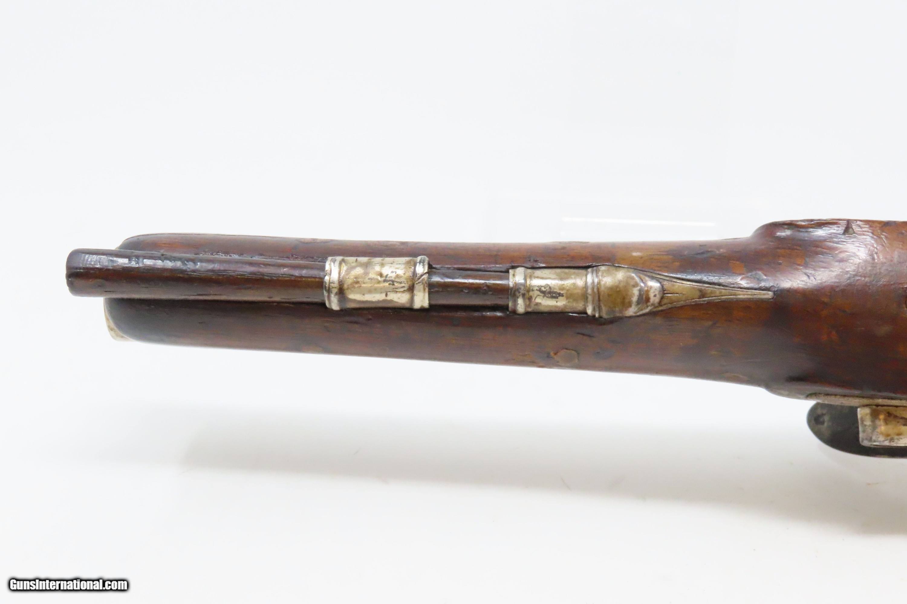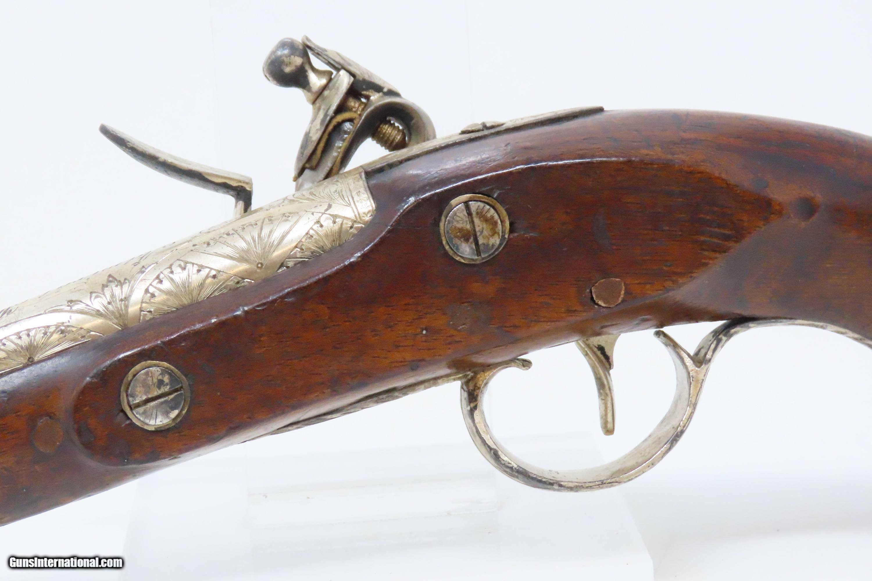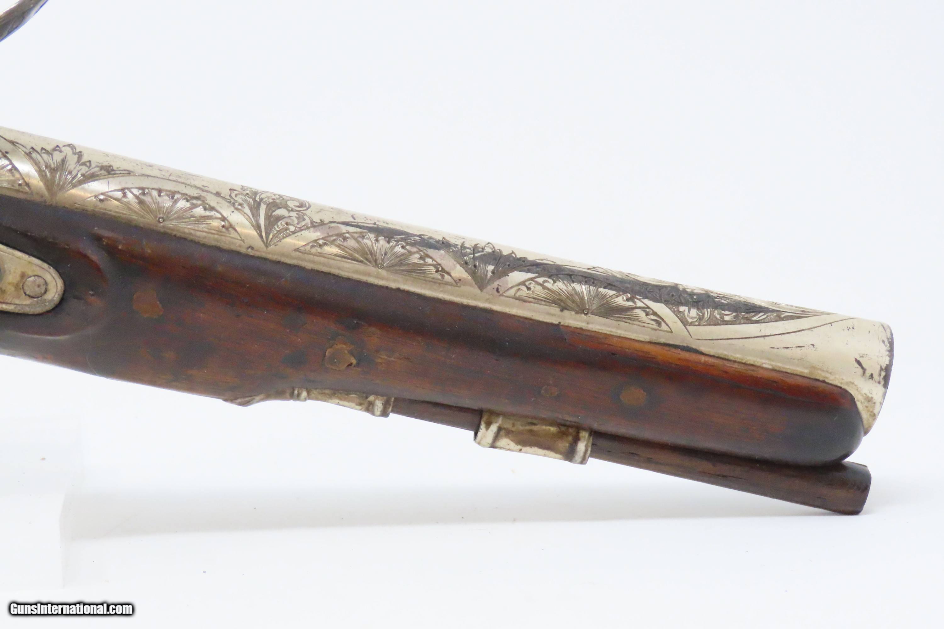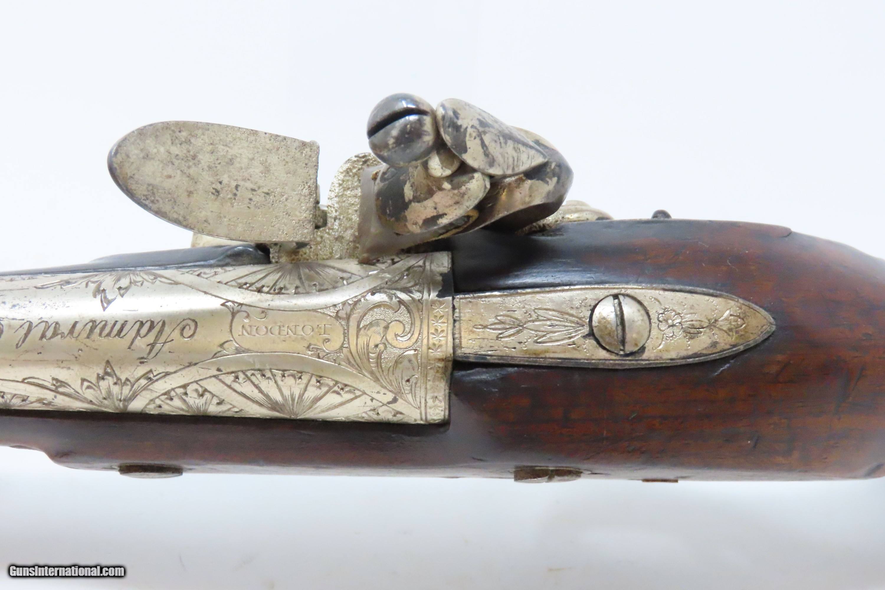 Description: RULE BRITANNIA! ADMIRAL HOWE British FLINTLOCK Pistol by ELLIS .62 Antique Ornately Engraved London Sidearm Late-18th Century Here we present an antique British Flintlock Pistol by Ellis, made circa the late-18th Century in London, England. This piece is beautifully inscribed on the barrel in presentation fashion with “ADMIRAL HOWE” and “RULE BRITANIA”. Admiral Lord Richard Howe (1726-1799) is one of the most recognizable names in British naval history. He entered the navy in 1740, at the age of 14, and was promoted quickly through the ranks, Lieutenant by May 1744 and Commander by November 1745. He spent his first years at sea in the Indies during the War of Austrian Succession, seeing action there. He was wounded in the head fighting with French privateers during the Jacobite Rebellion in 1745. In early 1755 he was in command of HMS Dunkirk at the beginning of the Seven Years’ War (French & Indian War in North America) when he captured the French warship Alcide. He spent most of the subsequent war years in the Channel between Britain and France, becoming known for his amphibious raids on French coasts. By 1770 he was made Rear Admiral and in 1775 Vice Admiral. Much of his career was spent in and around North America, so when the American Revolutionary War began, he is said to have been quite sympathetic to the colonists (and was quite popular among them from the French and Indian War), having personally met Benjamin Franklin, and even secretly met with the rebels to try to smooth out the relationship between them and the Crown—to no avail. As he was presently assigned to the American coast, he had occasion to blockade the coastline as the French were sending supplies and eventually troops. His career continued through the French Revolutionary Wars, during which he was commanding the Channel Fleet when he defeated a numerically superior French fleet of French ships at the Glorious First of June (1794), for which he was awarded the Naval Gold Medal. He became Admiral of the Fleet in 1796. “Rule, Britannia!” comes from a poem of the same title by James Thomson, written in 1740 (the same year Howe entered the British Navy, coincidentally), and set to music by Thomas Arne. It is a patriotic poem and song, and became a flag-waving quote, especially endearing to the Royal Navy due to the refrain: “Rule, Britannia! rule the waves: Britons never will be slaves.” In addition to the inscriptions, this pistol’s barrel has been engraved with semi-circular fans at the border of the forestock along with profuse floral scrolls at the muzzle, middle, and breech. “LONDON” is stamped over the breech in an oval. The barrel tang, lock, and trigger guard are engraved with a sprawling viney floral motif. The lock plate is faintly stamped “ELLIS”. All the metal hardware has been plated in silver, to include parts of the gun that would normally receive high wear such as the frizzen and even the interior of the bore to some extent. The overall condition is near fine. Excellent action. The bore is smooth and dusty. The stock shows use and remains solid; there are patches over the holes where pins hold the barrel, ramrod tubes and trigger in place. There is a small graft repair along the right side of the muzzle and two minor splits in the same area on the left side. This is a gorgeous piece of hardware turned art and will be fitting on display in a collection interested in the British Navy, Admiral Howe, or the American War for Independence. RULE BRITANNIA! Own the original! This is a legitimate antique and not a reproduction. Barrel is 7-7/8 inches. Caliber: .62 Flintlock Overall condition as seen in photos. Very Fast. Very Safe. FREE SHIPPING WORLDWIDE. Delivered directly to your door by express mail! Guaranteed AUTHENTIC & Includes CERTIFICATE OF AUTHENTICITY. ancestryguns $6,000 #227912 Antique: Yes Price: $6,000.00 Buy Now Pay with