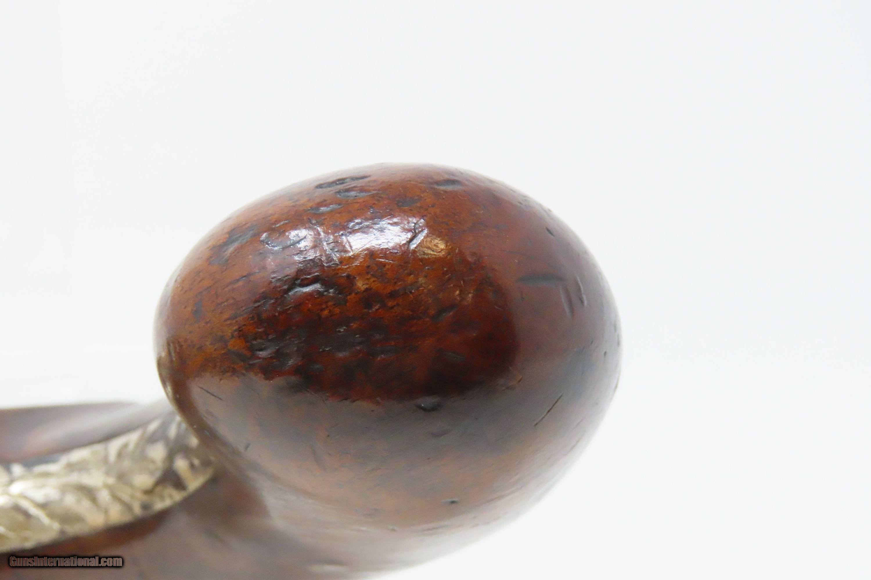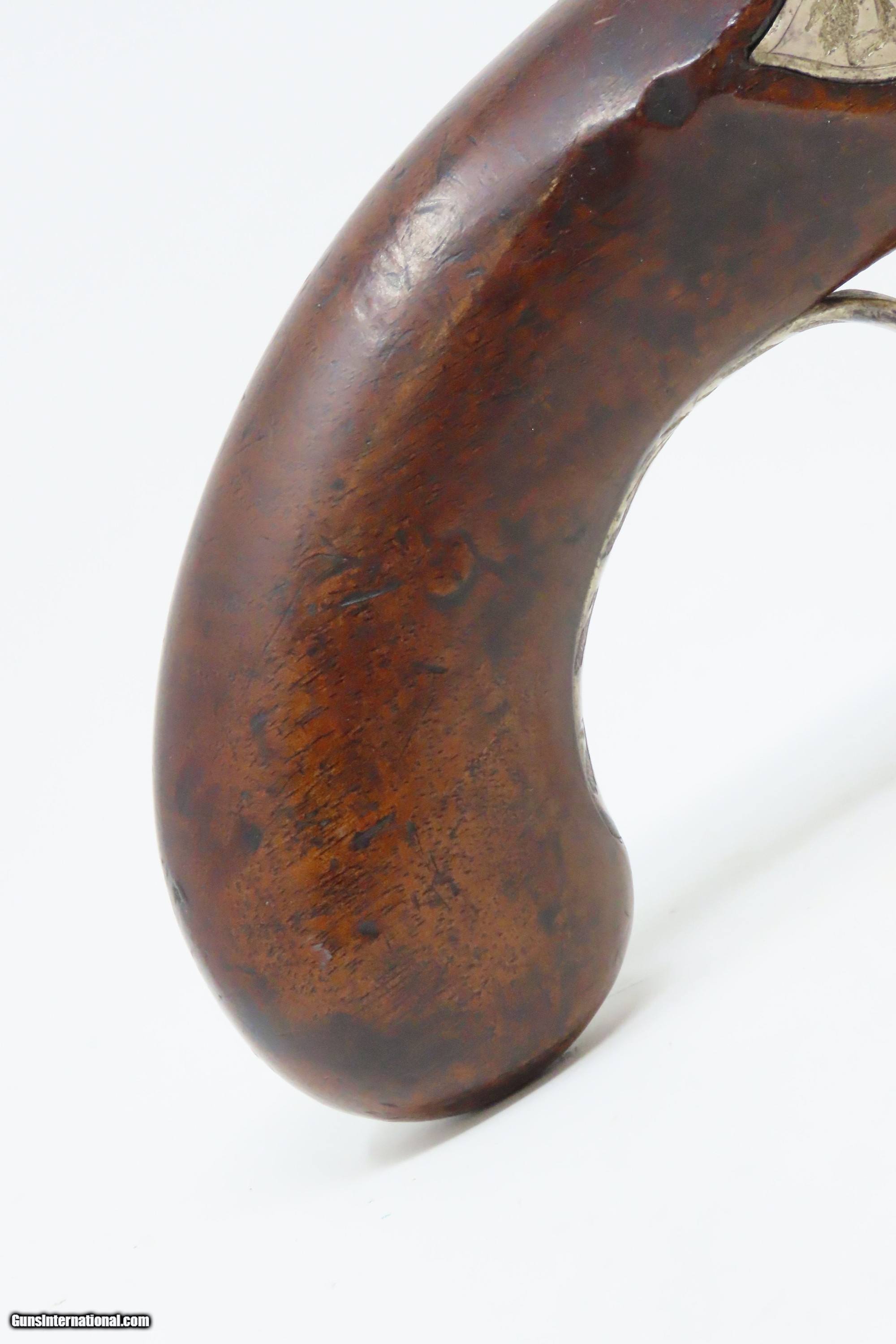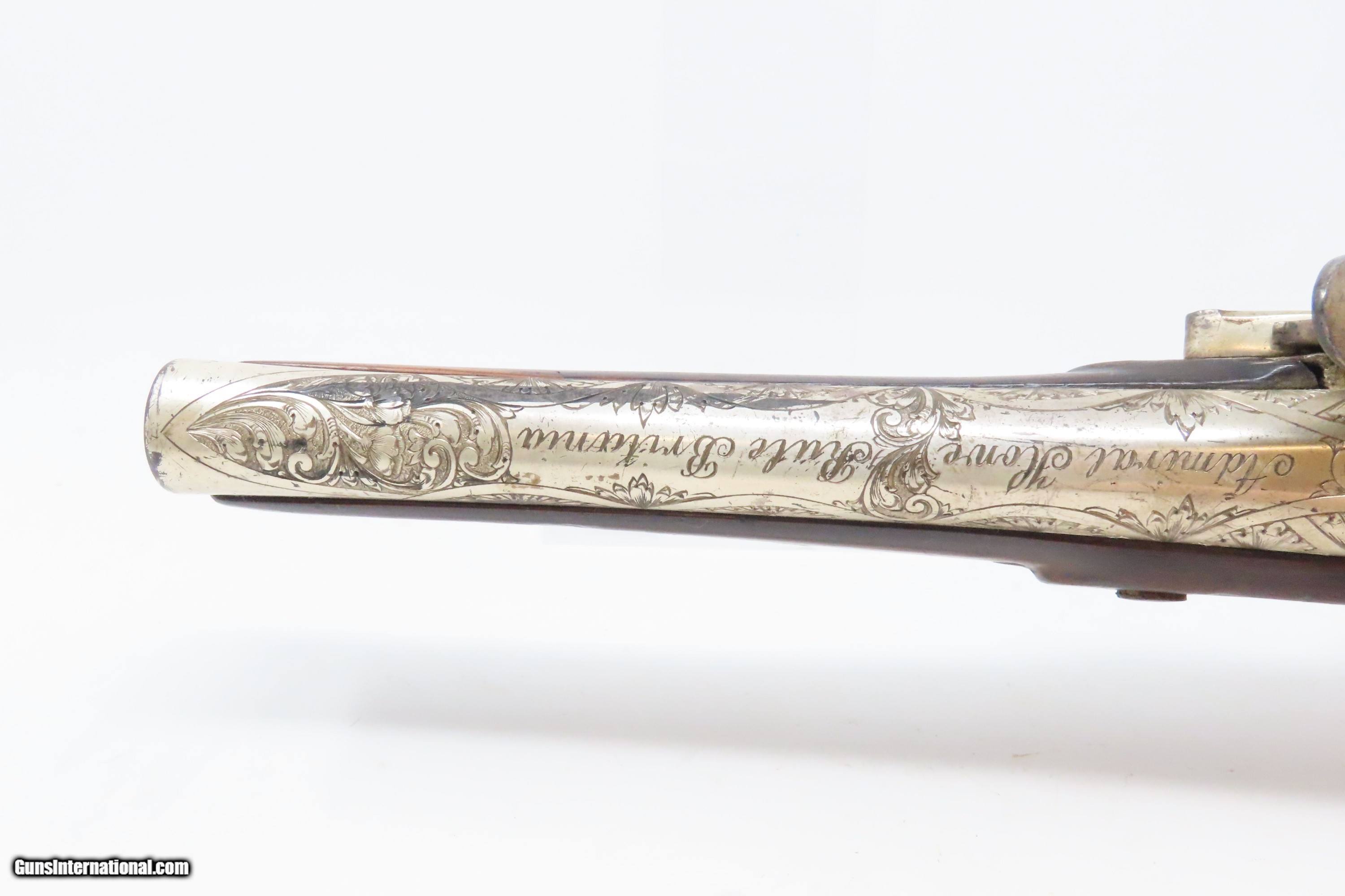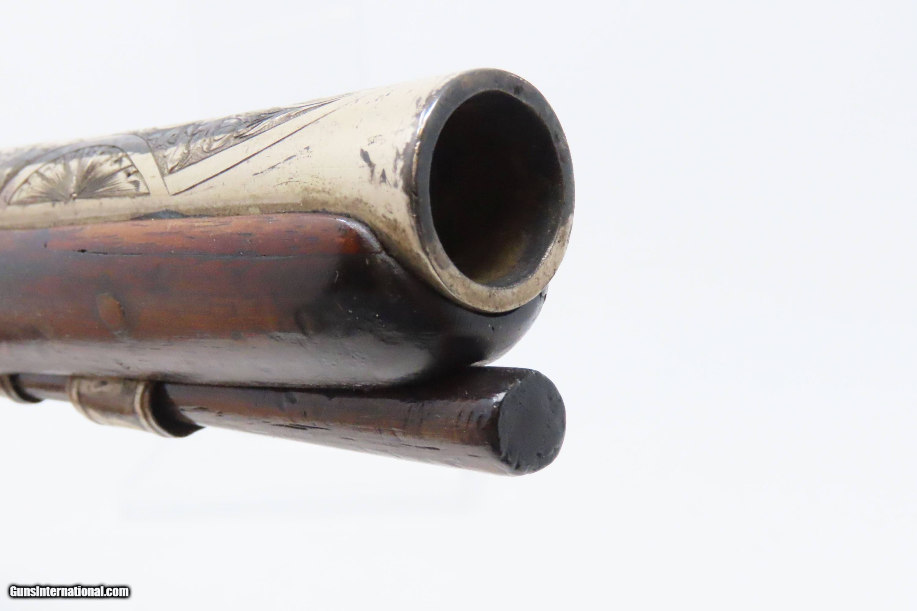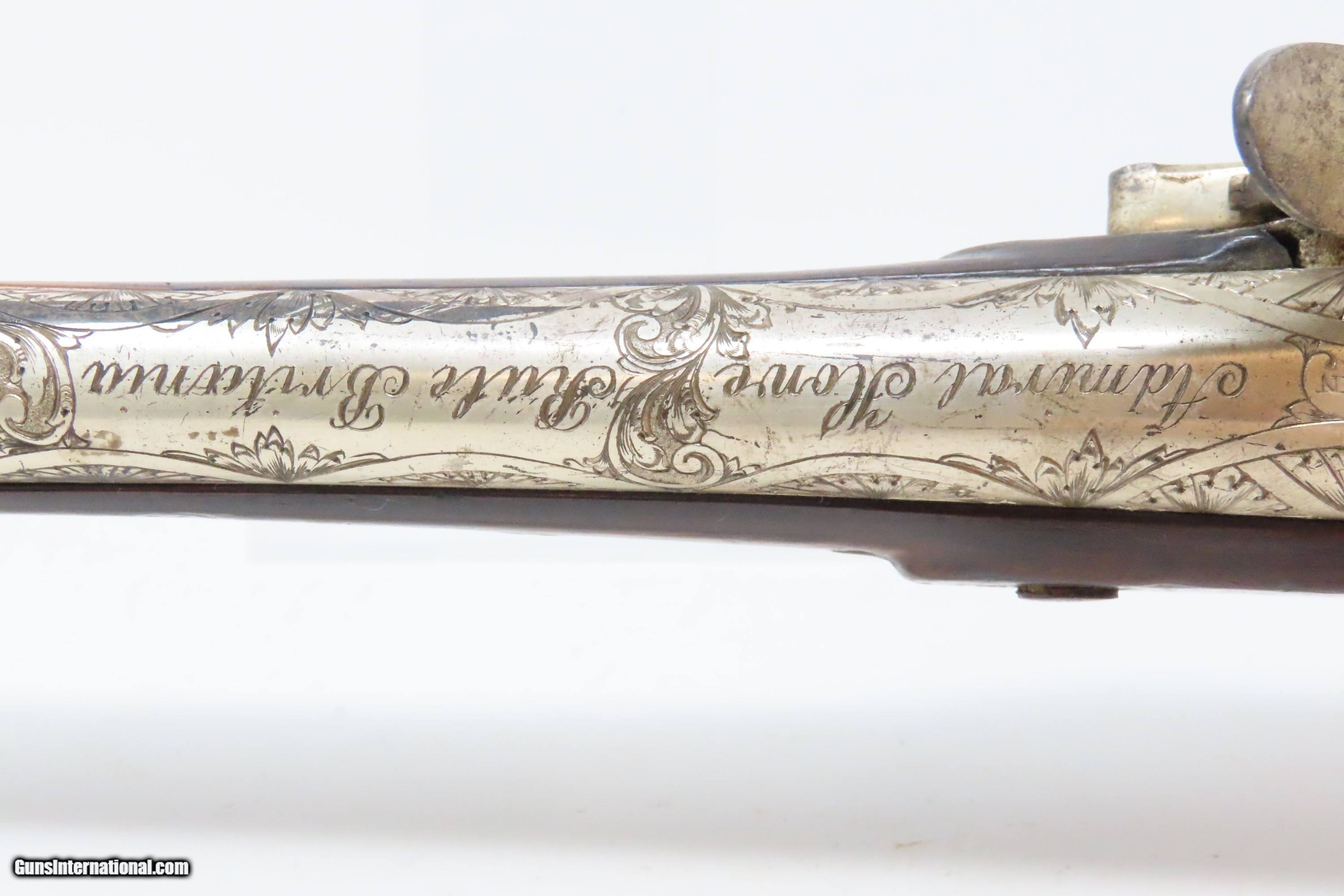 Description: RULE BRITANNIA! ADMIRAL HOWE British FLINTLOCK Pistol by ELLIS .62 Antique Ornately Engraved London Sidearm Late-18th Century Here we present an antique British Flintlock Pistol by Ellis, made circa the late-18th Century in London, England. This piece is beautifully inscribed on the barrel in presentation fashion with “ADMIRAL HOWE” and “RULE BRITANIA”. Admiral Lord Richard Howe (1726-1799) is one of the most recognizable names in British naval history. He entered the navy in 1740, at the age of 14, and was promoted quickly through the ranks, Lieutenant by May 1744 and Commander by November 1745. He spent his first years at sea in the Indies during the War of Austrian Succession, seeing action there. He was wounded in the head fighting with French privateers during the Jacobite Rebellion in 1745. In early 1755 he was in command of HMS Dunkirk at the beginning of the Seven Years’ War (French & Indian War in North America) when he captured the French warship Alcide. He spent most of the subsequent war years in the Channel between Britain and France, becoming known for his amphibious raids on French coasts. By 1770 he was made Rear Admiral and in 1775 Vice Admiral. Much of his career was spent in and around North America, so when the American Revolutionary War began, he is said to have been quite sympathetic to the colonists (and was quite popular among them from the French and Indian War), having personally met Benjamin Franklin, and even secretly met with the rebels to try to smooth out the relationship between them and the Crown—to no avail. As he was presently assigned to the American coast, he had occasion to blockade the coastline as the French were sending supplies and eventually troops. His career continued through the French Revolutionary Wars, during which he was commanding the Channel Fleet when he defeated a numerically superior French fleet of French ships at the Glorious First of June (1794), for which he was awarded the Naval Gold Medal. He became Admiral of the Fleet in 1796. “Rule, Britannia!” comes from a poem of the same title by James Thomson, written in 1740 (the same year Howe entered the British Navy, coincidentally), and set to music by Thomas Arne. It is a patriotic poem and song, and became a flag-waving quote, especially endearing to the Royal Navy due to the refrain: “Rule, Britannia! rule the waves: Britons never will be slaves.” In addition to the inscriptions, this pistol’s barrel has been engraved with semi-circular fans at the border of the forestock along with profuse floral scrolls at the muzzle, middle, and breech. “LONDON” is stamped over the breech in an oval. The barrel tang, lock, and trigger guard are engraved with a sprawling viney floral motif. The lock plate is faintly stamped “ELLIS”. All the metal hardware has been plated in silver, to include parts of the gun that would normally receive high wear such as the frizzen and even the interior of the bore to some extent. The overall condition is near fine. Excellent action. The bore is smooth and dusty. The stock shows use and remains solid; there are patches over the holes where pins hold the barrel, ramrod tubes and trigger in place. There is a small graft repair along the right side of the muzzle and two minor splits in the same area on the left side. This is a gorgeous piece of hardware turned art and will be fitting on display in a collection interested in the British Navy, Admiral Howe, or the American War for Independence. RULE BRITANNIA! Own the original! This is a legitimate antique and not a reproduction. Barrel is 7-7/8 inches. Caliber: .62 Flintlock Overall condition as seen in photos. Very Fast. Very Safe. FREE SHIPPING WORLDWIDE. Delivered directly to your door by express mail! Guaranteed AUTHENTIC & Includes CERTIFICATE OF AUTHENTICITY. ancestryguns $6,000 #227912 Antique: Yes Price: $6,000.00 Buy Now Pay with