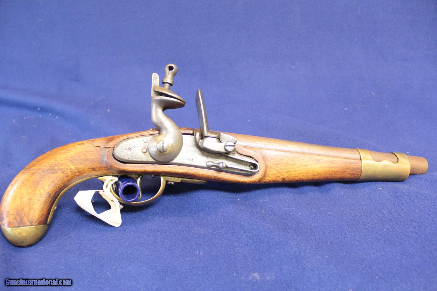 Description: Early 1800's vintage of approximatly 70 cal Single shot flint lock. 11.5" barrel brass fitings in cluding nose cap. It has the number 952 in the lock plate and has a Russian or Polish double headed eagle stamp. There is a splitt out that has been reglued on the wood (should be re repaired in my opinion) Very large single shot pistol. Lock functions properly. A very intersting gun that i can find very little information about. SOLD Antique: Yes |