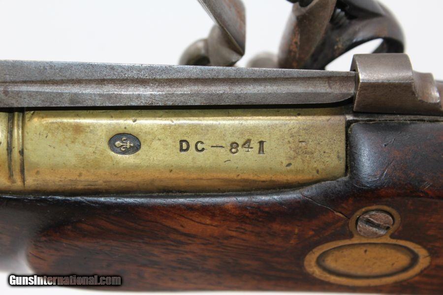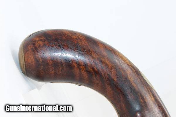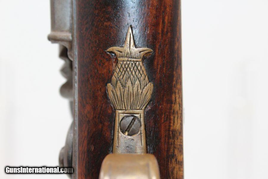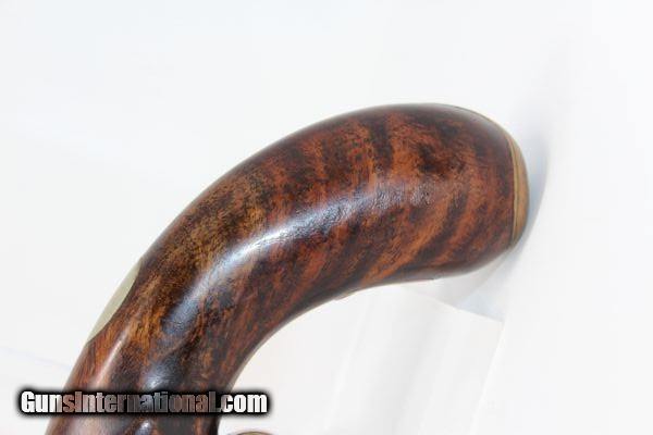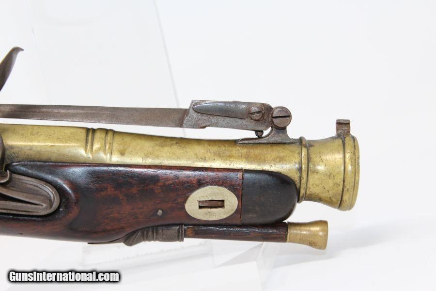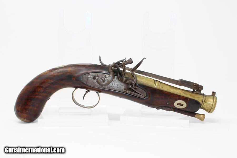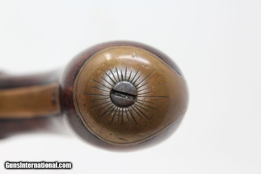 Description: RYAN Irish Flintlock BLUNDERBUSS Pistol w BAYONET Unique & Rare Brass Barreled Pistol w Spike Bayonet! Here we present an antique Brass Blunderbuss Flintlock Pistol with a Spring-Loaded Spike Bayonet by G. Ryan, made circa the late-18th Century in Ireland. This is one of the true rarities of the flintlock period, a blunderbuss pistol with an integral bayonet. This would have been a formidable weapon for defense with a massive blast from an .81 caliber bore. This piece bears the name of the maker, a fleur de lys (there is also a similar symbol that represents the Prince of Wales with 3 feathers in this configuration), and a Dublin Constabulary registration number, this last from the 20th Century. The lock, trigger guard and pommel bear light engraving. This would have been something that might have been kept in or on a carriage, in a house, or even on one’s person in the late-1700s. The overall condition is fine. The brass has aged with a mellow patina. The markings are clear. The stock is smooth and solid. The bore is smooth and clean. The bayonet mechanism works very well. Be careful as it really comes out fast! The action of the pistol’s lock is excellent, strong and crisp. Here is a fantastic example of a brass barreled blunderbuss with a flip out bayonet! Own the original! This is a legitimate antique and not a reproduction. Barrel is 6 inches. Caliber: .81 Overall condition as seen in photos. Very Fast. Very Safe. FREE SHIPPING WORLDWIDE. Delivered directly to your door by express mail! Guaranteed AUTHENTIC & Includes CERTIFICATE OF AUTHENTICITY. ancestryguns $4215 #8413 SOLD Antique: Yes |