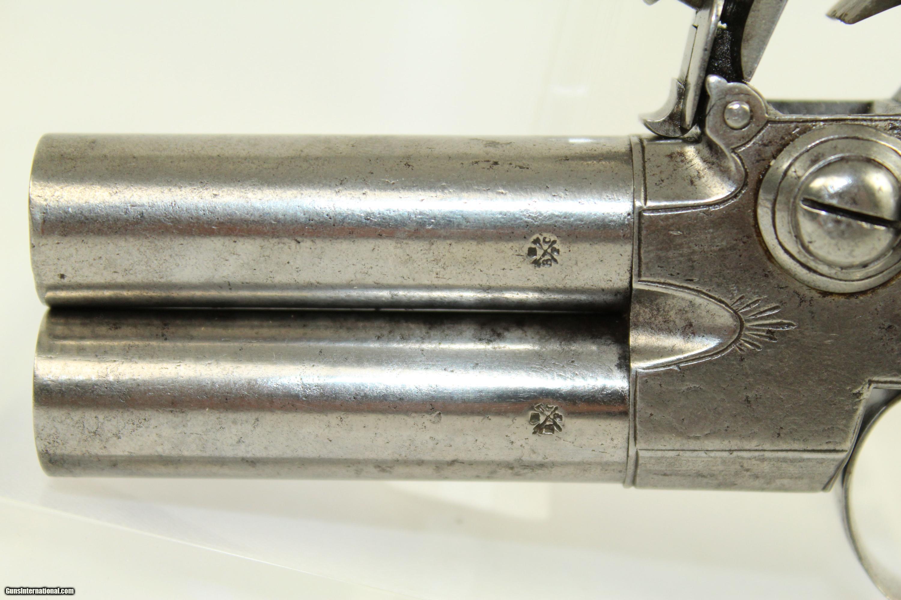 Description: SCARCE Antique BRITISH Tap Action Flintlock Pistol Made by WILLIAM SIDDONS of Birmingham, England Here we present an antique Tap Action Flintlock Pistol, made circa 1820 by William Siddons in Birmingham, England. This pistol was designed for close quarters self-defense in early 19th Century England. An obvious improvement over single shot pistols of the time, and perhaps even over double barreled pistols with multiple hammers and triggers, the unique feature on this pistol is the selector on the left side of the frame. With both barrels are charged and primed, the first barrel can be fired, the selector pushed down 90 degrees, opening the breech to the second barrel. This pistol also has turn-off barrels, making loading a larger ball easier than ramming one down the muzzle. This latter feature also negated the use of a ramrod and helped create a better gas seal, making the short barrel and single shot as efficient and effective as possible. This specimen features light engraving on the frame. The name of the maker “SIDDONS” is marked on the left side and “LONDON” on the right. The selector switch for the tap action has a round wheel with “spokes” engraved on, that turns when the switch is turned. The barrels are numbered to the frame. Each barrel and the frame have Birmingham proof marks. The wood grip has a small initial placard and checkering on the back. The overall condition of this pistol is very good. The metal surfaces are smooth and were left in the white. The markings are engraving are clear and legible. The Grips and bores are in very good condition. The action is excellent. Own the original! This is a legitimate antique and not a reproduction. Compare to $1850! Barrel is octagonal and 2-1/8 inches in length. Caliber: .42 Bore is in very good condition and the action is fine. Overall condition as seen in photos. Here is a very nice and interesting English Tap Action Flintlock! Very Fast. Very Safe. FREE SHIPPING WORLDWIDE. Delivered directly to your door by express mail! Guaranteed AUTHENTIC & Includes CERTIFICATE OF AUTHENTICITY. ancestryguns $1150 #21782 SOLD Antique: Yes |